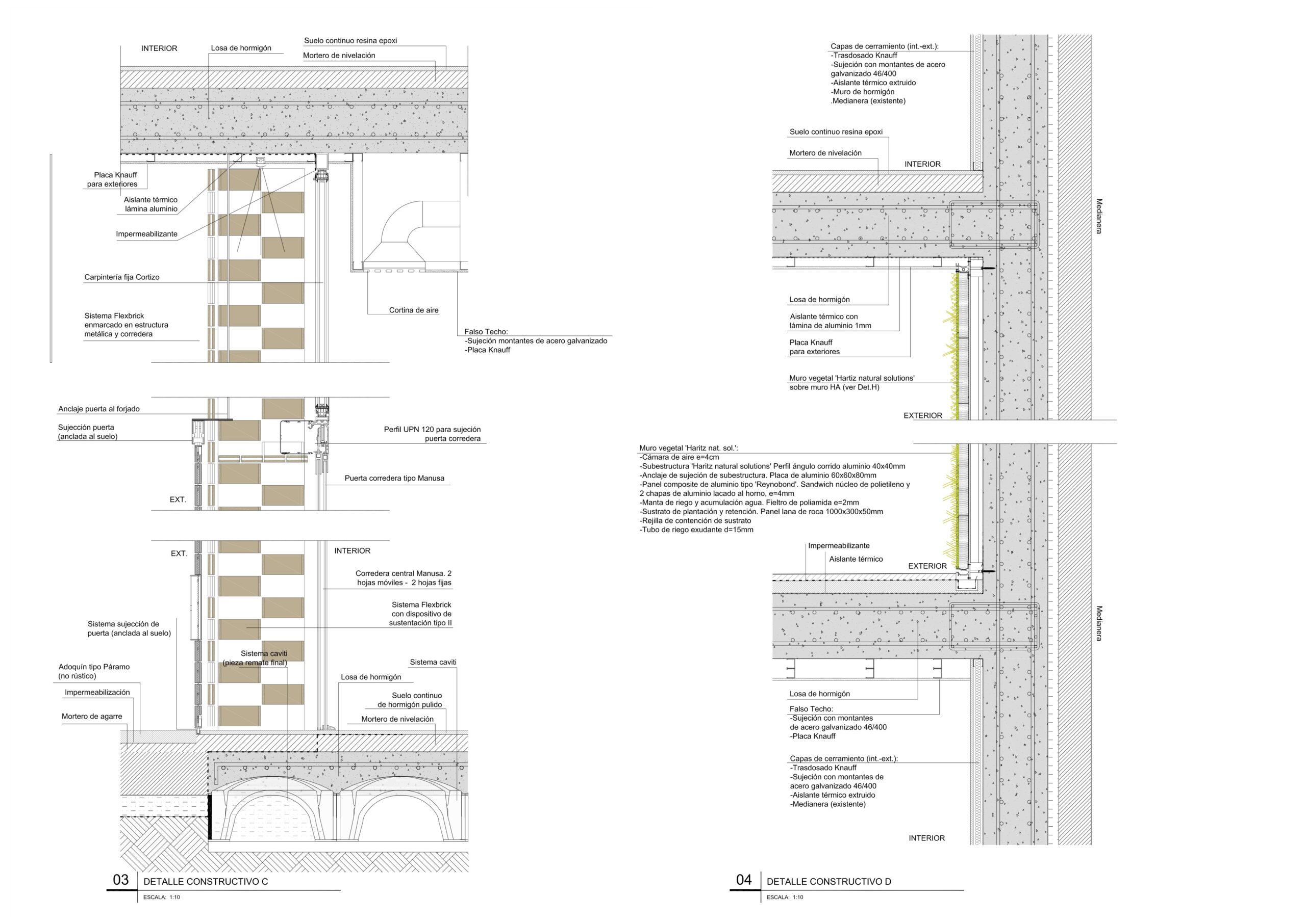 La fachada cerámica se divide en módulos de 1.00m. y 0.75m. que se combinan formando el dibujo exterior que contemporaniza los secaderos de tabaco tradicionales. La malla cerámica se sustenta en unas guías superiores atornilladas al forjado y anclajes puntuales de retención contra el viento en la parte inferior.