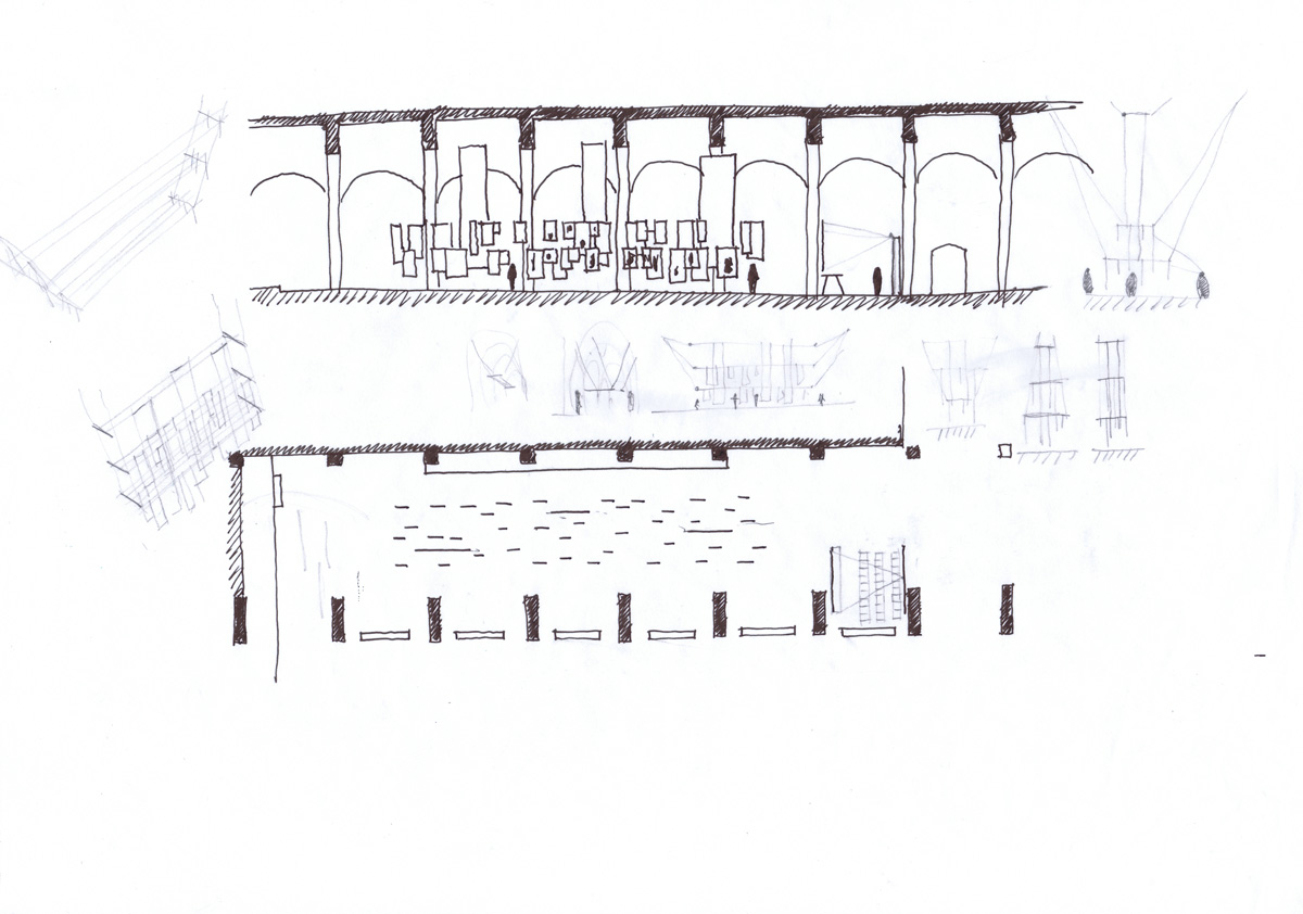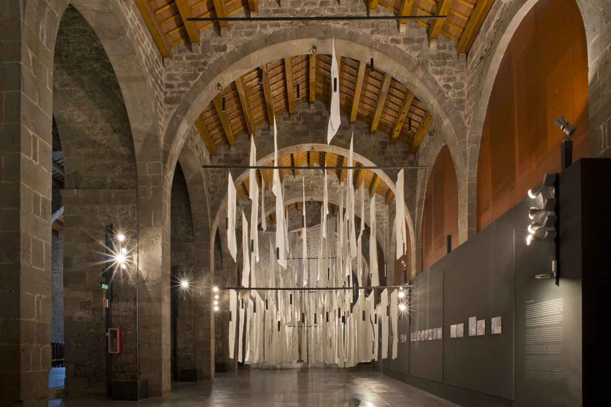 de la nave de Les Drassanes, por sus dimensiones y escala, su altura y longitud, permite trabajar tanto en el plano vertical como en el horizontal, llenando el espacio.