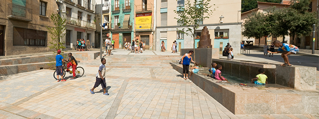 L’ampliació de la plaça Campdenmàs, al barri vell d’Olot, estableix una relació de vis a vis amb la placeta històrica. Els dos espais es relacionen a partir de la graderia, l’arbre i la font per on circula aigua remorosa entre una escultura existent i una cisterna medieval recuperada. Aquest centre de gravetat de forma còncava acull l’activitat d’estada, mentre que la resta d’espai es manté buit per rebre qualsevol tipus d’acte públic. El treball topogràfic busca un equilibri entre la suavitat del pendent, el lligam amb els carrers inferiors i l’escorrentia superficial fins al punt baix.