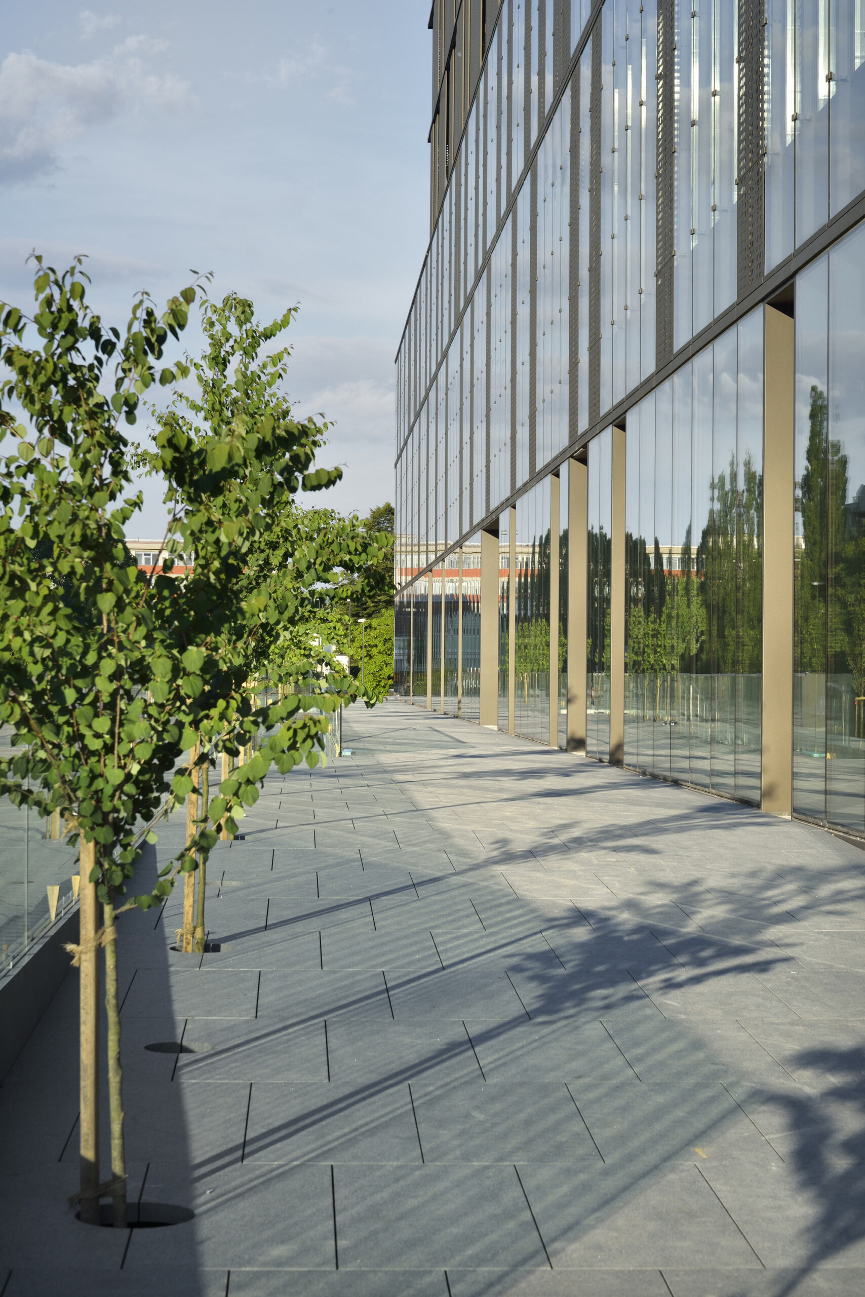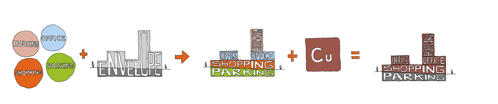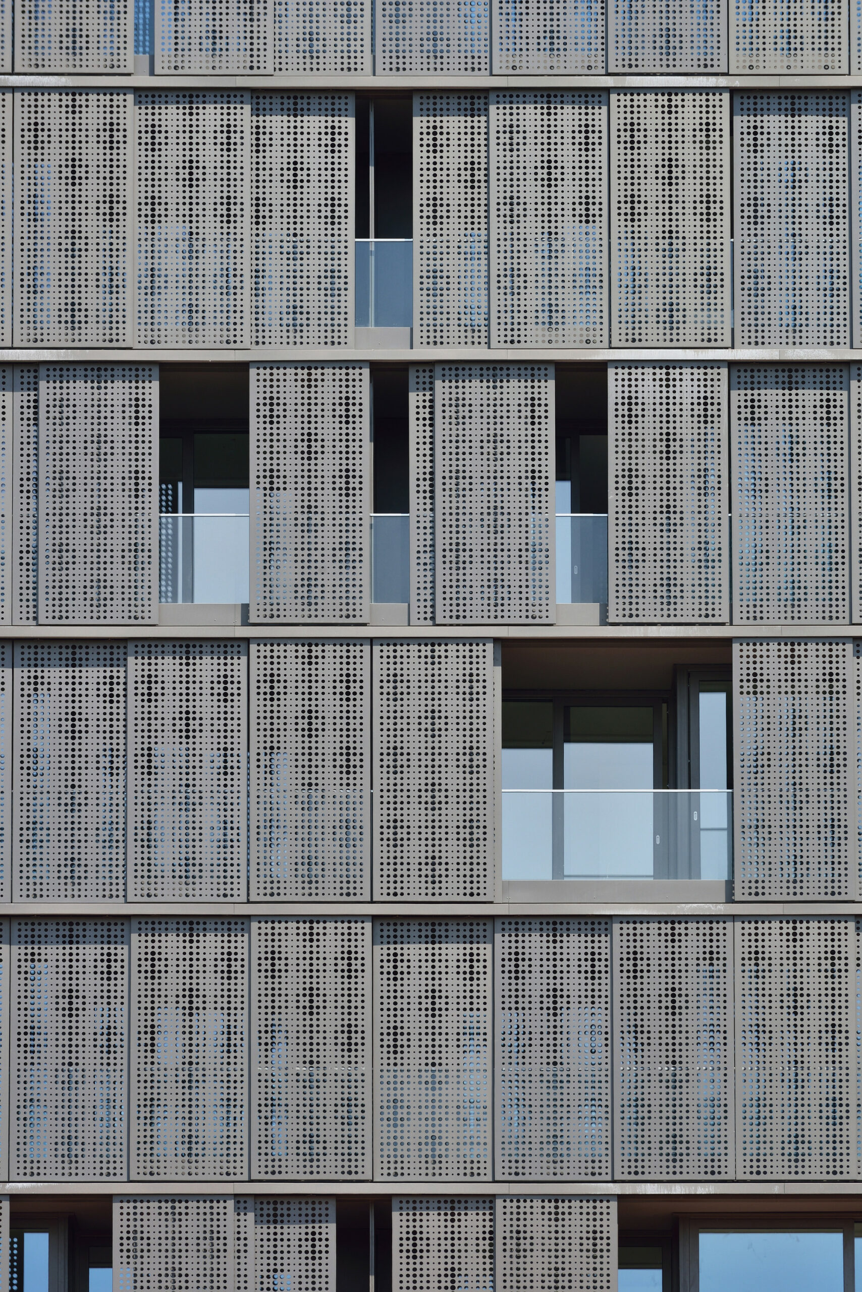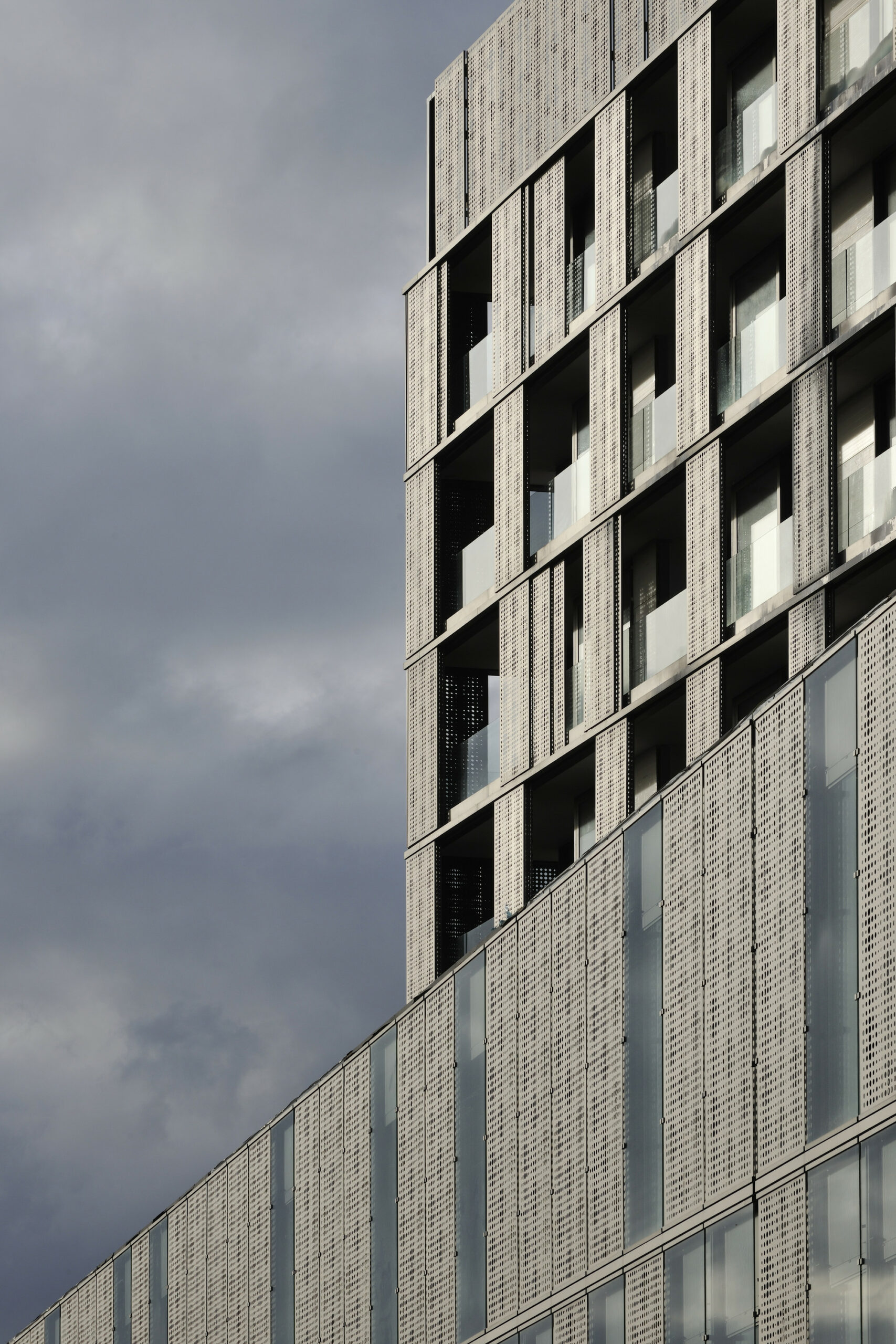 Concebido dentro de los límites estrictos del plan maestro, el cual prescribe el contorno exacto de todo el complejo – un “zócalo” público de dos pisos, losa de apartamentos de ocho pisos y un ‘rascacielos’ de 20 pisos – la idea del proyecto es tratar de unificar todas las diferentes demandas programáticas y volumétricas en un gesto de un solo material: ‘piel’ de color bronce / cobre perforada que aparece en diferentes formas a lo largo del proyecto.