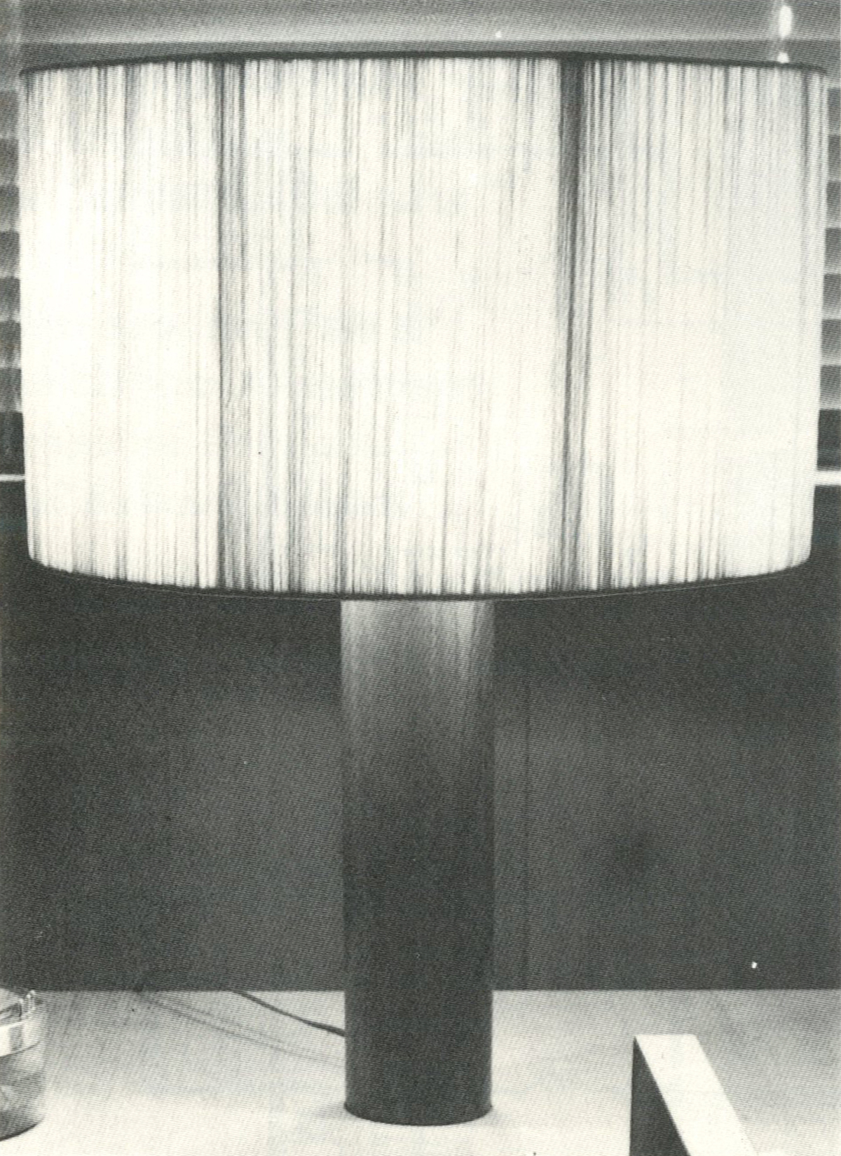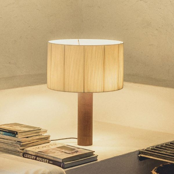 Madera, alambre y tela. Formado por una base cilíndrica de madera (de cedro o de embero), que a su vez constituye el soporte para la bombilla y la pantalla. Este tipo de lámpara aparece como madera común en dibujos de casi todos los arquitectos de la época. Moragas la dimensiona y la convierte por primera vez en propuesta real, aunque existían otras versiones -copiadas o análogas- disponibles en el mercado.