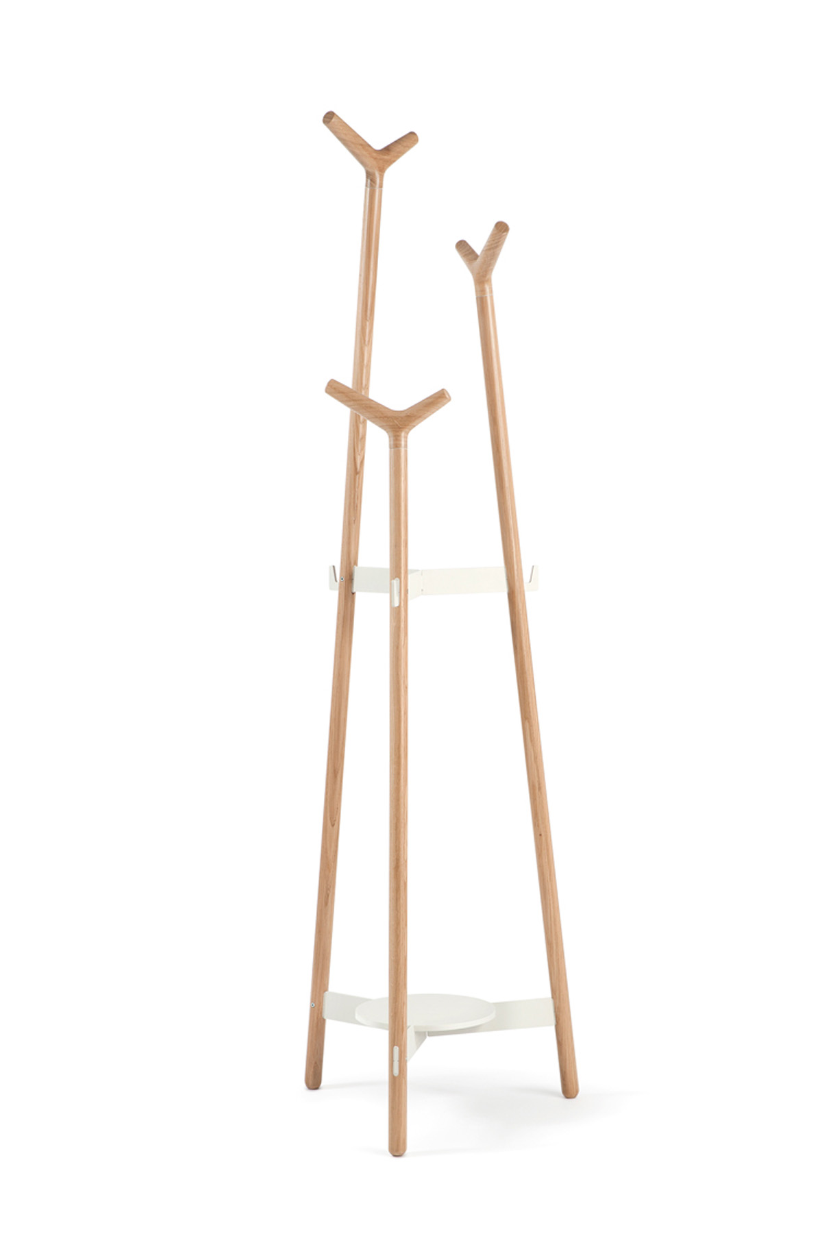 Perchero de pie de madera maciza de haya compuesto por 3 fustes de medidas distintas, que permiten optimizar la capacidad del perchero y además proporcionan comodidad al usuario. Dos crucetas metálicas sujetan la estructura (o colgador). La pieza superior, que dispone de unas terminaciones en forma gancho, está situada a una altura fácil para niños y práctica para colgar complementos.