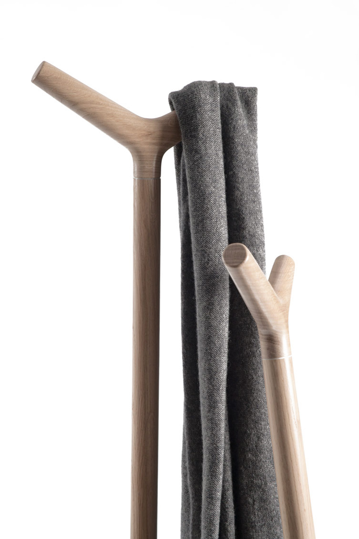 FORC está formado por bastones de madera maciza de haya de tres alturas distintas, permitiendo a los más pequeños colgar el abrigo sin pedir ayuda. La pieza de hierro que mantiene sujeta la estructura facilita colgar un paraguas en el interior o un bolso en el exterior, mediante terminaciones en forma de gancho. En su conjunto se consigue un colgador no solo estético, sino funcional.