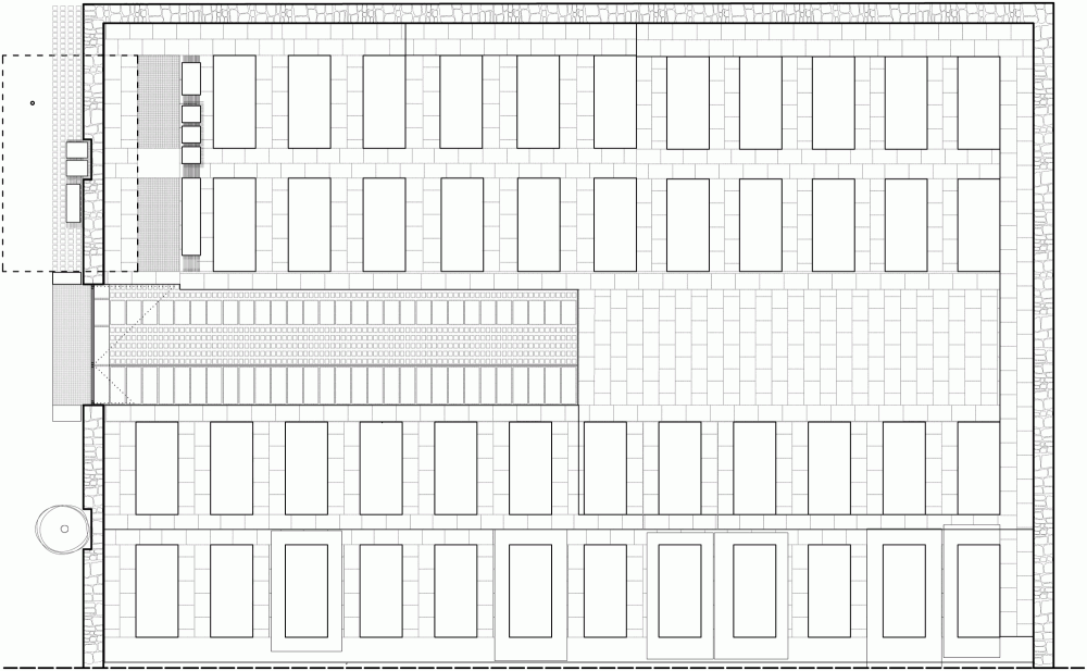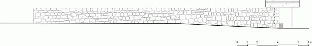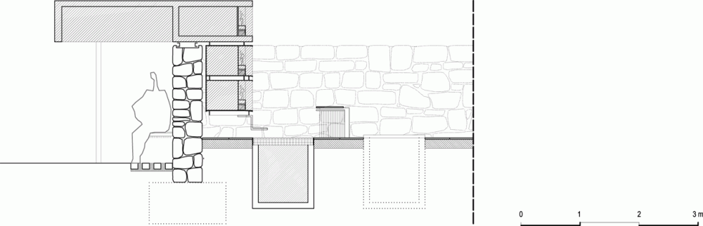 Con la propuesta, además de responder a la necesidad de ubicar veintiún columbarios, se ofrece una zona a cubierto que marca el acceso y un lugar de espera, a modo de refugio, en caso de lluvia, nieve o sol excesivo. Se ejecuta un volumen de hormigón blanco encofrado a tablilla sobre el muro de granito que arranca desde el interior y sobresale al exterior a modo de pérgola, ubicando la primera fila de 7 columbarios.
