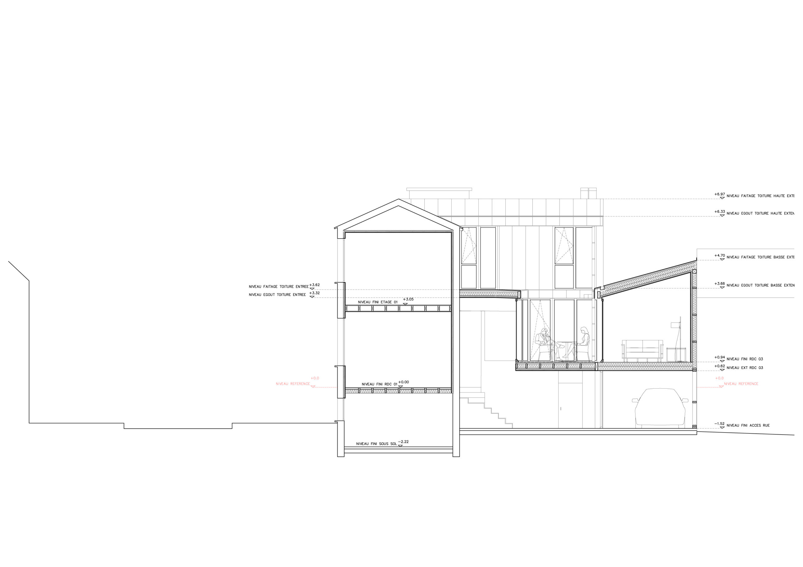 El proyecto propone conservar el volumen principal de la construcción para preservar los trazos históricos que desaparecen paulatinamente del barrio. La demolición del volumen de la cocina y del garaje permiten ampliar la vivienda desarrollando una nueva implantación en forma de « U » alrededor de una terraza elevada. De esta manera, la nueva construcción se separa de la existente realzando su volumen, al mismo tiempo que consolida la fachada de la calle secundaria.