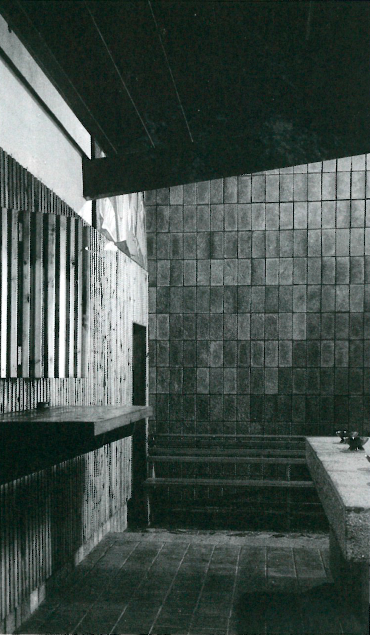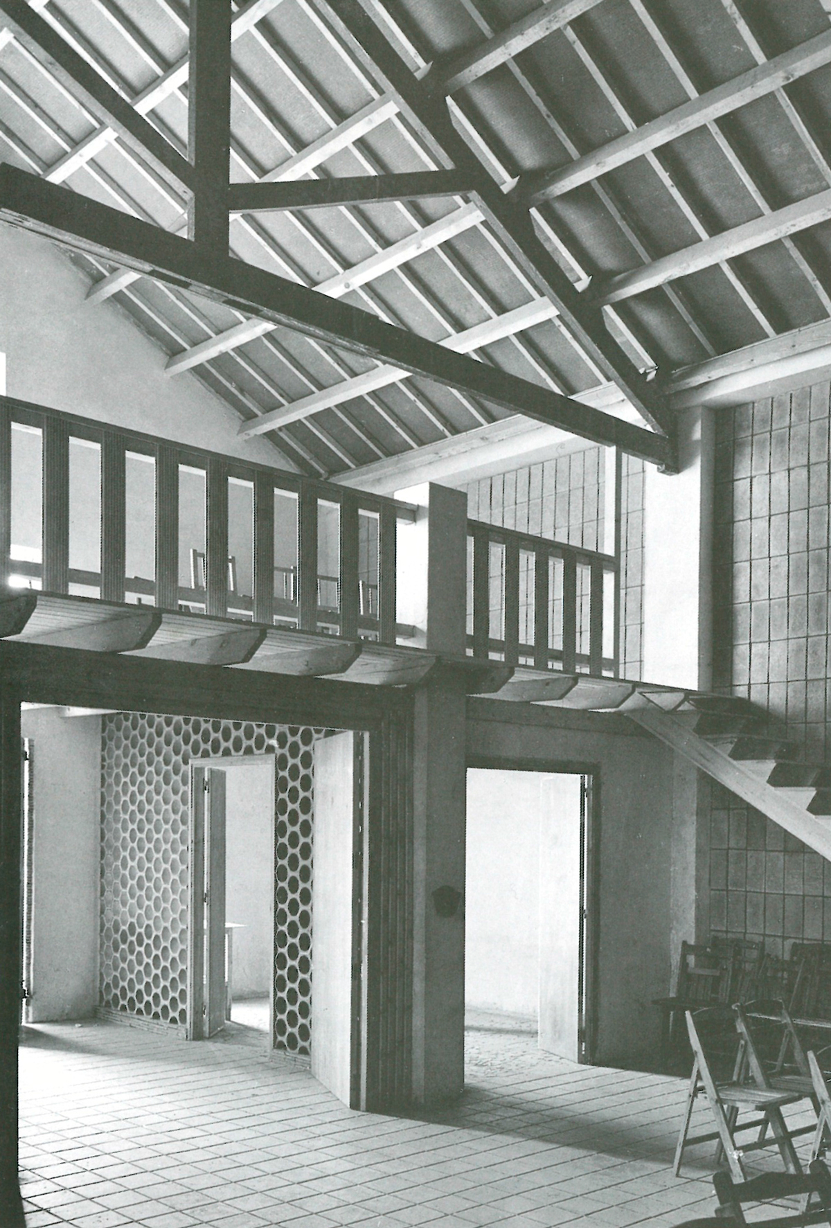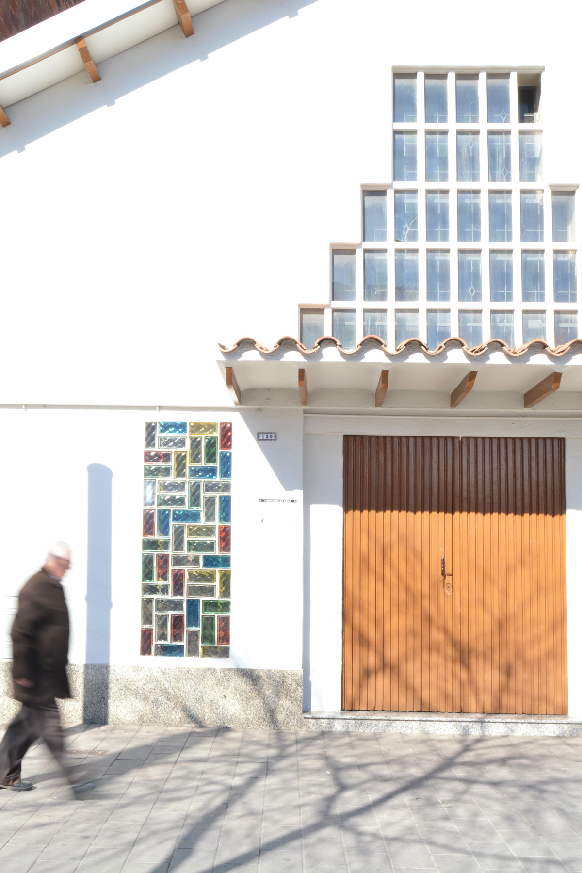 El programa funcional se adapta a la planta existente. Así, la sala se ilumina mediante las aberturas existentes en la fachada lateral, a las que Moragas adapta unas carpinterías de madera basculantes —que sobresalen de la cara interior de la pared mediante unos marcos especiales—, protegidas por unas celosías exteriores compuestas por piezas cerámicas cuadradas.