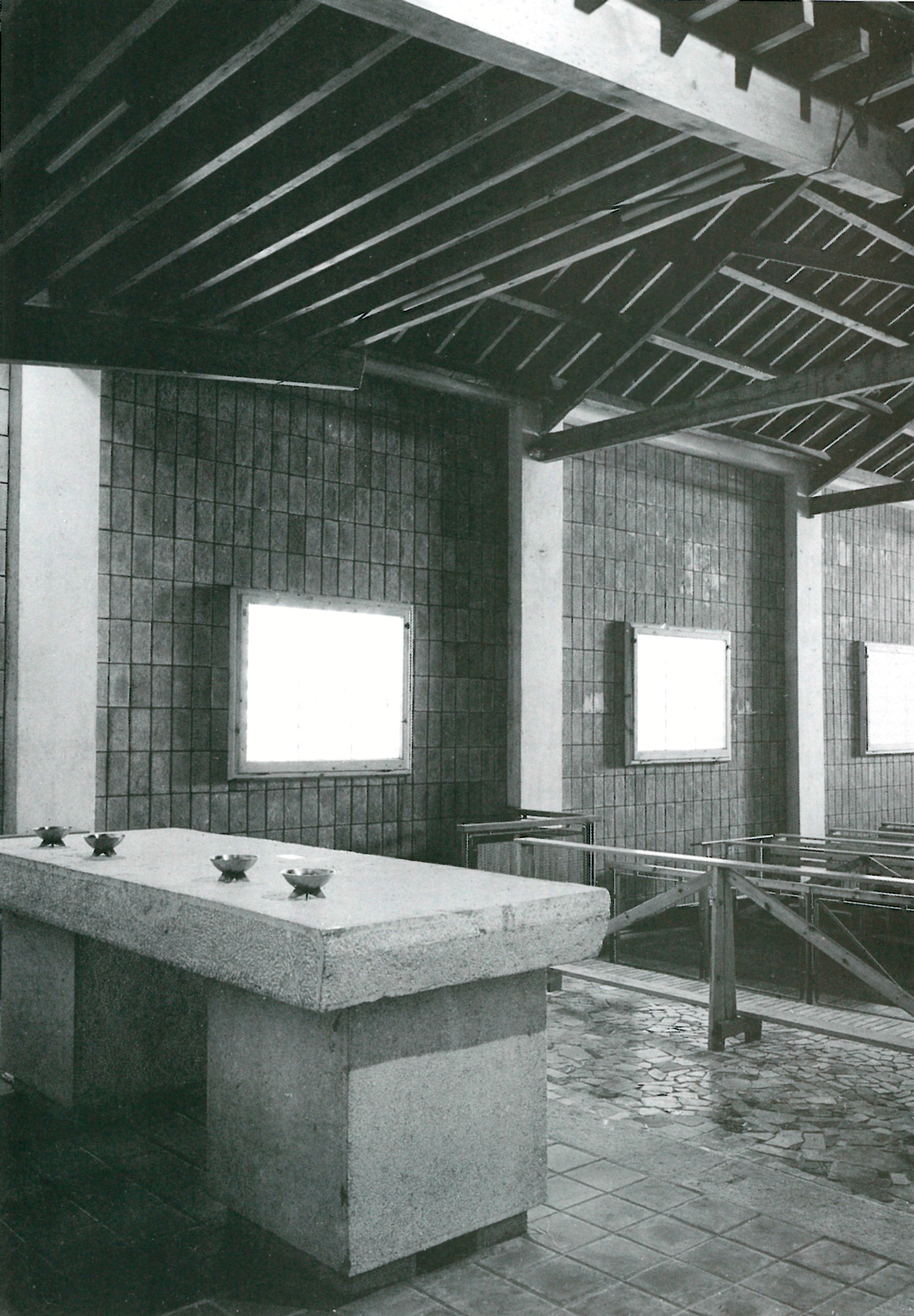 Los pocos elementos empleados —carpintería fija de plomo, cubierta de uralita y el campanario de hormigón armado que sostiene la cruz, realizada con la armadura de dos zunchos cruzados— siguen la lógica de estética “industrial” del proyecto.