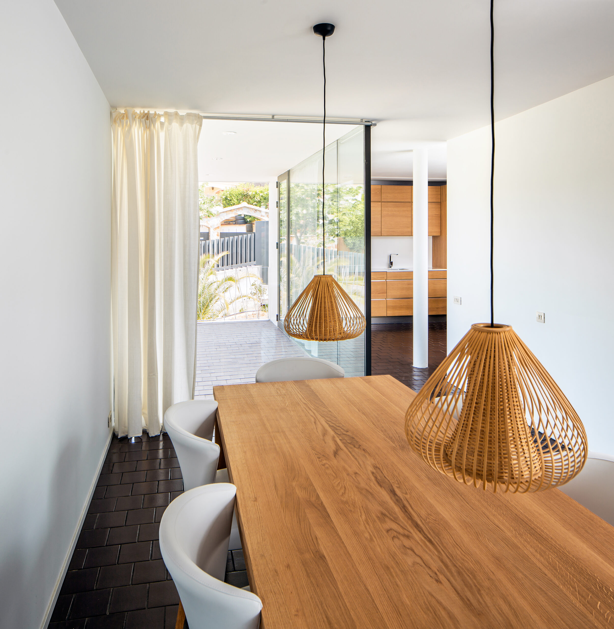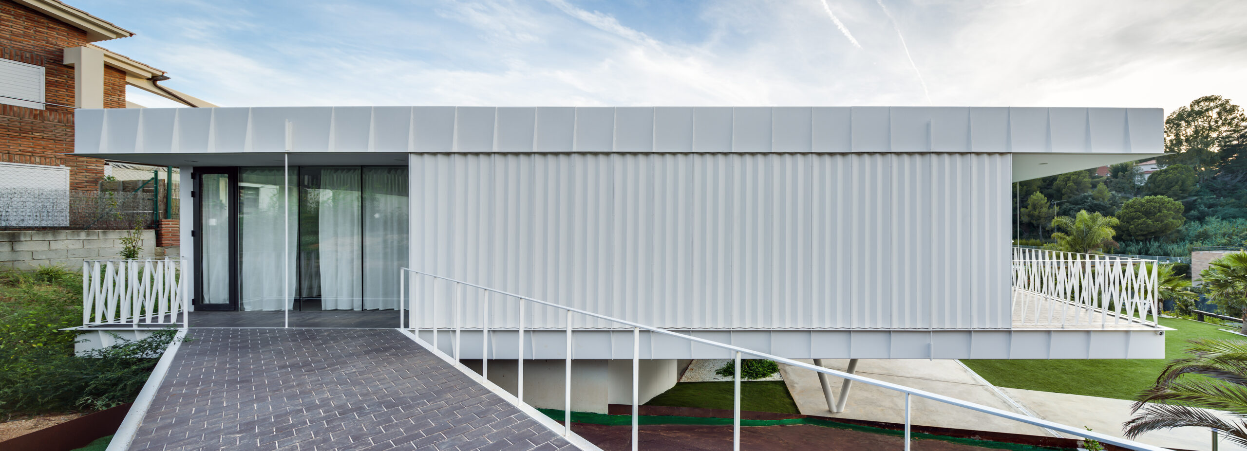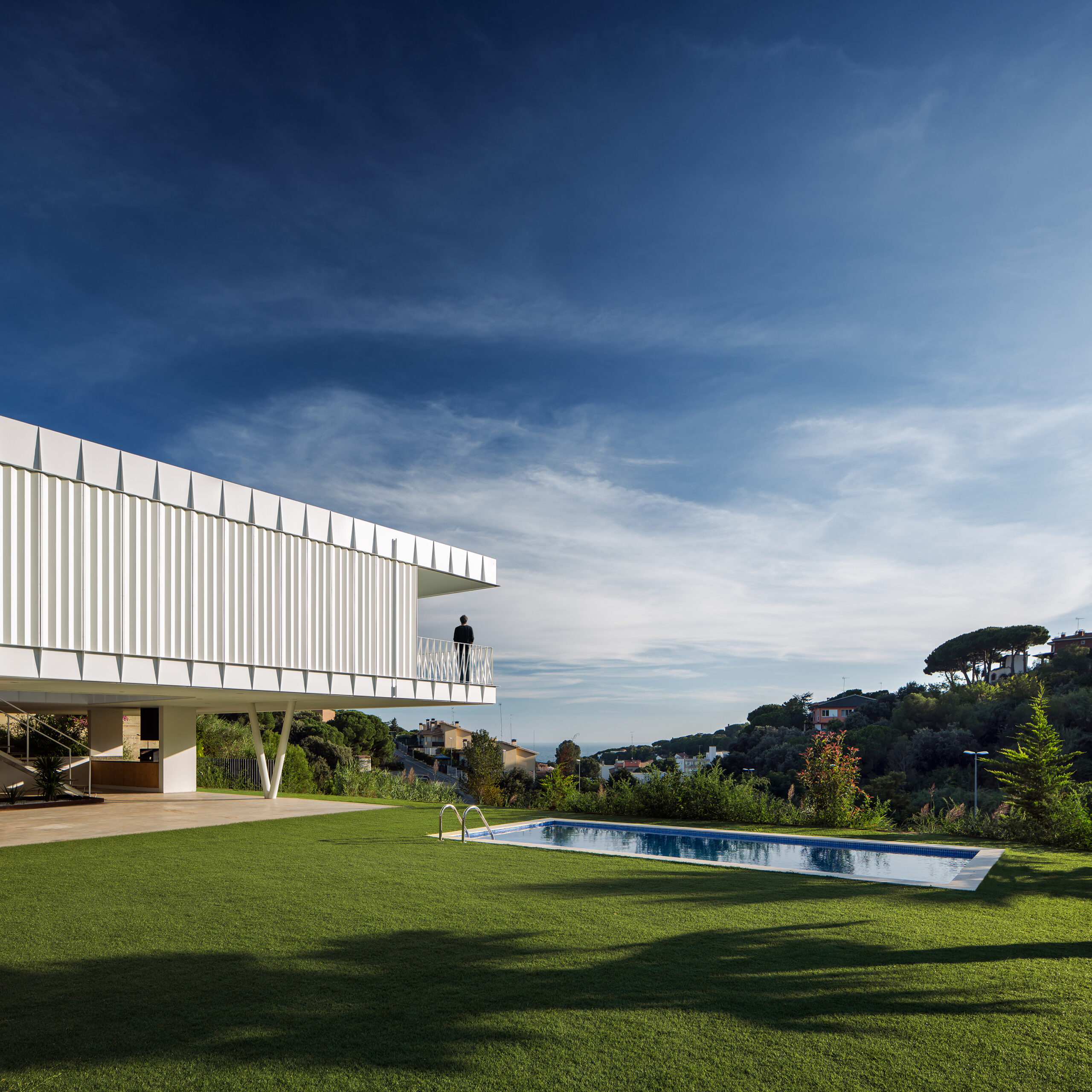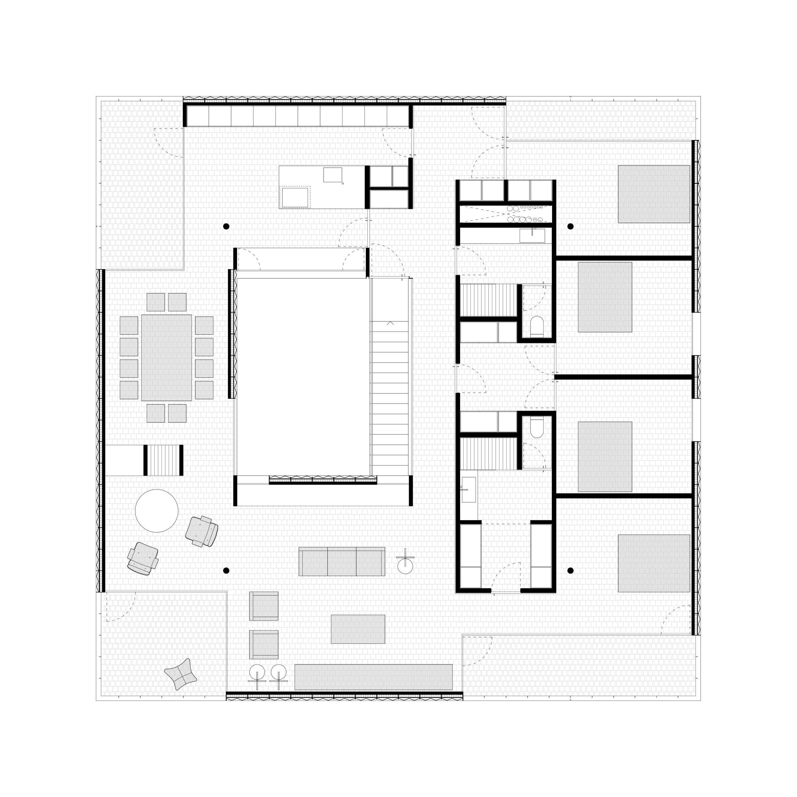 The constructed volume is formed by a prism of 16,80 x 16,80 x 3,75 m that takes maximum profit of the municipal regulations. The program of the house and the orientation of the different areas states the base for the perforation of the four corners of the prism. As as result four terraces with four different characteristics and conditions appear. Each terrace is associated to an interior space and to a different function of living: eating, cooking, being, sleeping… One big central patio finishes the duty of organizing the house as well as constitutes the main entrance to the house.
