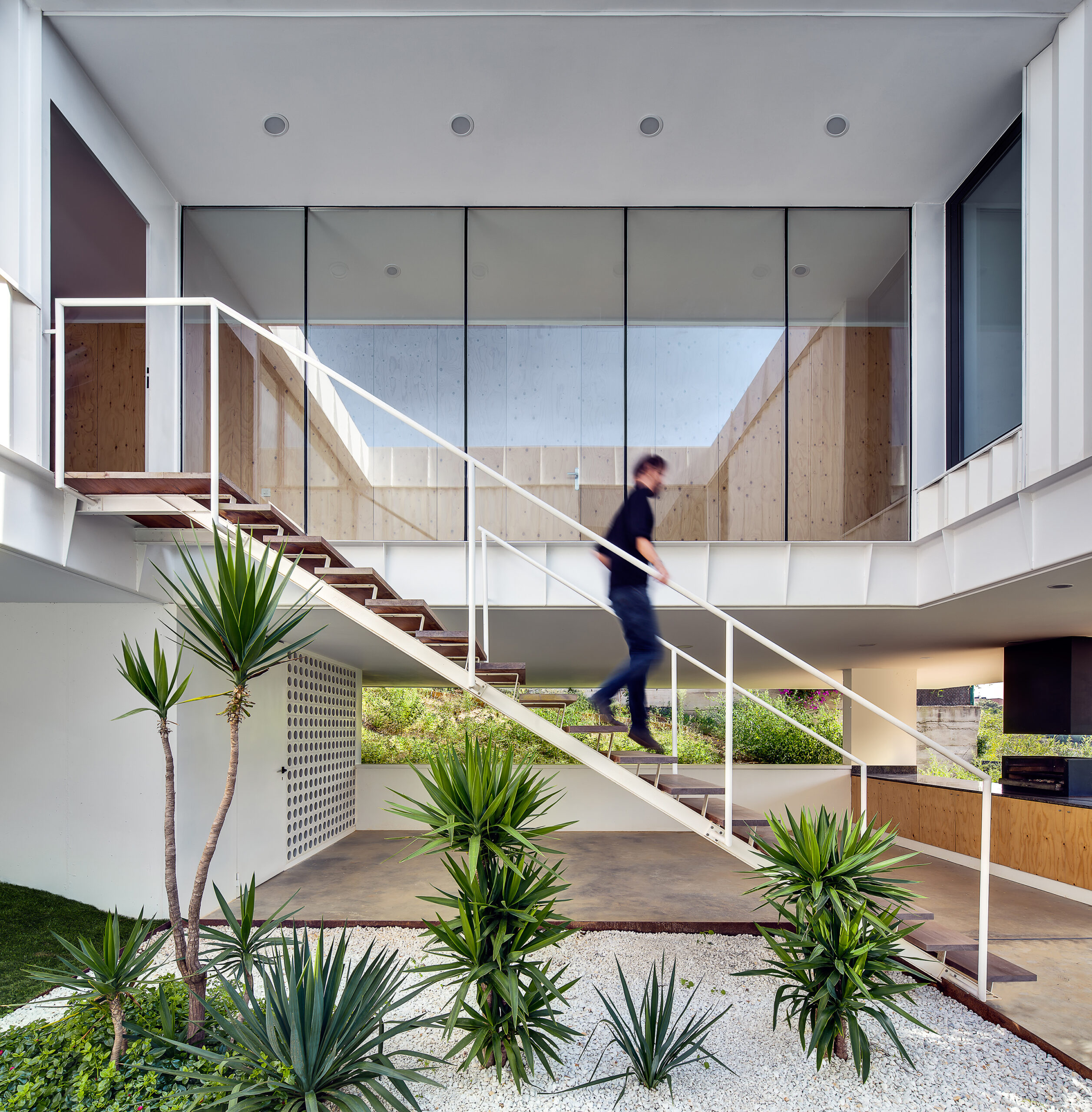The house is presented in one only floor, placed above the garden, staring at the sea, avoiding the neighbor’s shadow and dealing with the sun impact thru intermediate spaces. An object that slightly touches the ground, timidly, respecting the natural slope avoiding huge ground interventions.