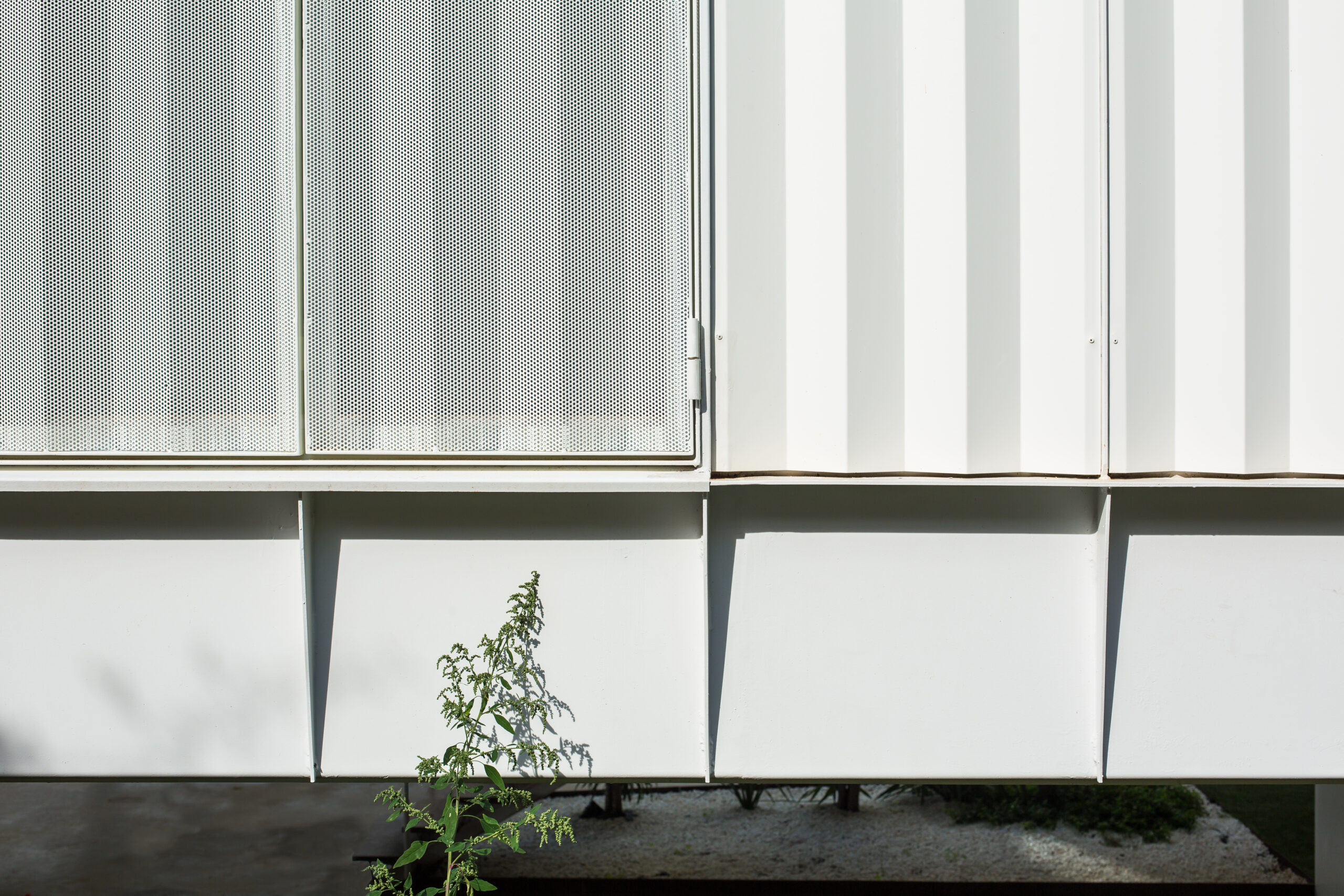 Taking advantage of the profession of the client (blacksmith) the materiality and techtonics of the house are linked to industrialization, lightness, quick execution and assembly. One big metallic cage held by 4 points forms a rigid superior slab of 70cm height that holds as well the inferior slab thanks to a net of suspenders placed every 60cm around the perimeter of the slab. These suspenders are as well the base structure for the façades.