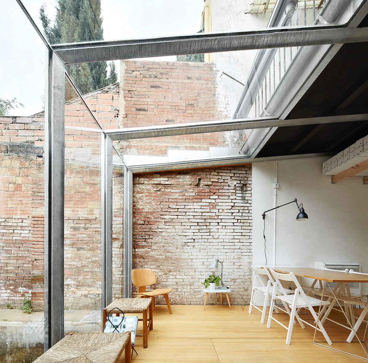 La intervenció s’ha centrat bàsicament en dos àmbits: l’entrada i el pati de darrere. A l’entrada s’ha reciclat una porta i una vidriera que el nostre fuster tenia al magatzem del seu taller, les hem col·locat a 1,8 metres de la façana, generant un porxo obert al carrer. A la part de darrere de l’estudi hem cobert part del pati amb una estructura lleugera d’acer i vidre, guanyant un espai que utilitzem com a sala de reunions. El bany a l’aire lliure és ara interior. La galeria és un captador d’energia per a l’hivern, i durant l’estiu es converteix amb facilitat en un porxo, ja que queda protegit del sol amb un tendal col·locat per sobre del vidre.