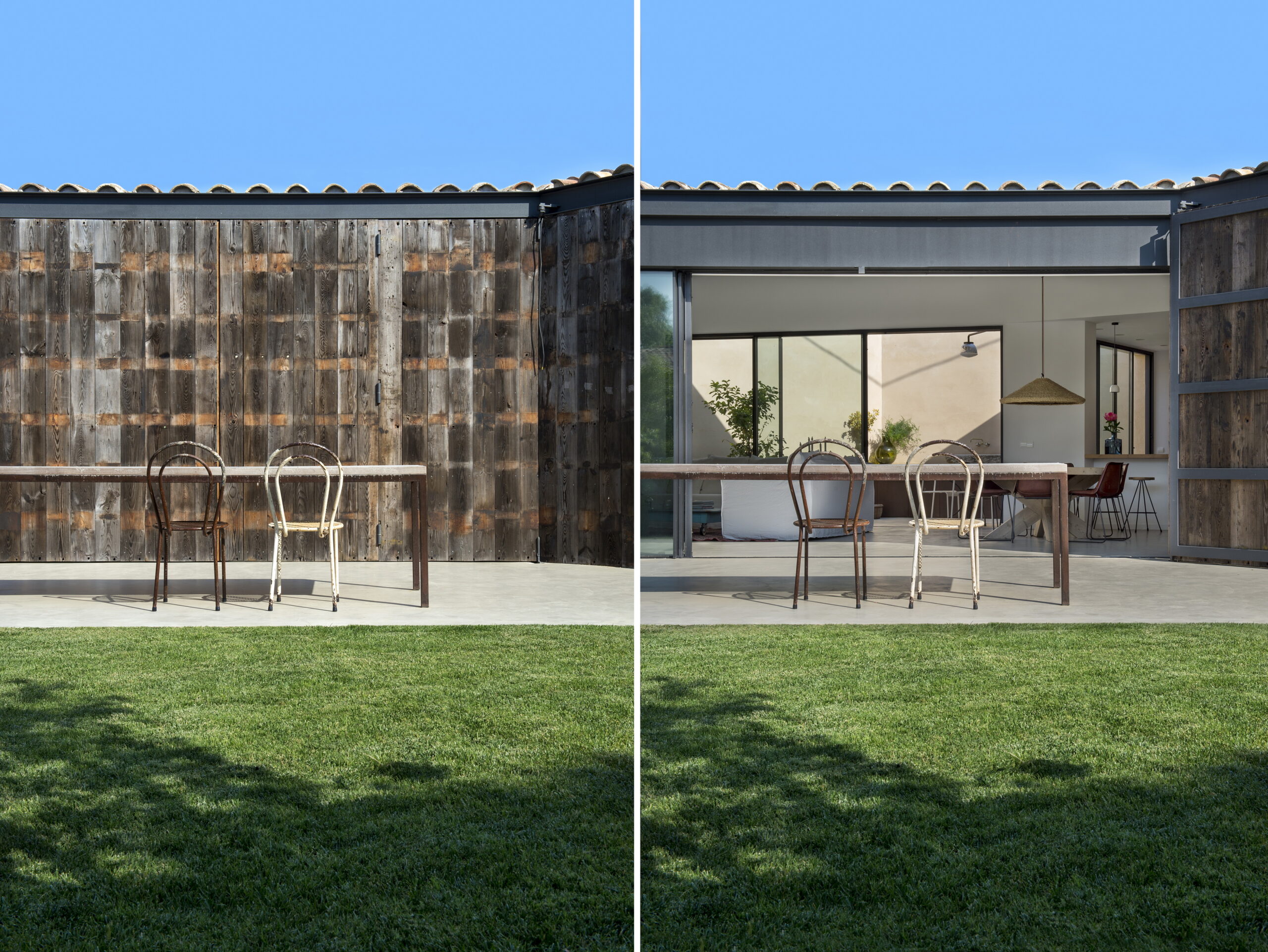 Los materiales y sistemas constructivos utilizados son los del lugar; una cubierta quebrada de teja cerámica, revocos del color de la tierra del entorno, suelos de hormigón pulido, y un cerramiento exterior de madera reciclada con grandes ventanales abatibles que permiten generar permeabilidad visual con el interior a través grandes paños de vidrio protegidos.