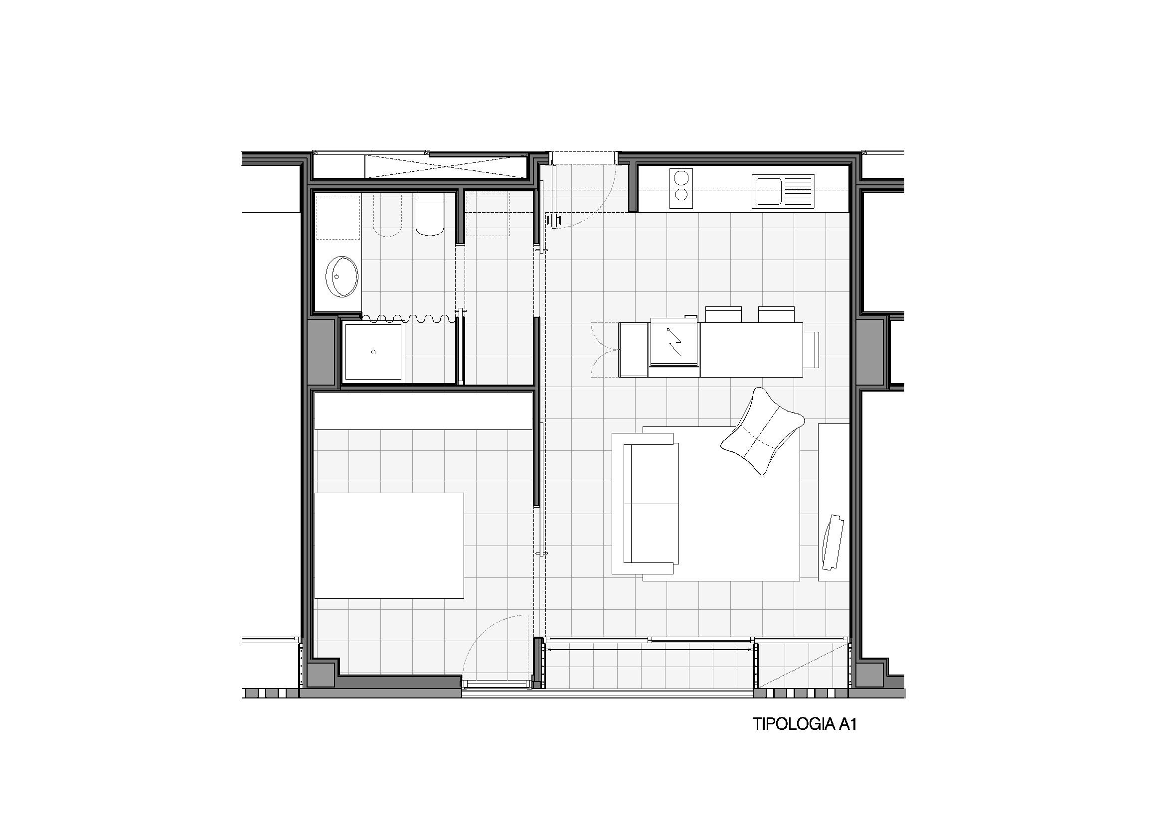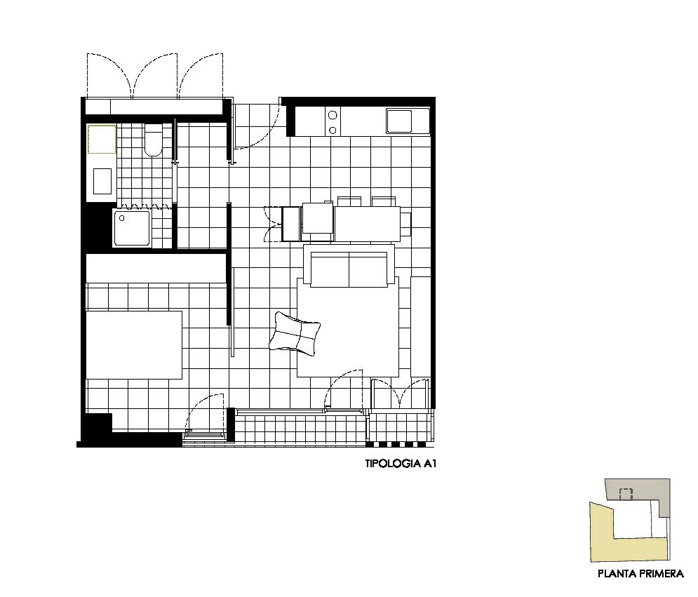 Buscamos que una vivienda de un dormitorio pueda disfrutar a escala reducida de un programa completo de los elementos servidores que ofrece una mayor. Para ello se estudia desde un mueble para situar la nevera y los utensilios de limpieza, que señala virtualmente tanto el espacio del comedor, de la separación entre cocina y sala como crea la entrada. La vivienda cuenta con la expresión mínima del pasillo convertido en un pequeño vestidor que da paso al baño, en éste una repisa de lavabo generosa, permite alojar la lavadora separando el ruido de la colada del resto de las estancias.