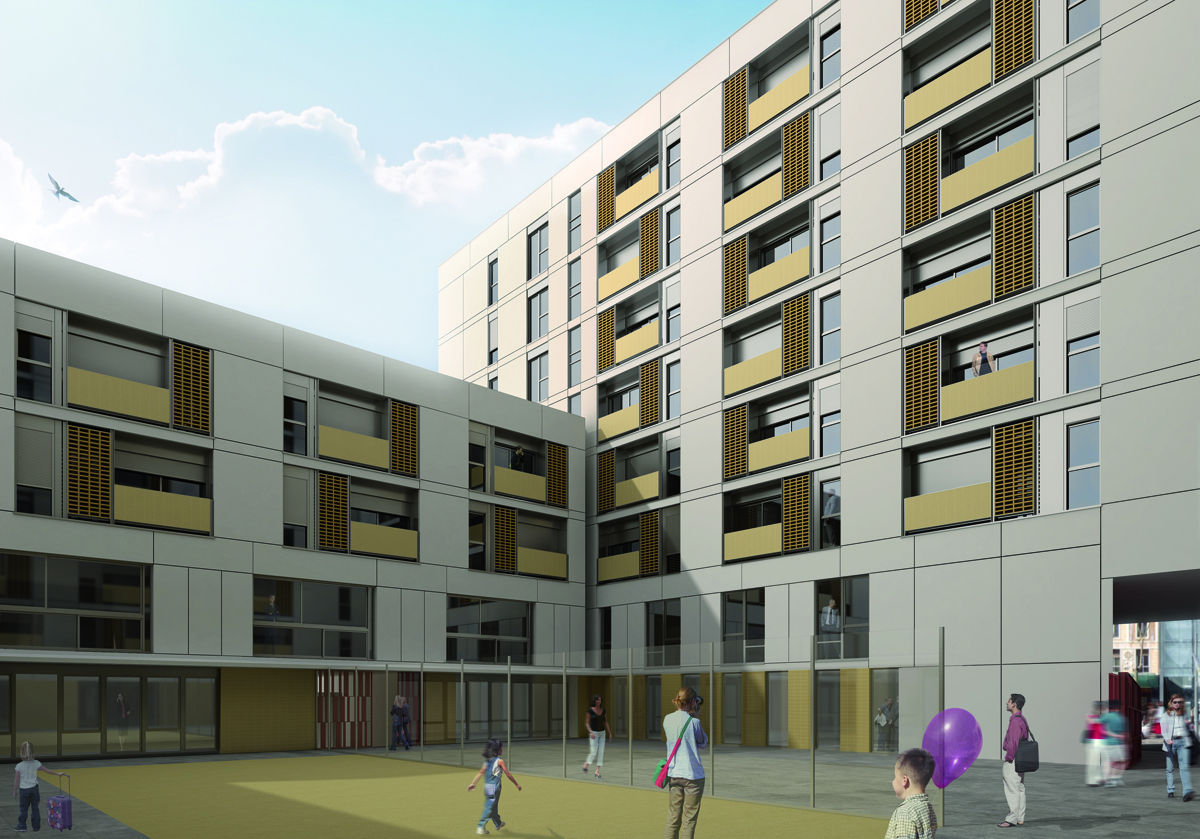 El edificio, promovido por el Patronat Municipal de l’Habitatge de Barcelona, se constituye de varios programas de carácter público, basados en 154 viviendas dotacionales de alquiler. Se organiza el conjunto en dos alas: una cuenta con 78 viviendas para alquiler social y una guardería en planta baja, la segunda cuenta con 76 viviendas para personas mayores, y un centro cívico en planta baja y primera. Se realiza un aparcamiento de dos plantas subterráneas que ocupa todo el solar.