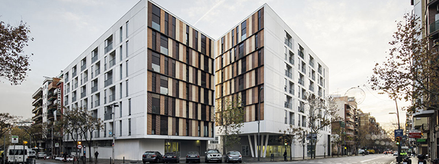 La utilización del panel prefabricado de hormigón de color blanquecino se reivindica como material contemporáneo que se inserta perfectamente en el ensanche Cerdà dialogando con la materialidad y el color del estuco de los maestros de obras. Por la misma razón ha sido un placer poder trabajar en una fachada tectónica, una fachada donde se recupera el juego de la luz y de la sombra gracias a la profundidad del hueco que se crea con los balcones y a la vibración que se ha conseguido las rasgaduras de las celosías que protegen los tendederos.