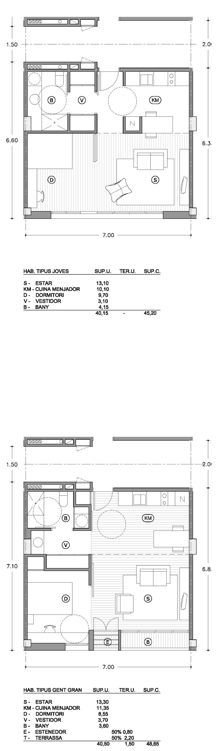 Para el tipo principal del que finalmente se hicieron 110 unidades se propusieron diferentes alternativas (a la izquierda dos de ellas) pensando en ofrecer cierta diversidad partiendo del mismo módulo. Durante el proceso, al afinar las dimensiones y los elementos del programa el promotor acabó escogiendo una de las alternativas y prefirió la uniformidad a renunciar a elementos importantes como el tendedero o el balcón.