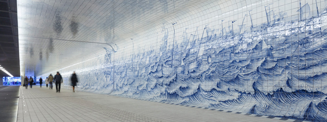 Cuyperspassage is the name of the new tunnel at Amsterdam Central Station that connects the city and the waters of the IJ-river. Since the end of 2015 it has been used by large numbers of cyclists, some 15,000 daily, and pedestrians 24 hours a day. This ‘slow traffic corridor’ was exactly what many users of the city felt was lacking. What once was by necessity a left or right turn is now, at long last, straight ahead. The tunnel is clad on one side by nearly 80,000 Delft Blue tiles: a true Dutch spectacle at a central spot in Amsterdam.