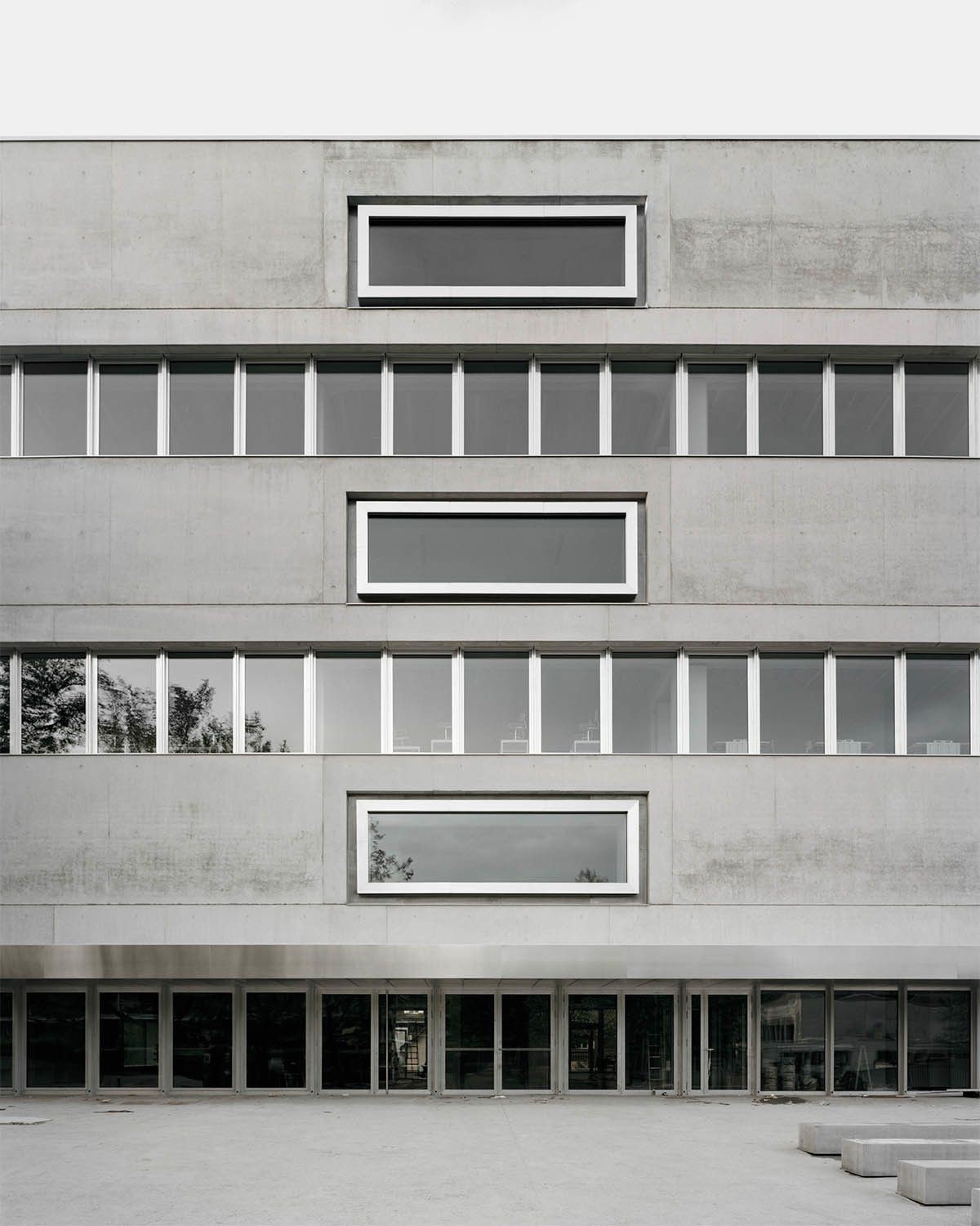 In order to preserve enough space for the existing sycamores in the forecourt along Säumerstrasse – which forms the entrance to the campus – the new five-story building was placed as far to the southeast as possible. This accentuates the valuable mature plantings while creating well-proportioned, sequential exterior spaces. The green space between the new building, Nidelbad, and the sports fields remains unbuilt and open.
