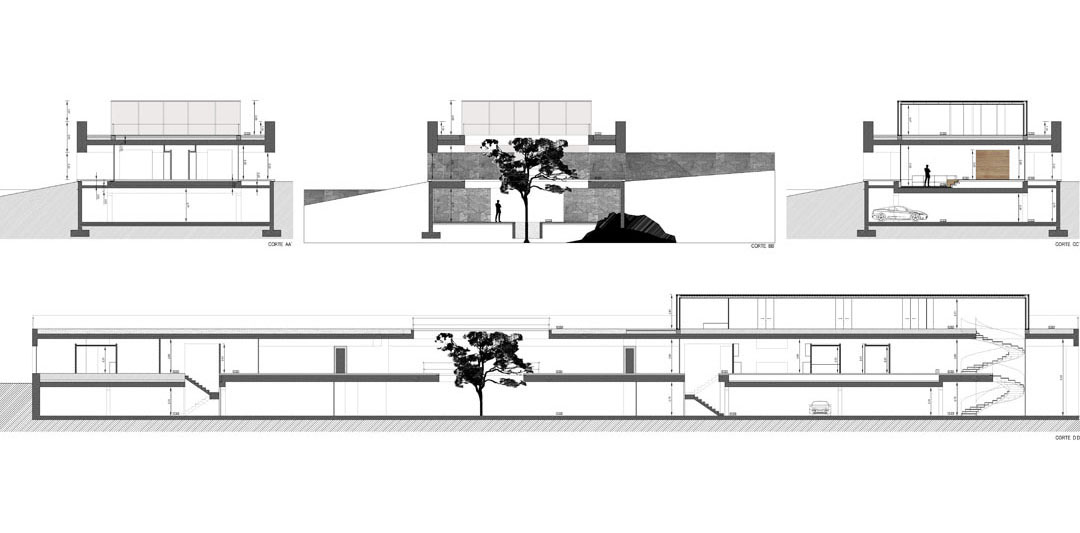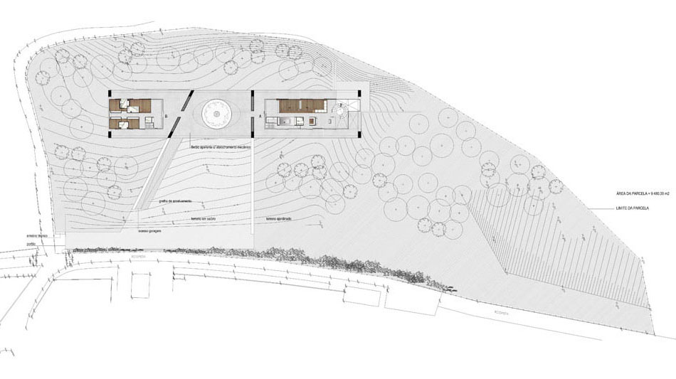 The most distinguishing feature of this house is probably the way how it interacts with the surroundings. The thing is that the plot is located on a frontier between Portugal and Spain in a woody and hilly region with breathtaking scenery. Utilizing the relief of the place, the new building excellently fits the surroundings so that, in most cases, the house looks like a part of the natural landscape. This visual effect is emphasized by using stone materials like concrete and granite.