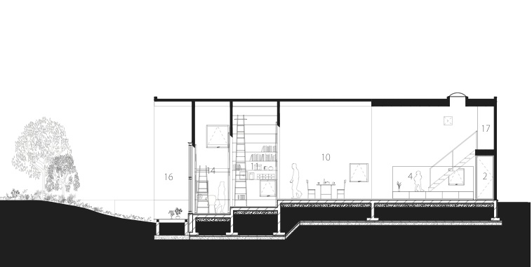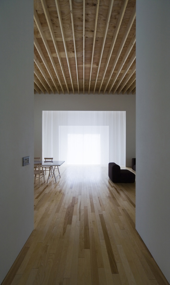 The series of buffer spaces created by the terrace, sun parlor, and guest room act as volumetric layers that diffuse the light. semitransparent curtains between these spaces give the inhabitants control over how connected the interior is to the exterior. This element of layers becomes a motif for the house and is able to be seen from multiple rooms through square apertures and openings.