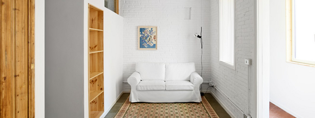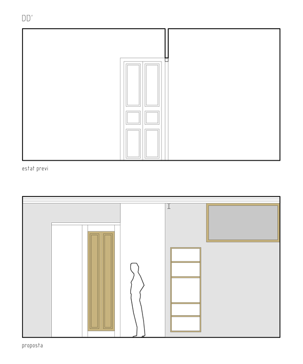 En primer lugar se procedió al derribo del altillo del pasillo, recuperando la altura original. Los pasos de puerta situados a cada extremo también se eliminaron consiguiendo una mayor sensación de amplitud al entrar a la vivienda. Parte de la antigua habitación doble se fusionó con el comedor generando una nueva sala de mayores dimensiones con dos ámbitos estar – comedor espacialmente definidos por las dos alfombras de mosaico existentes. El sobrante de esta operación se añadió a la antigua habitación simple con el fin de obtener una pieza con capacidad para una cama doble.