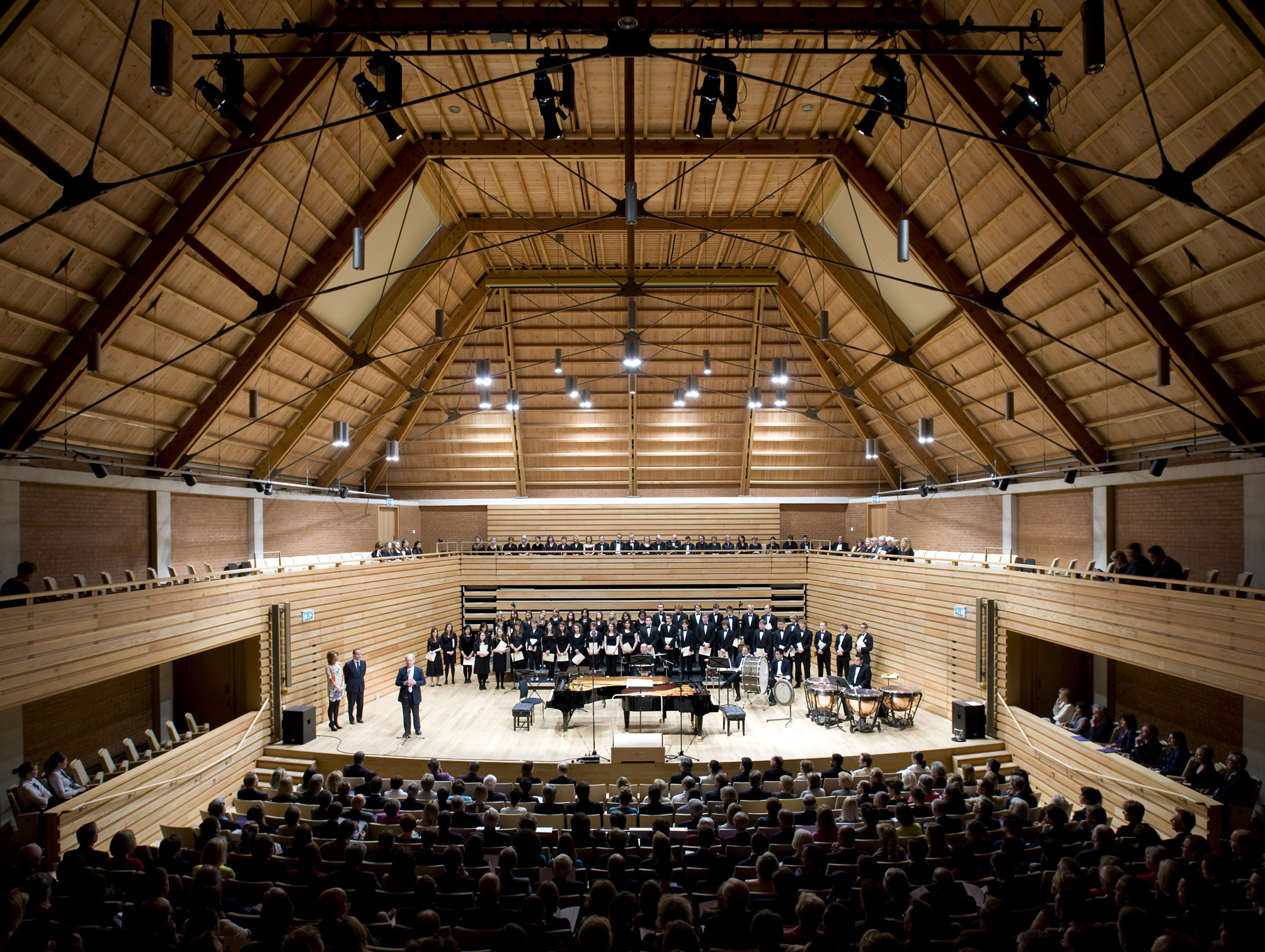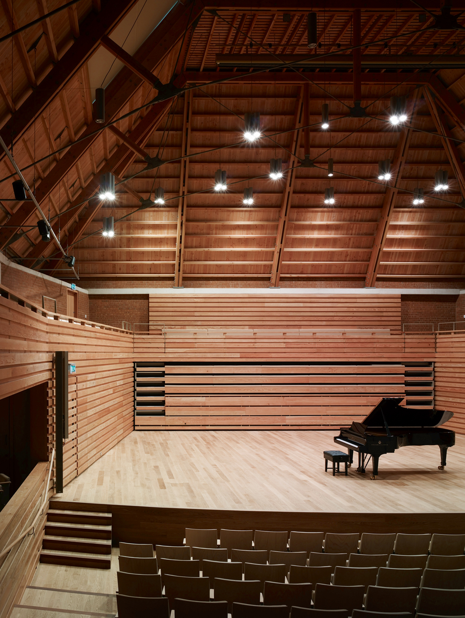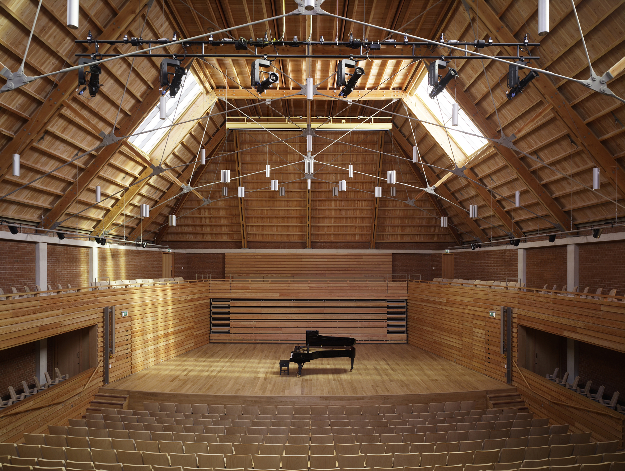 The first project of Sevenoaks School’s Masterplan is a new Performing Arts Centre, completed in 2010. The Centre contains a concert hall to seat 450 with an orchestra and choir, a recital room for 100, a drama studio, and 24 music and drama teaching spaces. A generous foyer connects music spaces to the school’s theatre. Acoustic considerations underlie every aspect of the building’s design.