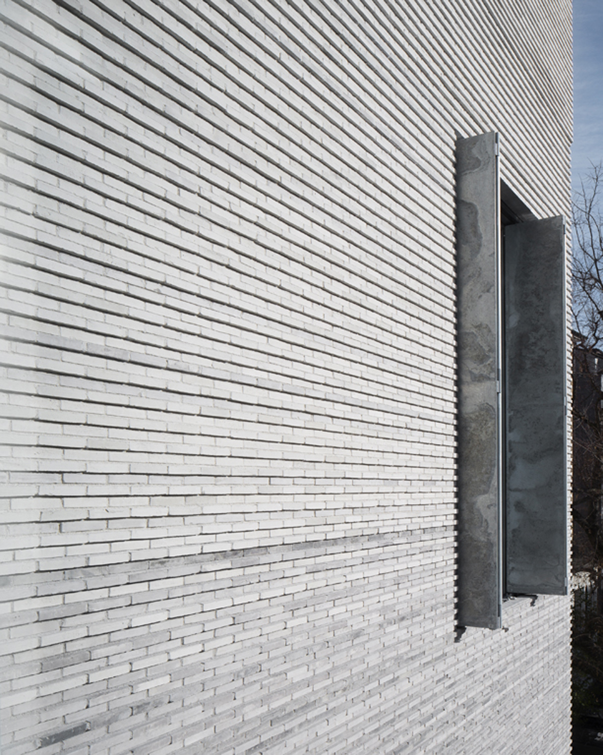 The façades are gray brick walls that exude the timeless and archaic air of an ancient ruin. They were designed to be self-supporting and monolithic, and their emphatic horizontality, with elongated bricks that are just four centimeters high, heightens their presence. The striking pattern of shadows cast by the alternately projecting and receding layers of brick amplifies this impression. Like the main building’s façades, those of the new building hint at classical architecture’s standard tripartite order of base, middle, and capital. This order is visualized through the brickwork’s different shades of gray as well as a frieze executed as a delicate relief. The frieze, in its archetypal form, has always been part of the traditional architectural canon, but in the form it takes here it represents something quite new: sunk into the grooves of the frieze blocks are strips of LEDs that illuminate the hollows between the bricks, shedding an indirect light into the surrounding urban space. The result is a visually stimulating effect as the archaic-looking masonry begins to shine or, at a lower power setting, to glow.