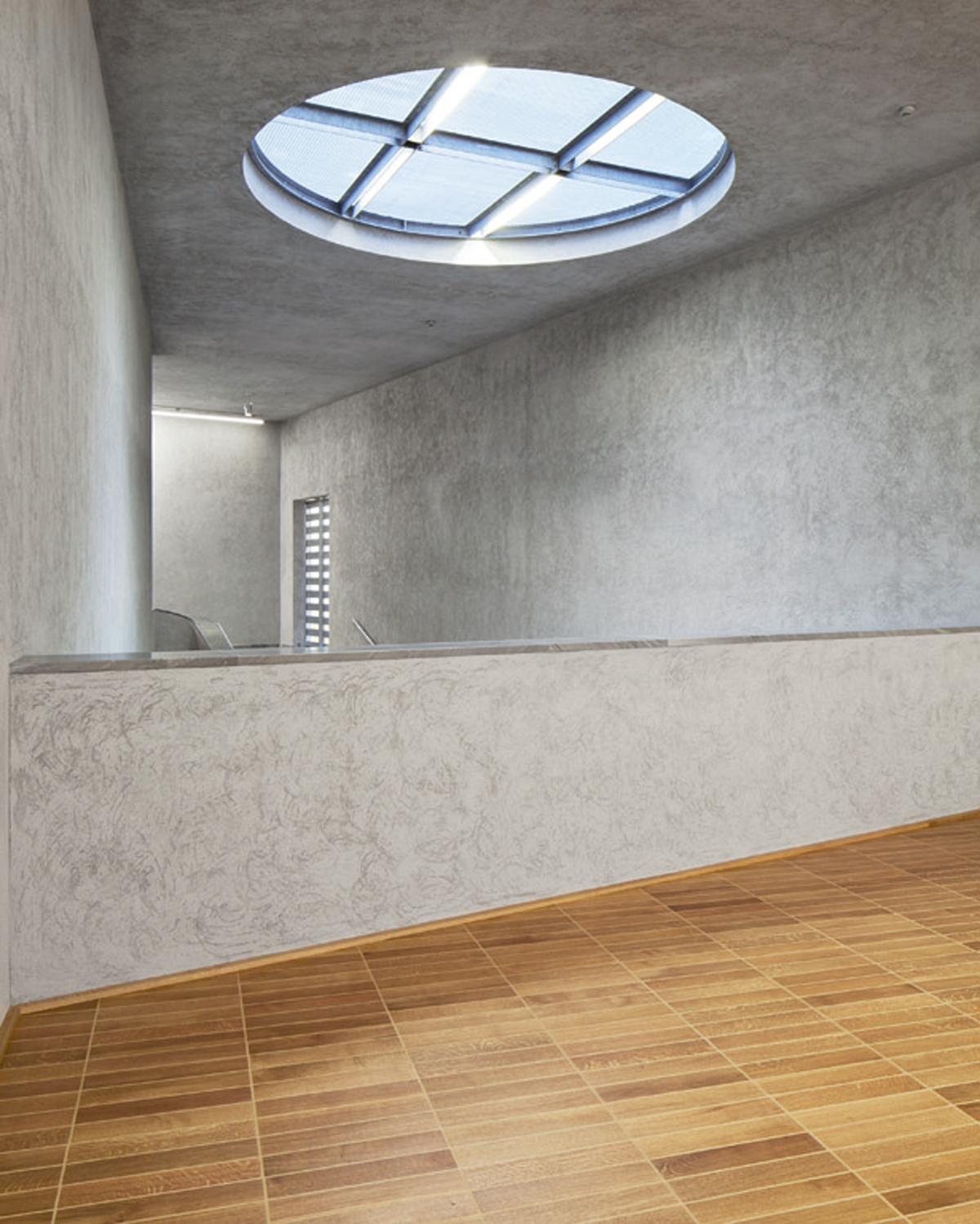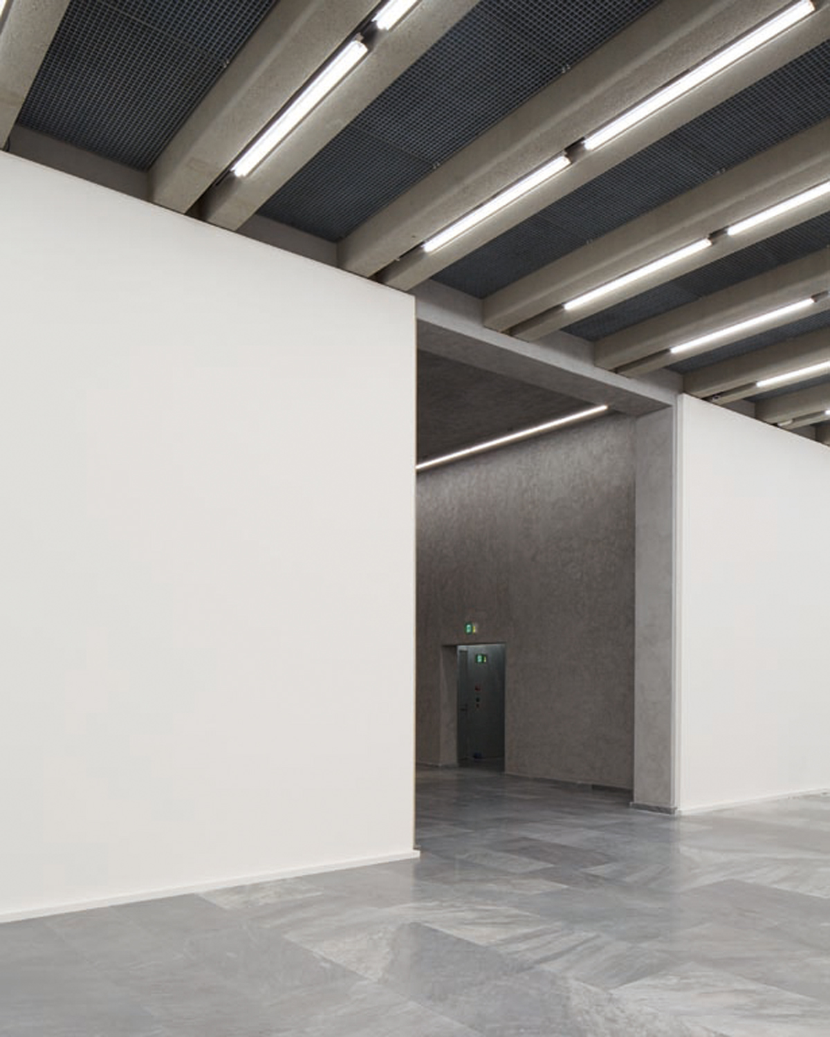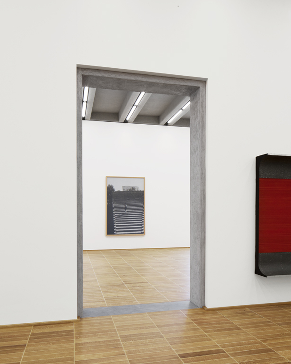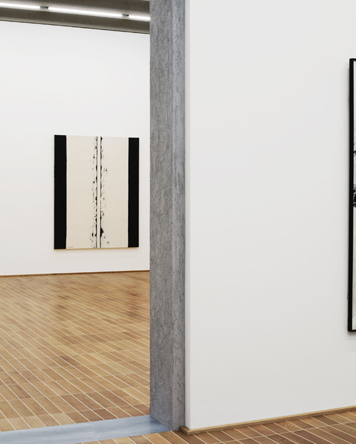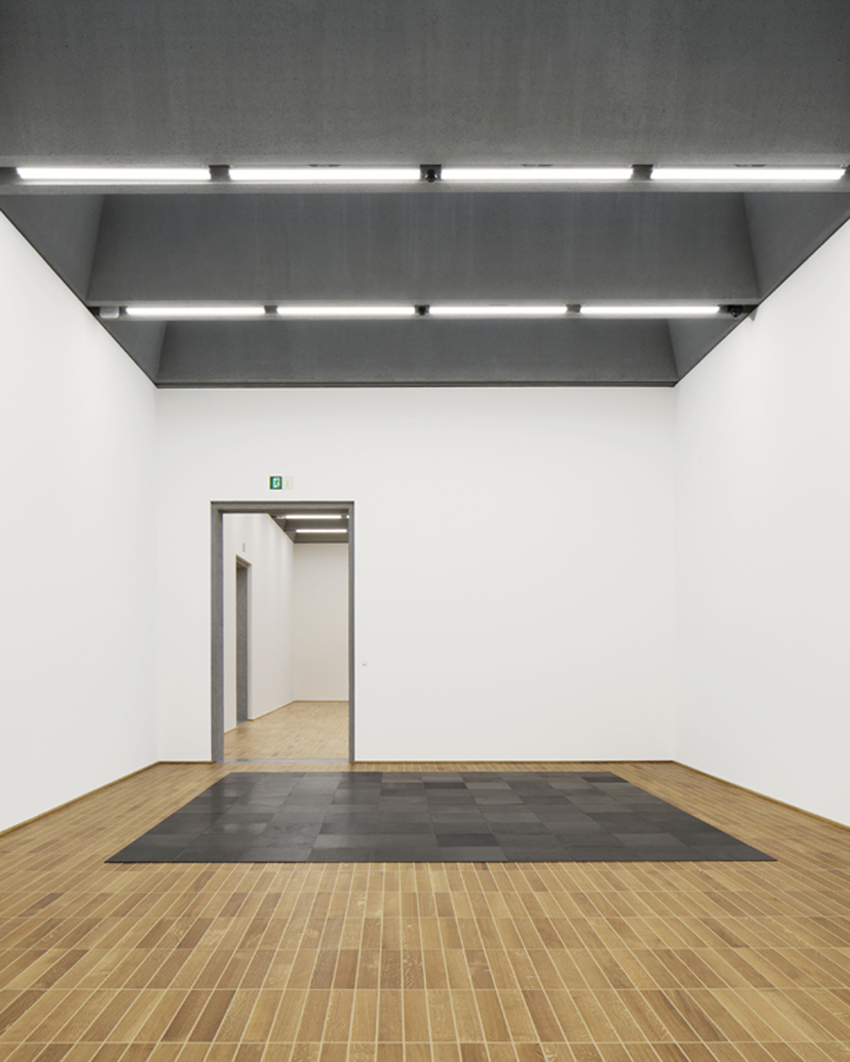 The rooms have a powerful physical presence. The elements that define them are clearly articulated components; assembled, they generate a tectonics that maximizes the architectural effect of the whole. The galleries feature an industrial parquet floor made of oak strips glued directly onto the screed and grouted with wood cement. The supporting wall made of concrete with gray rendering is similarly explicit, as is evident in the door and window reveals. Visibly fronting it, but set back at the edges, is the solid, ten-centimeter-thick plasterboard wall that serves as both substrate and backdrop for the paintings. As exposed structural elements, the prefabricated, sandblasted concrete ribs that span the galleries visualize the load-bearing relationship between walls and ceiling. Not only do they lend the ceiling its own specific structure, they also give direction to the space underneath.