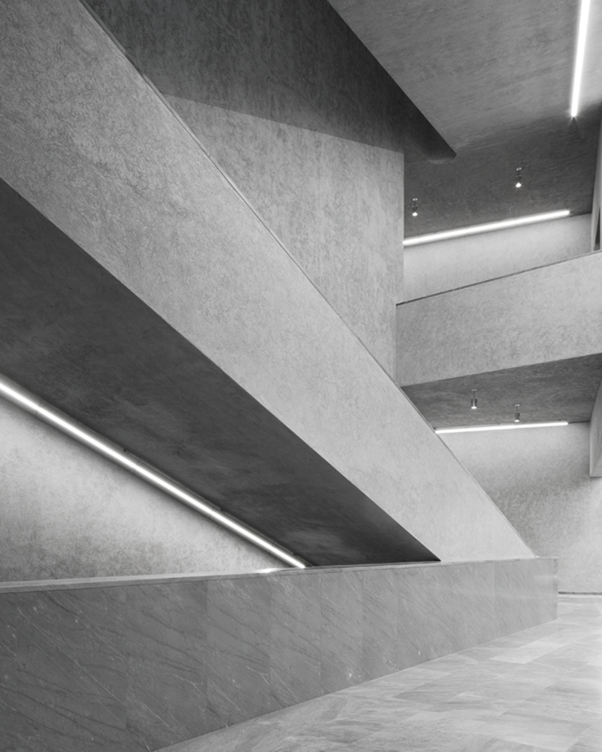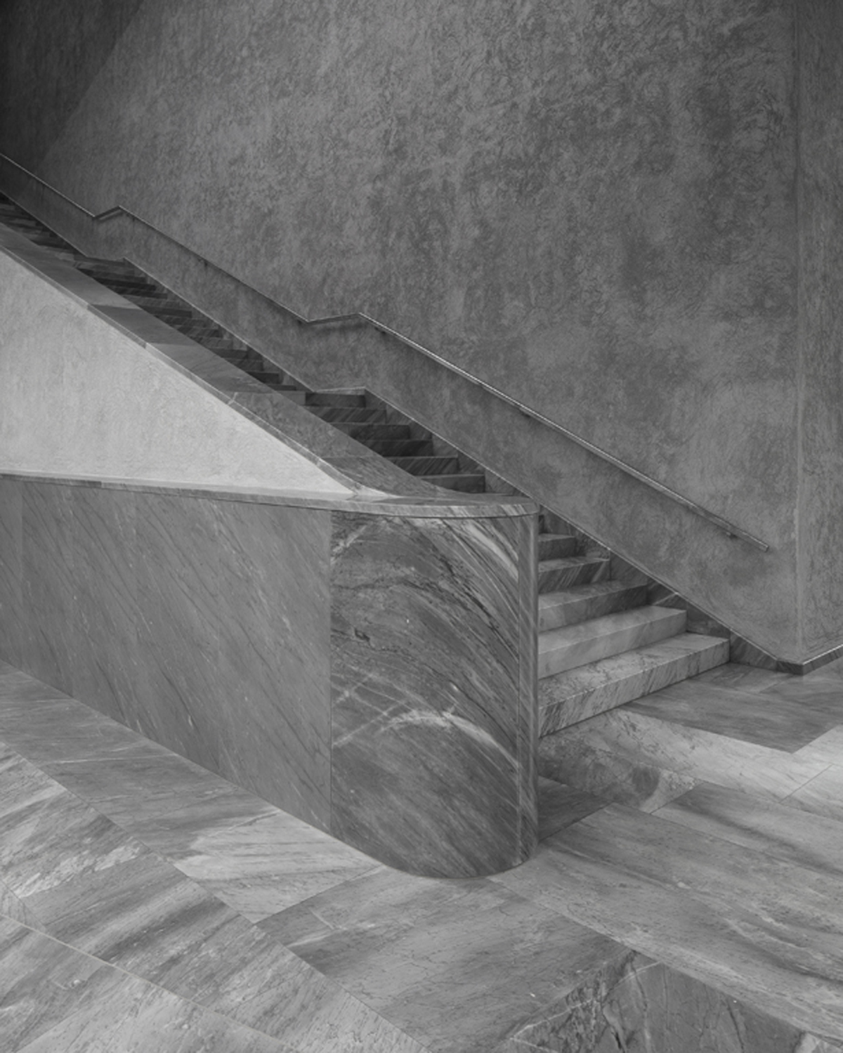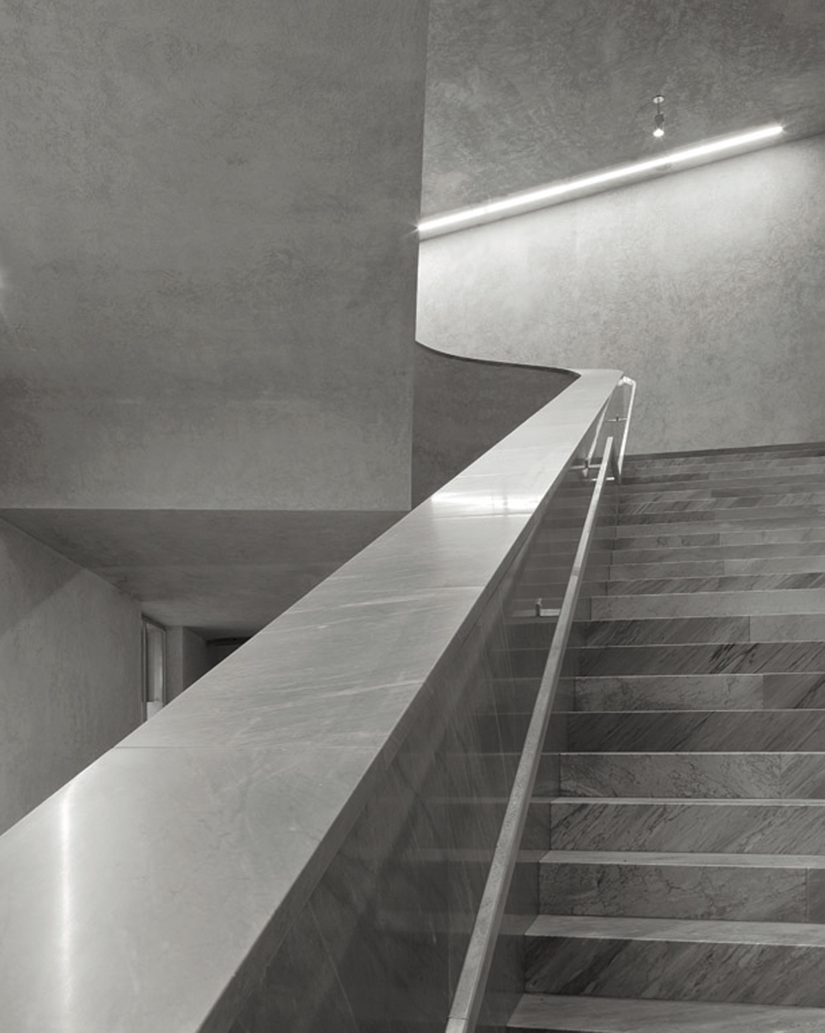 The actual connection between the main and new buildings beneath the road is not so much an underpass as an ensemble of large open spaces leading into a generous hall that is foyer, gallery, stage, experimental space, auditorium, and function room rolled into one. Here starts the central staircase of the new building, which echoes motifs of that in the main building: gray, veined Bardiglio marble from Carrara on the floor and rough scraped plaster in a cooler shade of gray on the walls.