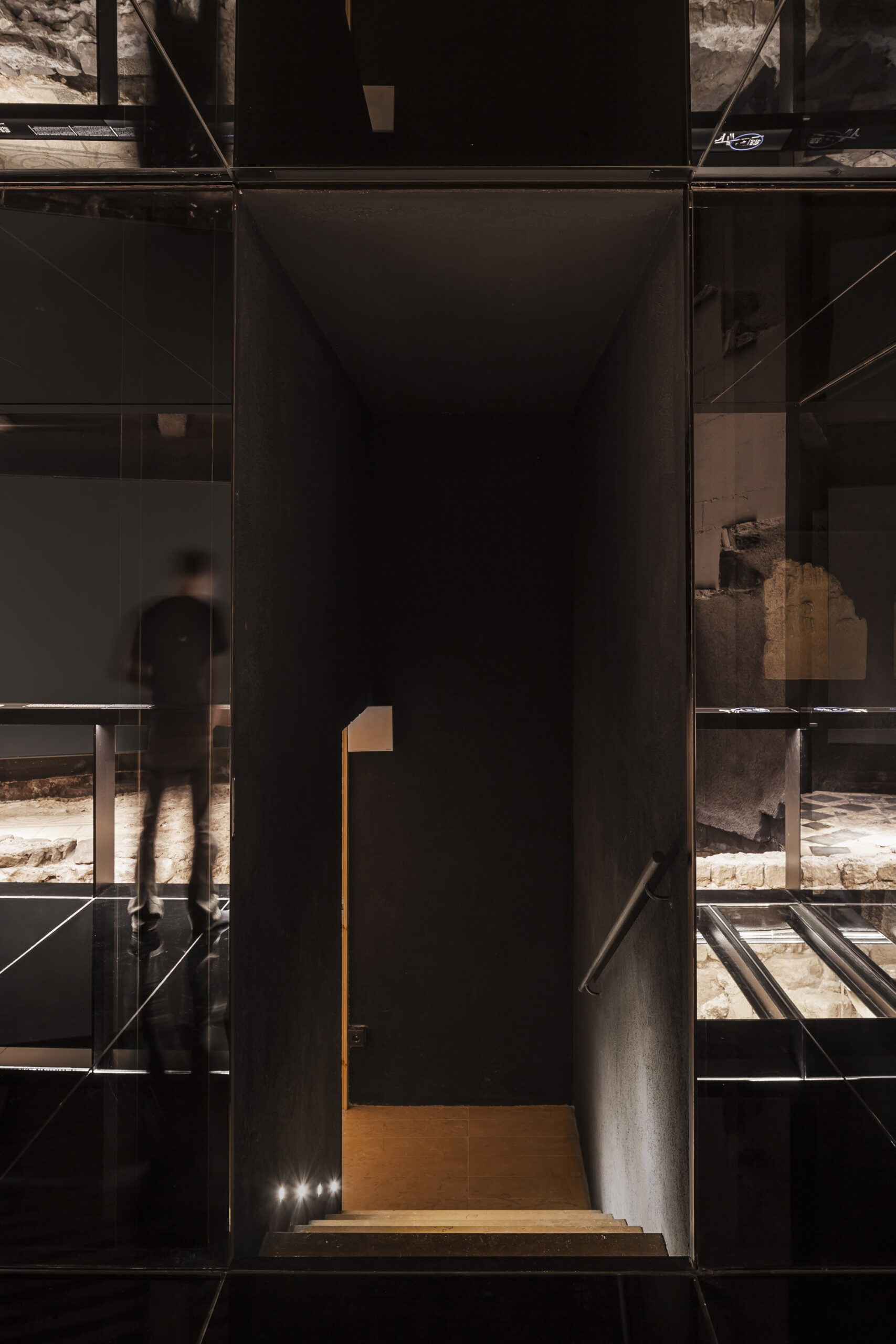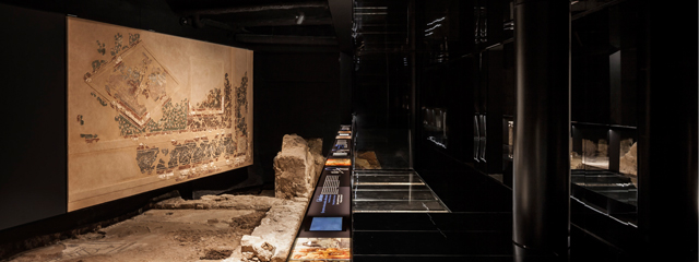 Mediante unas escaleras en túnel, se accede a un altillo longitudinal a modo de mirador, sobreelevado en relación al yacimiento. Todo el espacio desaparece, pintado de negro, emergiendo sólo los restos arqueológicos y una gran pintura mural que hubo en el techo de una de las estancias de la Domus.