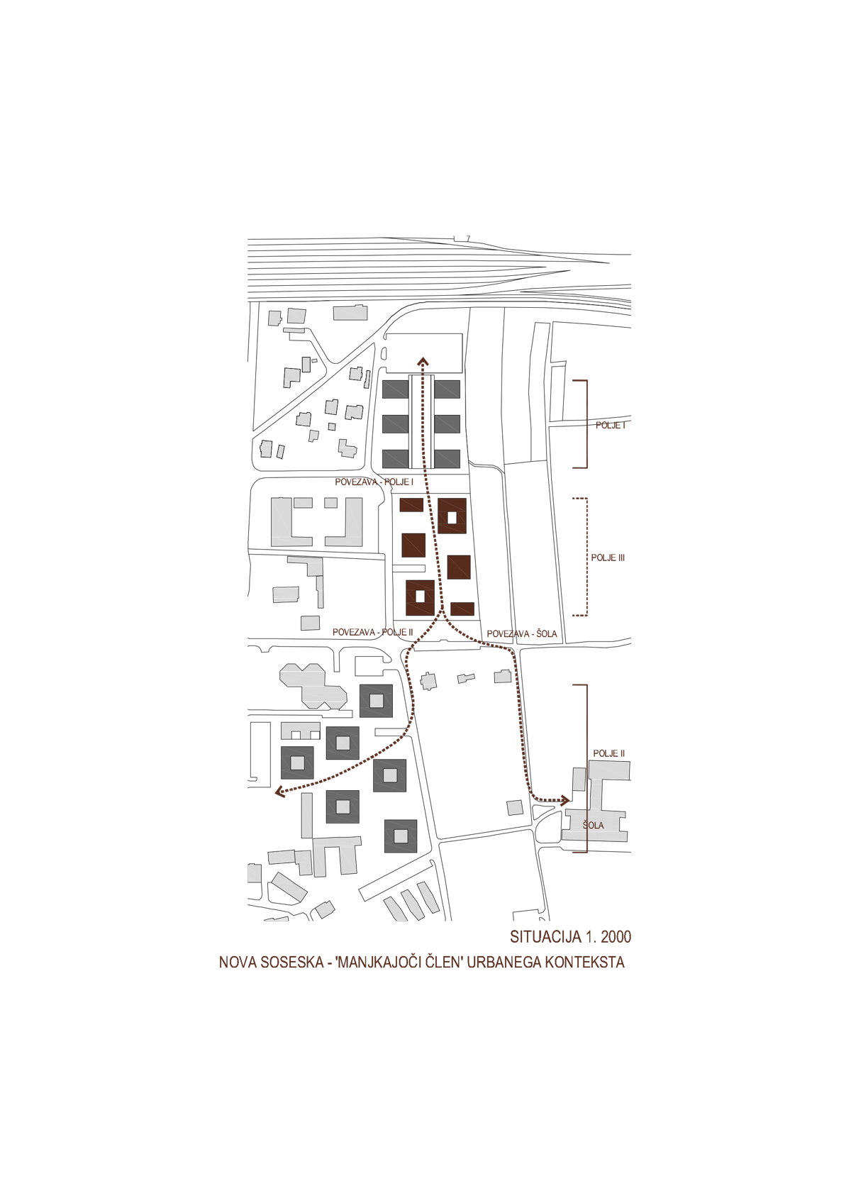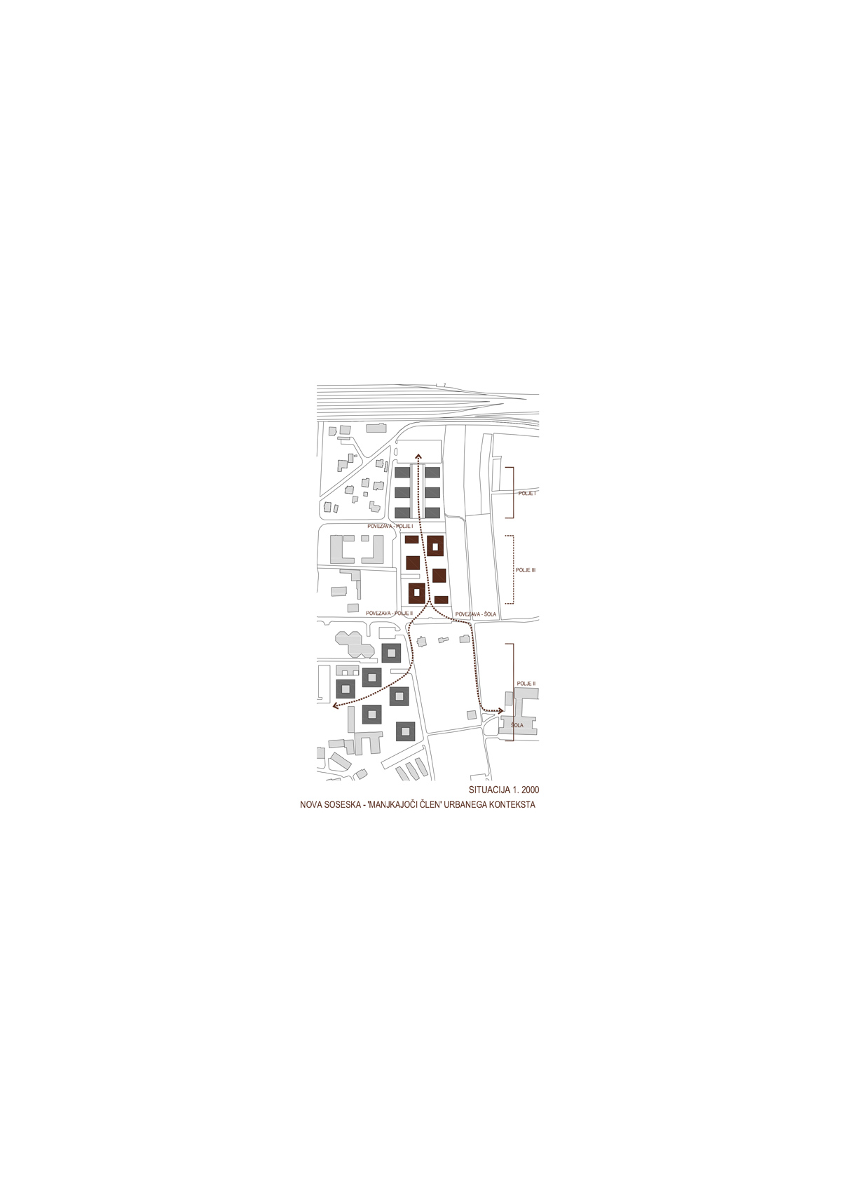 Conceived as a ‘connecting’ morphology, it consists of 6 blocks in total, of 3 different types (slab, villa and a city block), creating a typological transition between two complexes. The new buildings are laid down onto green circular ‘platforms’ of bushes, protecting the ground floor units and establishing one longitudinal and a series of perpendicular connections across the site. The connecting point with an older Polje I project is conceived as a hybrid parking/sports area surface, retaining the distance and preserving the autonomy of each project.