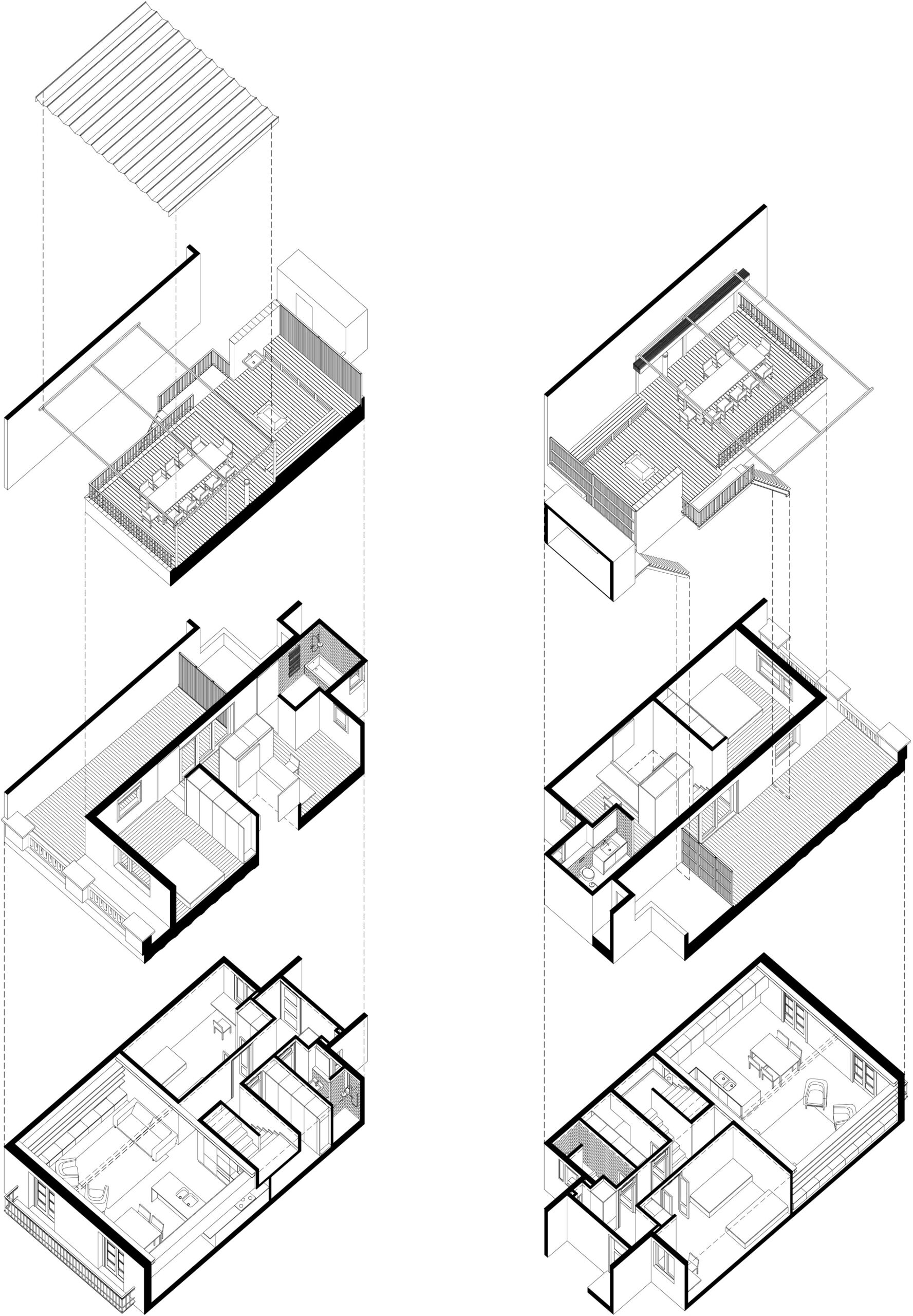 El apartamento superior, de unos 40 m2, había sido construido con posterioridad, probablemente durante los años 60, cerrando un volumen en la cubierta del edificio que se aleja tanto de la fachada principal como de una de las medianeras, liberando una estrecha terraza en este perímetro.