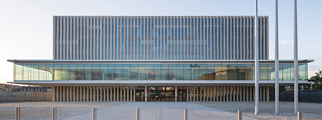The shape of the building agrees not only with the tradition but of course with the more complex duties of law courts in the 21st century. An orthogonal pattern constitutes the base for the organisation of the needs of the law courts. The main rooms are adjacent to the facades; the corridors throughout the building always end at the facades. This results in good lighting, and a comfortable working area is provided. But this pattern involves more than a pragmatic and optimized organisation of the building – it involves an experience of interior space. From the main entrance, there is an axis leading directly to the middle of the building. This circular center spans all 5 floors; it is the heart of the law courts, a landmark and also a parameter for the interior area. A horizontal pendant to this vertical elevation depicts the first floor where the court rooms are positioned. The floor accommodates the two storey high court rooms but it is also surrounded by an external and comfortable layer for the attending audience of the court. This layer is completely glazed and provides a direct view to the entrances of the interior court rooms. At night it seems this public area is floating above the ground, at day the prominence of this storey is also accented by the interruption of the facades.