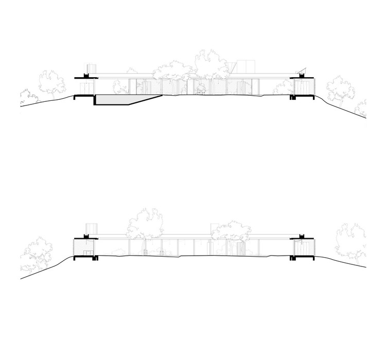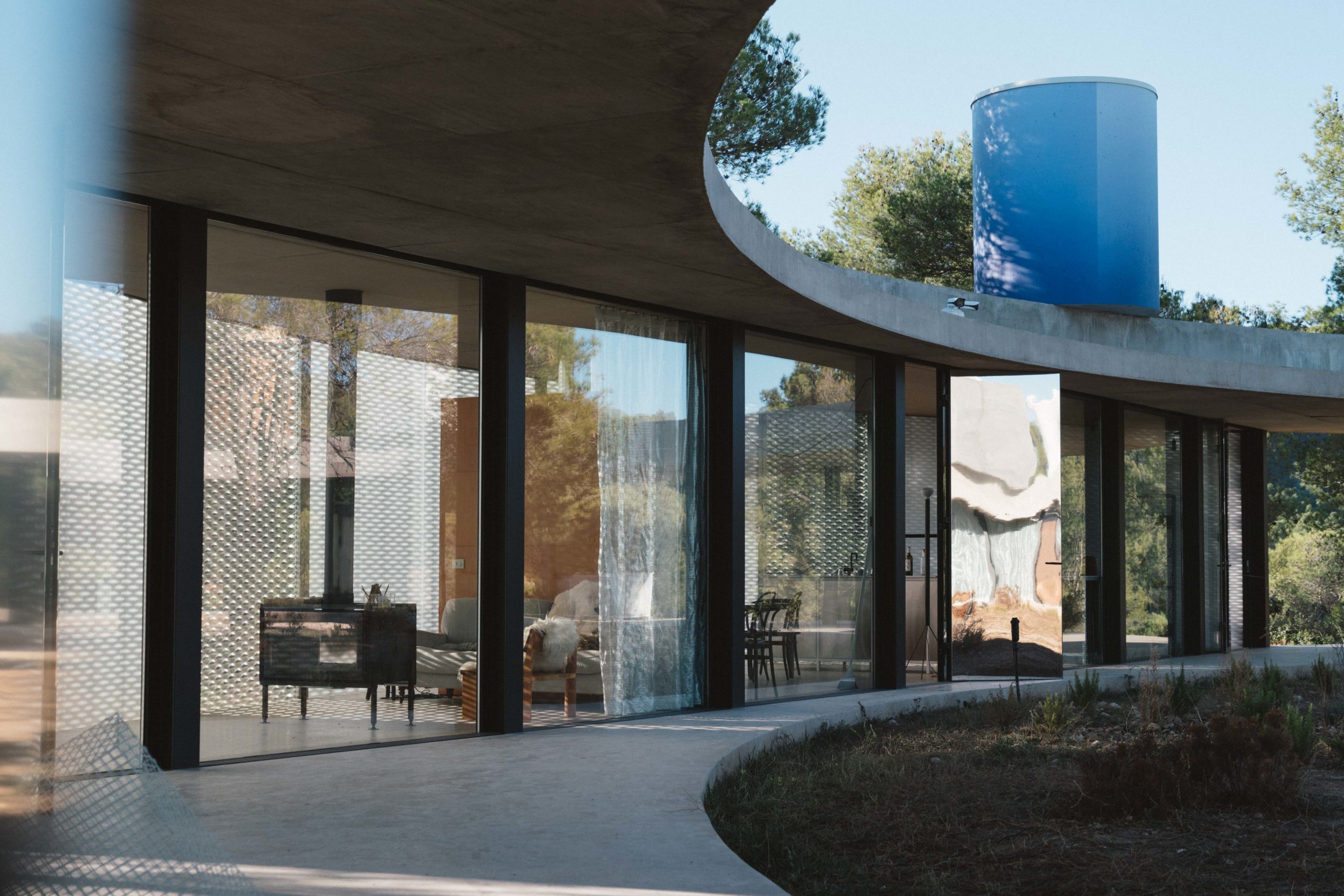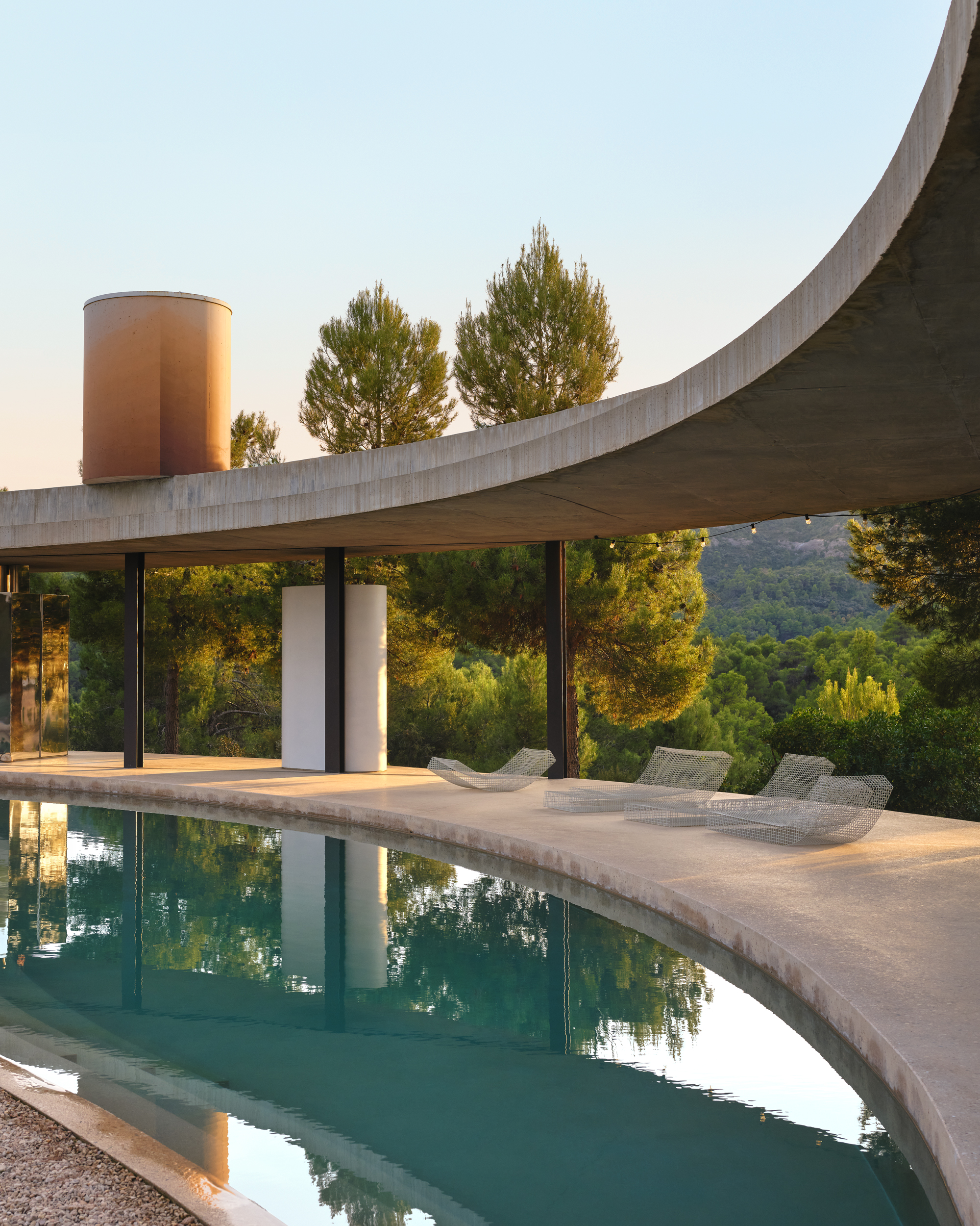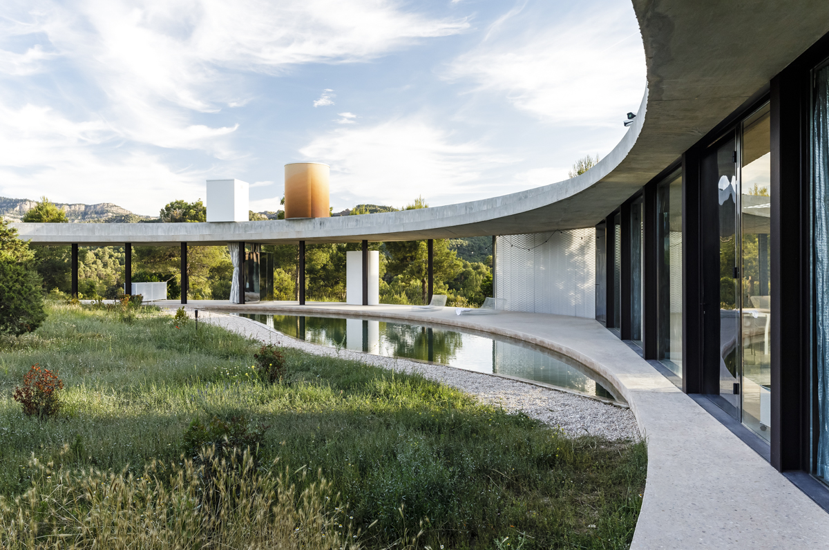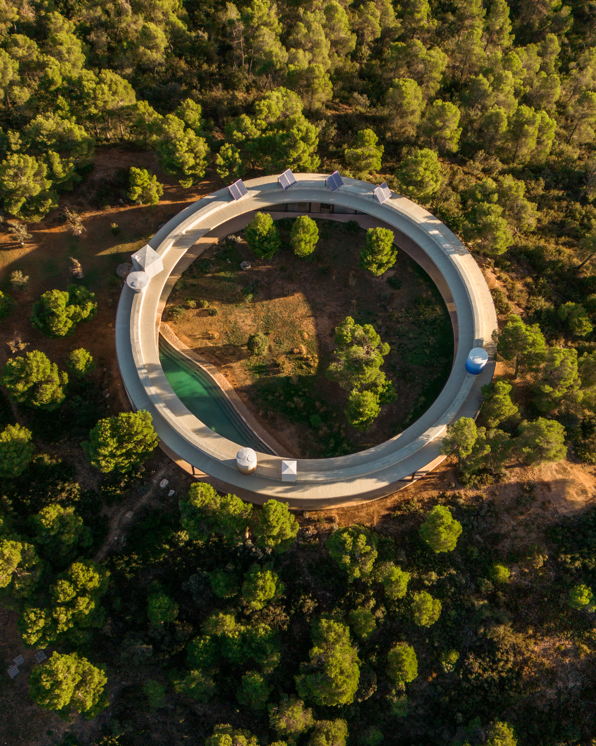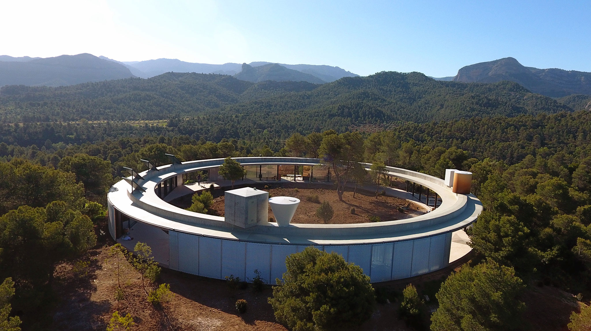 The Solo house is a country residence in a large untouched forest, in the mountainous region of Matarraña, two hours south of Barcelona. The house frames the top of a plateau, overlooking the surrounding forests and dramatical landscape. Since the scenery is so impressive, we felt architecture should be invisible, merely emphasising the natural qualities of the surroundings. A simple circular roof with a diameter of 45 meters underlines the qualities of both the plateau and its edge. The roof functions as a shelter, and forms the perimeter of the inhabited surface. It is supported by four straight rows of eight columns, which cut chords from the circular base shape. Only these four areas are inhabited, with variable levels of protection. Large stretches of curtain facade slide on the outer edge of the circle, allowing the living areas to fully open, and providing a maximum relationship between the dweller and the surrounding nature. Since the terrain is not connected to any services, the house will be completely self-dependent.