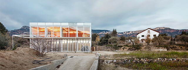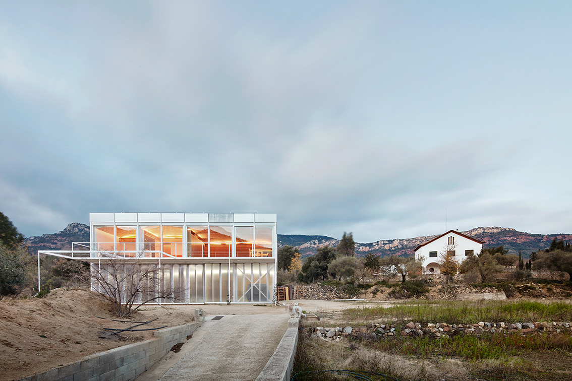 Para no contribuir al cambio climático, que está alterando y difuminando los ritmos estacionales de nuestras latitudes, desarrollamos una fisiología habitable de ciclo trimestral y diario, de uso sencillo y que permite variaciones complejas. Delimitamos un volumen compacto para proteger a los OE del fuerte viento de Mestral. El microclima local requiere de interiores con una gran inercia térmica en las semanas frías, y de una elevada capacidad de protección solar y ventilación en los días de calor. Podemos dar una respuesta más eficiente a estas necesidades opuestas construyendo tres casas en una? Las habitaciones en contacto con el suelo agrícola se envuelven con una lámina plegable de policarbonato, que capta la radiación solar en invierno, calentando el piso superior, y se transforma en una gran sombra en verano. En la planta primera los grandes planos de cristal calientan su interior en un día frío y soleado, y en verano las persianas, petición expresa de los OE, crean un gran contenedor de sombra, que refresca el hábitat de abajo. Además, incorporamos la cubierta y la terraza-pérgola como tercer hábitat para disfrutar del tiempo amable que años atrás asociábamos a la primavera y el otoño. Así la casa trasciende sus dos usos esquizofrénicos hacia múltiples ambientes según el día que hace y el estado de ánimo de sus habitantes.