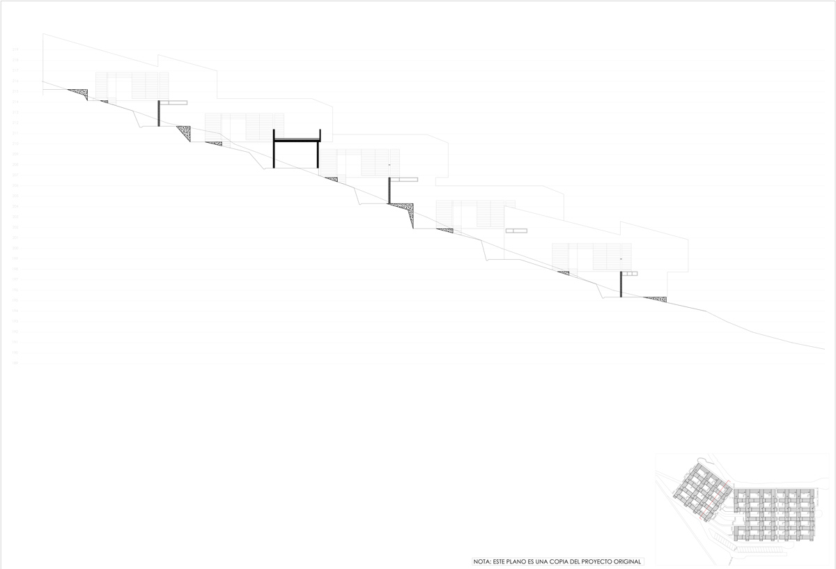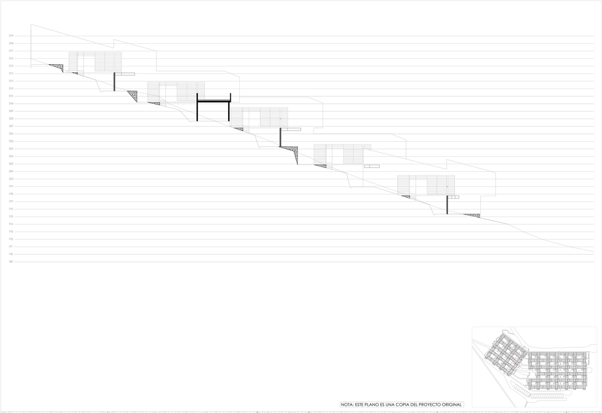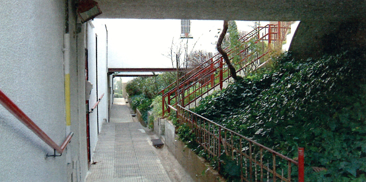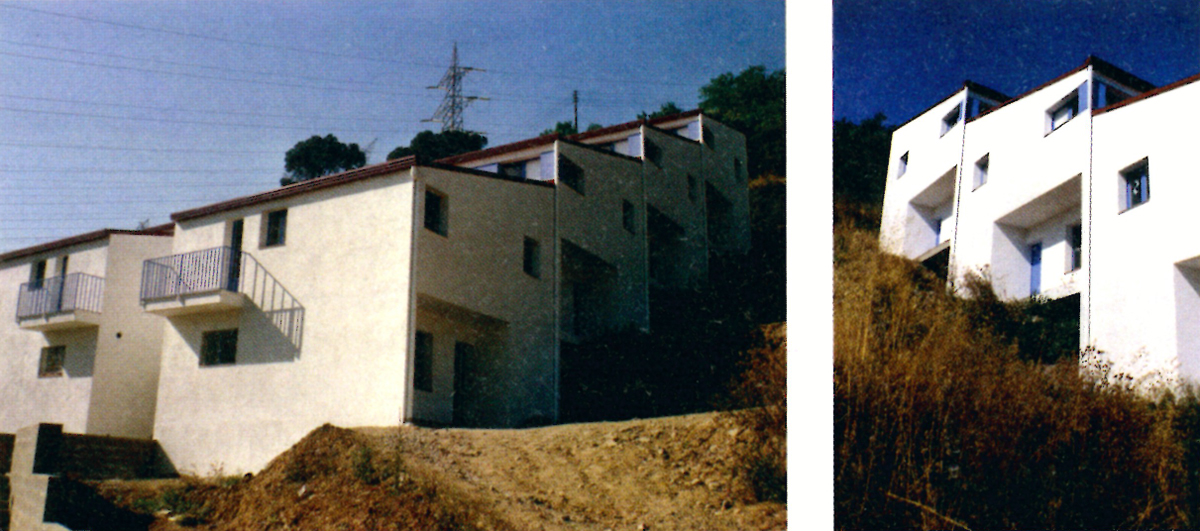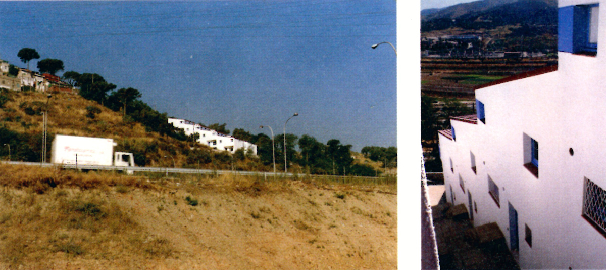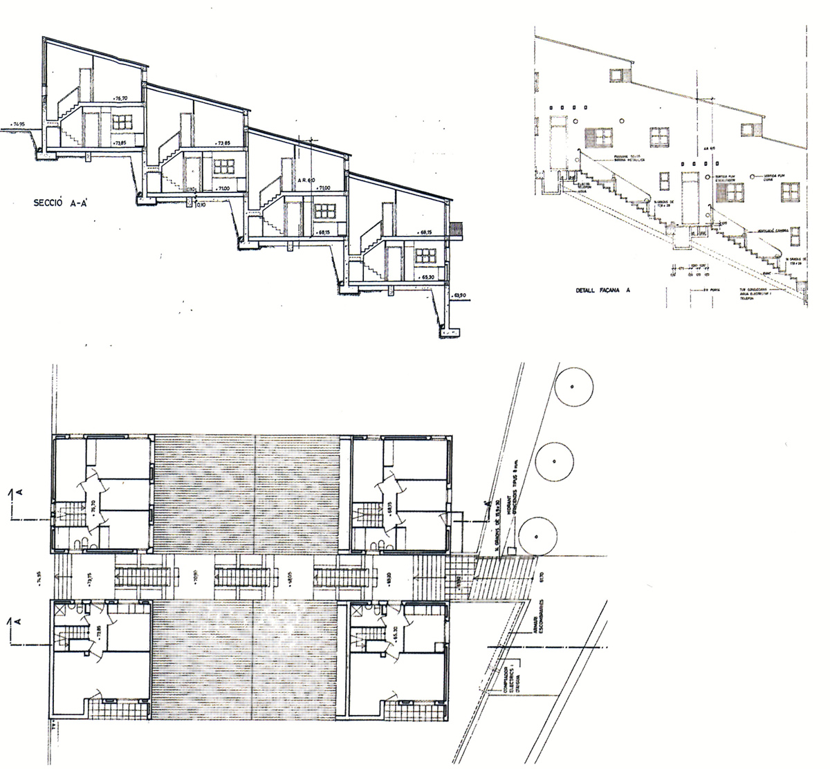 Sin embargo, paradójicamente, este ejemplo sí lo es. Construidas por el Patronato Municipal de la Vivienda de Barcelona y finalizadas en 1968, estas viviendas son en realidad un edificio, sólo que dispuesto sobre la ladera. En éste domina la regularidad y la repetición en lugar de lo pintoresco y lo singular. Pero la regularidad se ve matiza- da debido a la forma del terreno, tanto por la disposición general a modo de abanico —ya que ocupan un ángulo de la ladera que obliga a que los pasajes quiebren su linealidad— como por la aparición de escaleras para salvar la pendiente, que acaban formando una malla peculiar entre éstas, los pasajes y, por supuesto, las viviendas.