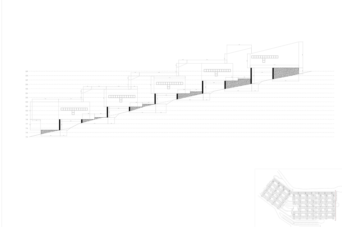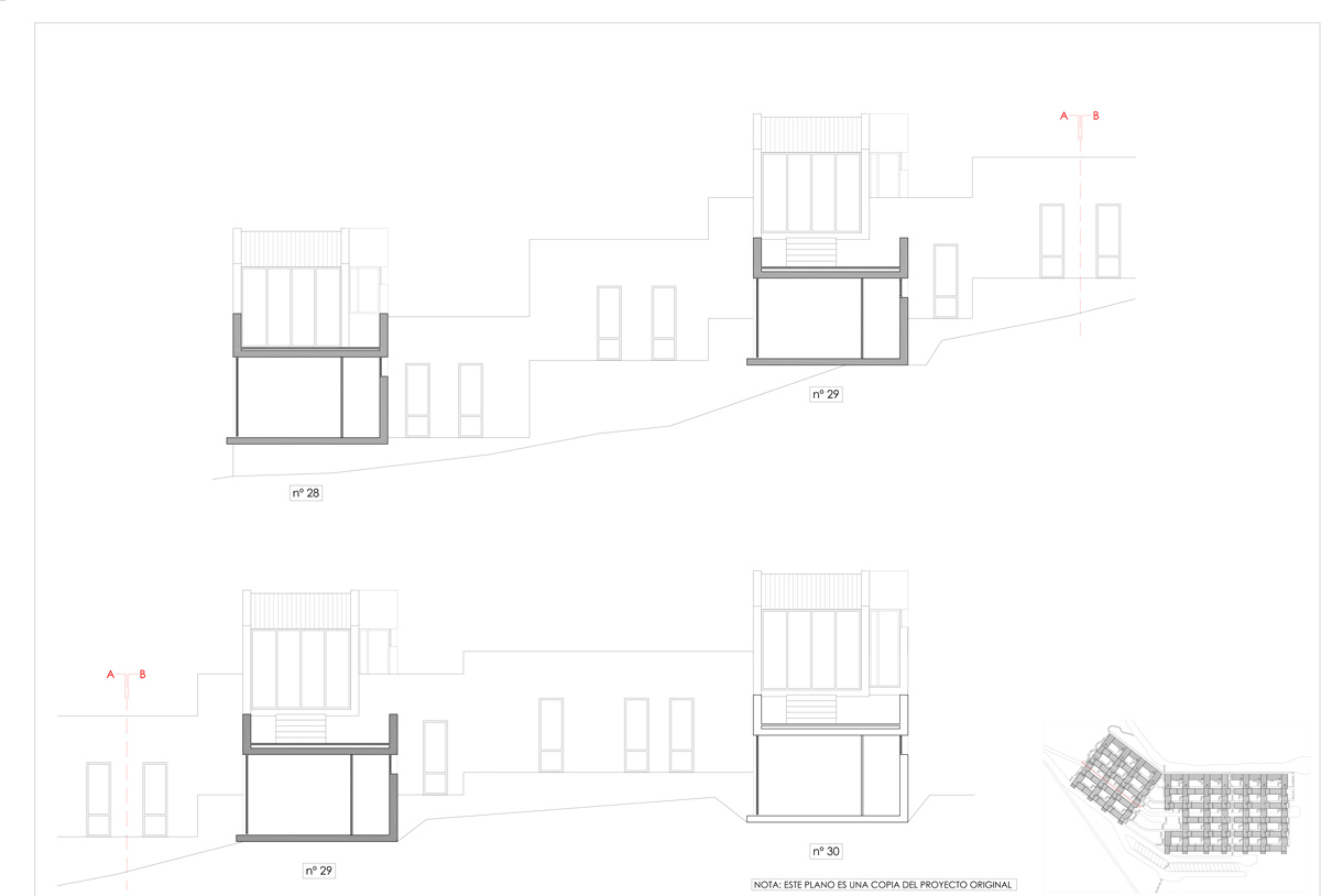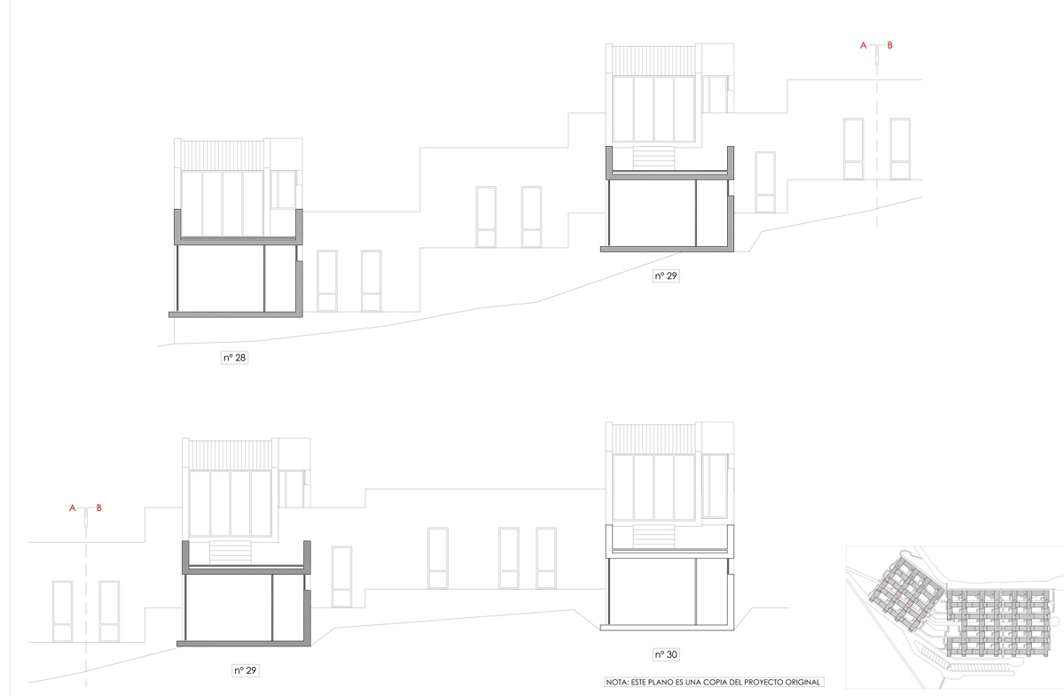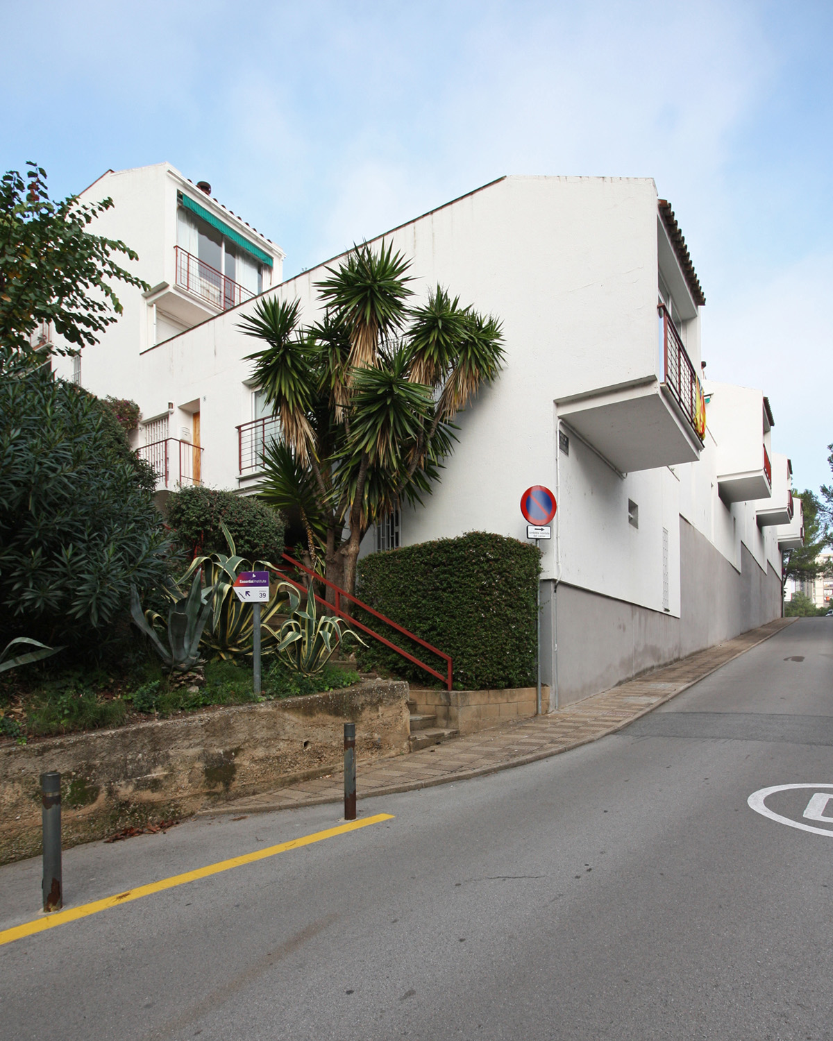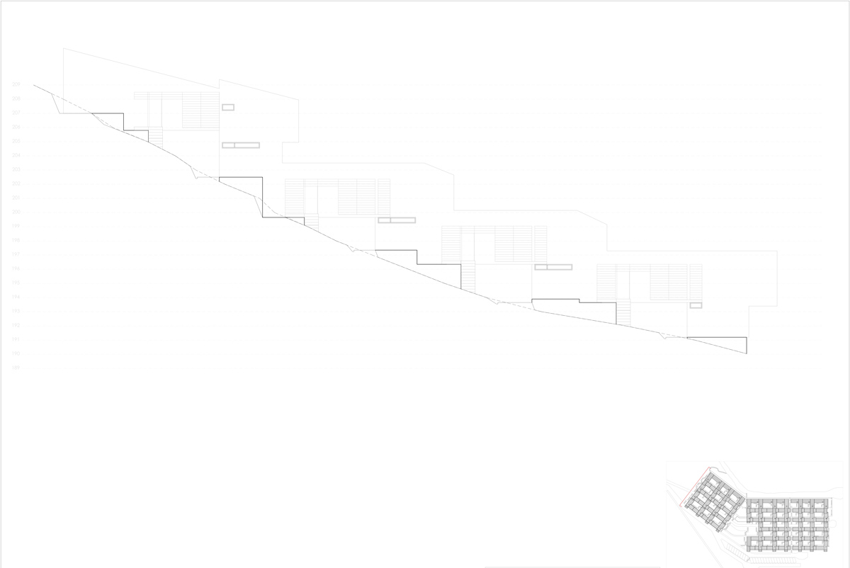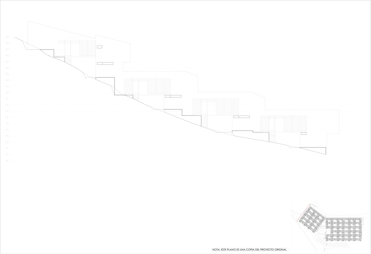 Sin embargo, paradójicamente, este ejemplo sí lo es. Construidas por el Patronato Municipal de la Vivienda de Barcelona y finalizadas en 1968, estas viviendas son en realidad un edificio, sólo que dispuesto sobre la ladera. En éste domina la regularidad y la repetición en lugar de lo pintoresco y lo singular. Pero la regularidad se ve matiza- da debido a la forma del terreno, tanto por la disposición general a modo de abanico —ya que ocupan un ángulo de la ladera que obliga a que los pasajes quiebren su linealidad— como por la aparición de escaleras para salvar la pendiente, que acaban formando una malla peculiar entre éstas, los pasajes y, por supuesto, las viviendas.