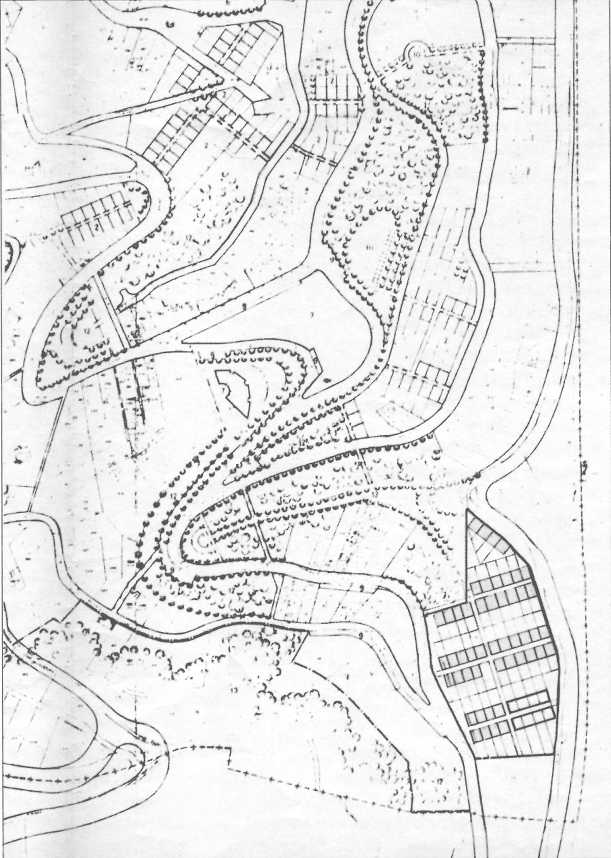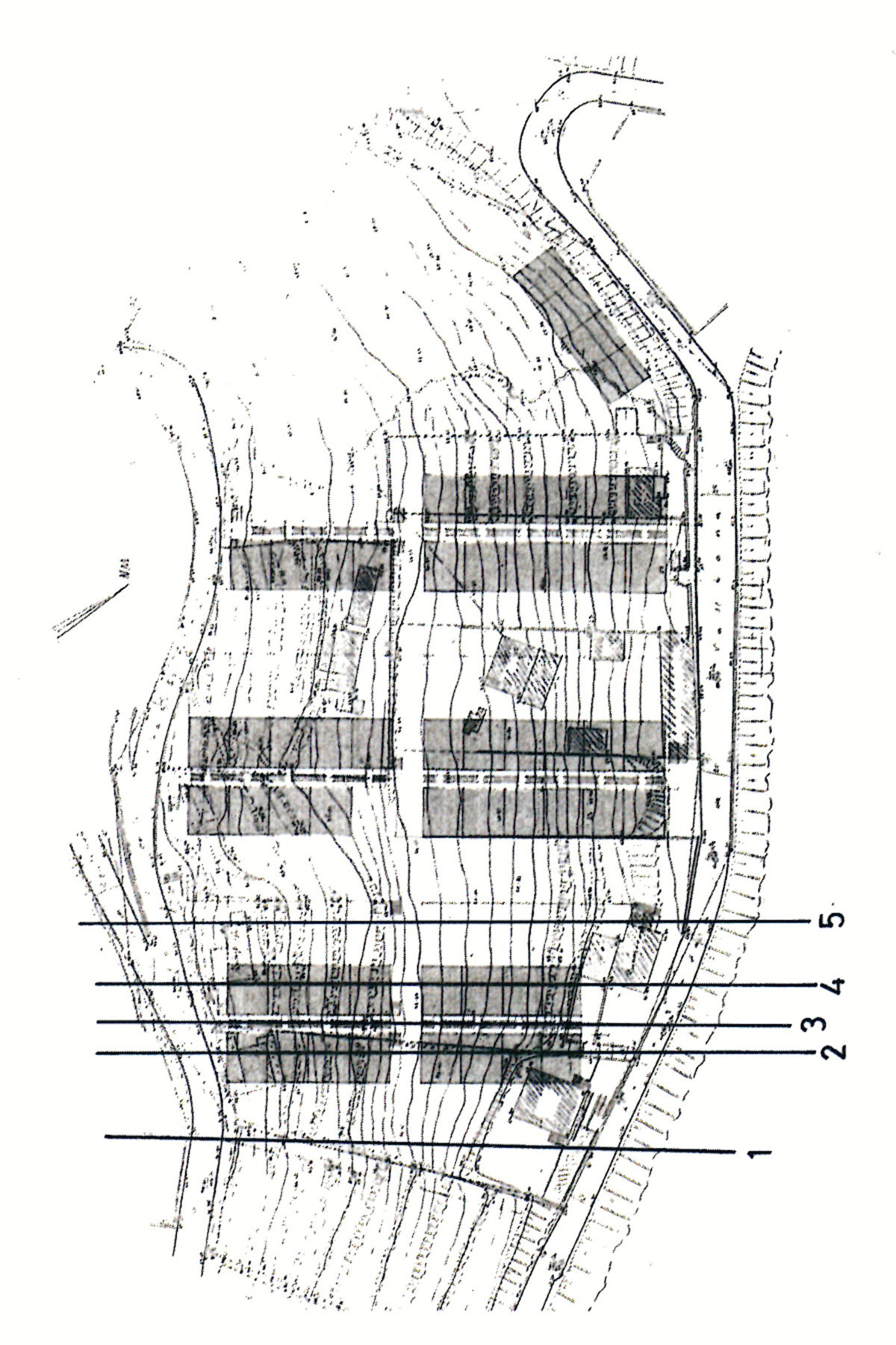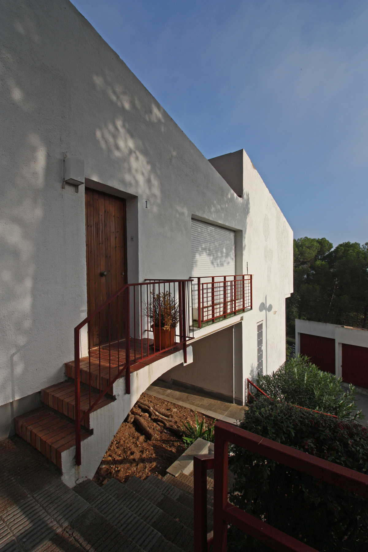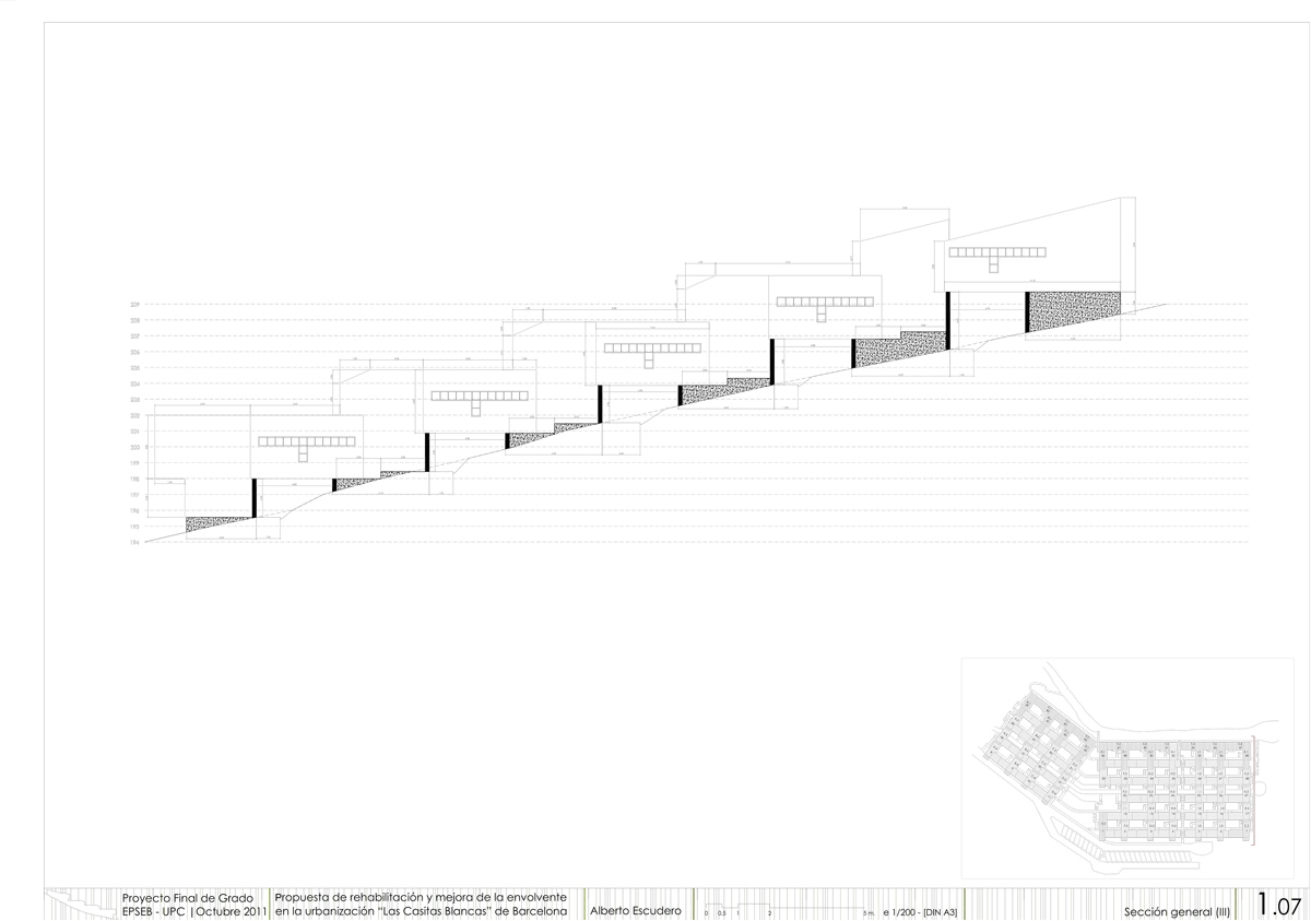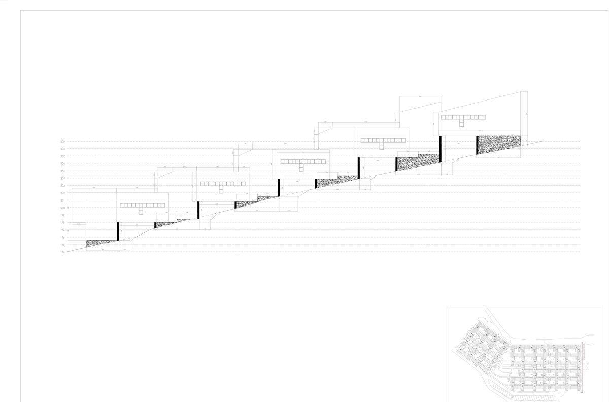 Sin embargo, paradójicamente, este ejemplo sí lo es. Construidas por el Patronato Municipal de la Vivienda de Barcelona y finalizadas en 1968, estas viviendas son en realidad un edificio, sólo que dispuesto sobre la ladera. En éste domina la regularidad y la repetición en lugar de lo pintoresco y lo singular. Pero la regularidad se ve matiza- da debido a la forma del terreno, tanto por la disposición general a modo de abanico —ya que ocupan un ángulo de la ladera que obliga a que los pasajes quiebren su linealidad— como por la aparición de escaleras para salvar la pendiente, que acaban formando una malla peculiar entre éstas, los pasajes y, por supuesto, las viviendas.