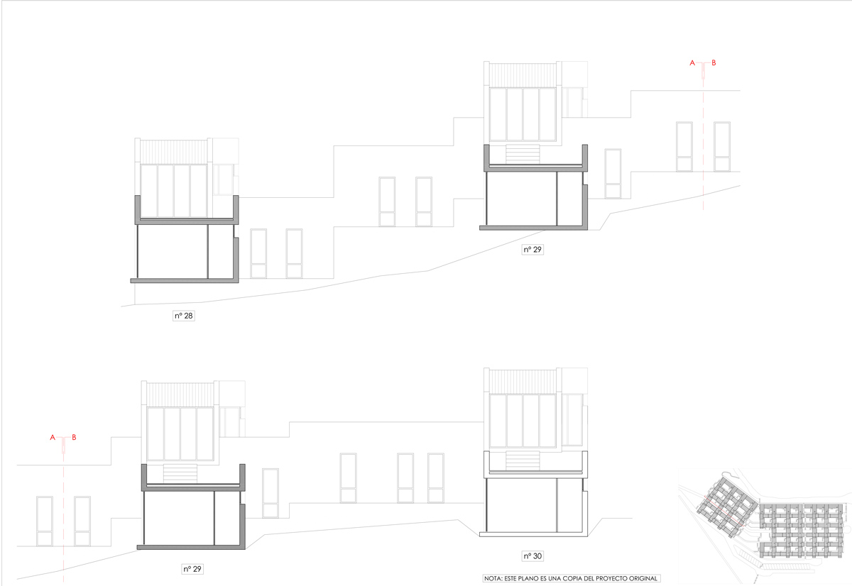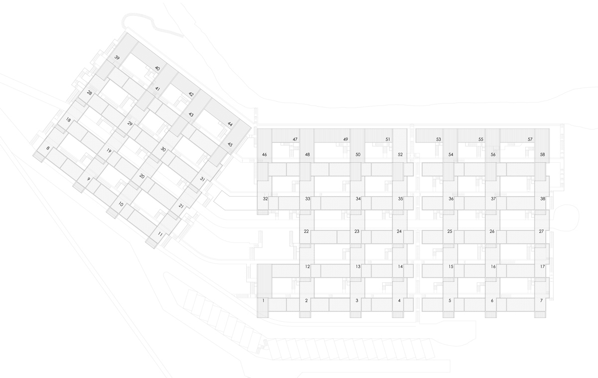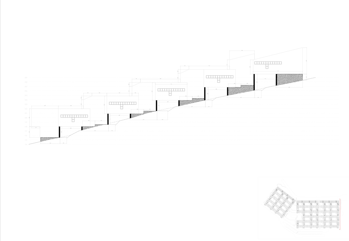 Pero probablemente la singularidad de esta agrupación estriba sobre todo en la impresión que producen los pasajes al discurrir debajo de las viviendas. Se forman así unos puentes que son esenciales para asimilar el conjunto a una peculiar urdimbre de escaleras, pasajes y casas. Si observamos el conjunto estrictamente desde el punto de vista de la distribución funcional de las viviendas, podemos describirlo como una agrupación de habitaciones paralela a los pasajes y una agrupación de cocinas y salas de estar perpendicular a la pendiente y, por tanto, paralela a las escaleras.