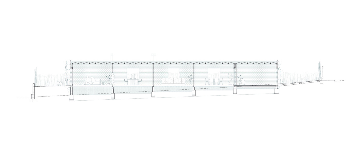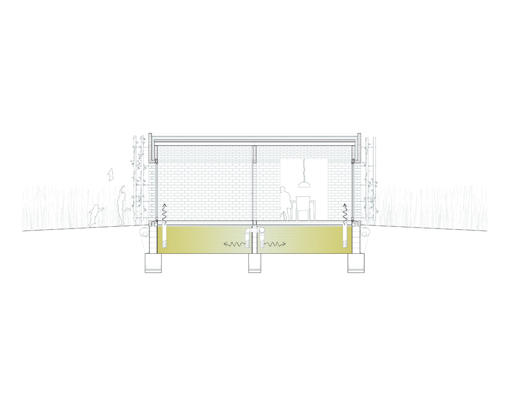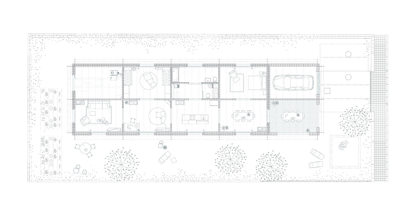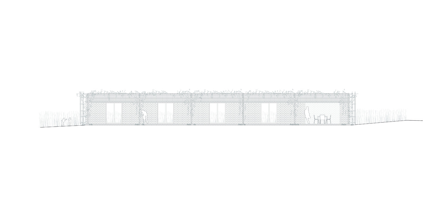 La protección solar reproduce la retícula interior en forma de pequeñas capillas vegetales de hoja caduca, creando un umbral estacionario que evitarà que el sol de verano sobrecaliente la casa y minimizará la presencia de la construcción que se irá fusionando con el jardín. La casa y el jardín querrían ser una misma cosa. Vivir utilizando toda la parcela.