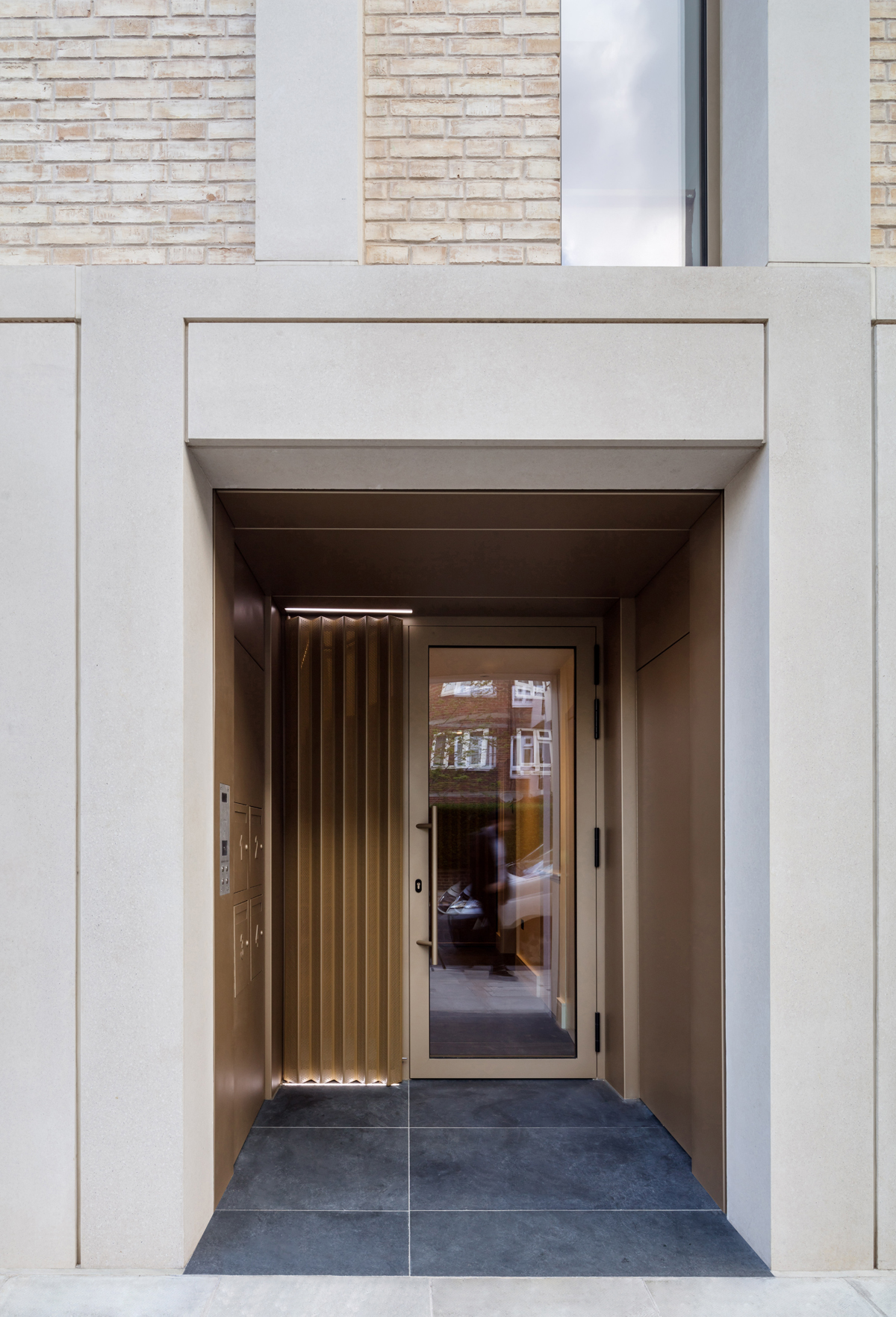 Both the sliding and tilt&turn windows were installed behind the stone and brick-work panels, with bracket fixings cast in the form work. This enabled the window frames to be partly concealed thus creating elegant slimline proportions from the outside. Similarly, the balustrade fixings were all cast on the stone or brick reveals, ensuring simple and crisp details and preventing any drilling on site thus reducing noise pollution for neighbours during the build process.