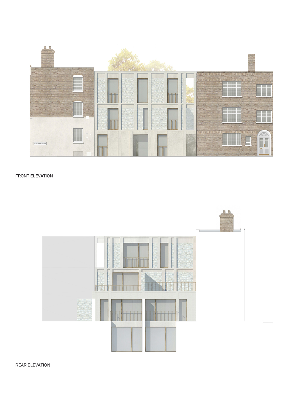 Compositionally, the façade reinterprets the townhouses of adjacent Rawlings Street, with a precast stone base providing a distinction between the ground floor and upper storeys, which borrow from the same language of brick walls punctured by stone framed openings. The expressed precast framing, vertical window proportions and their asymmetrical relationship are designed to draw from the surrounding context whilst providing a façade that is visually engaging. Window openings and the precast framing are accentuated with deep reveals whilst visually connecting with skylights or the sky beyond. The scheme maintains a gap with the neighbouring building that is prominent in the rest of the streetscape.