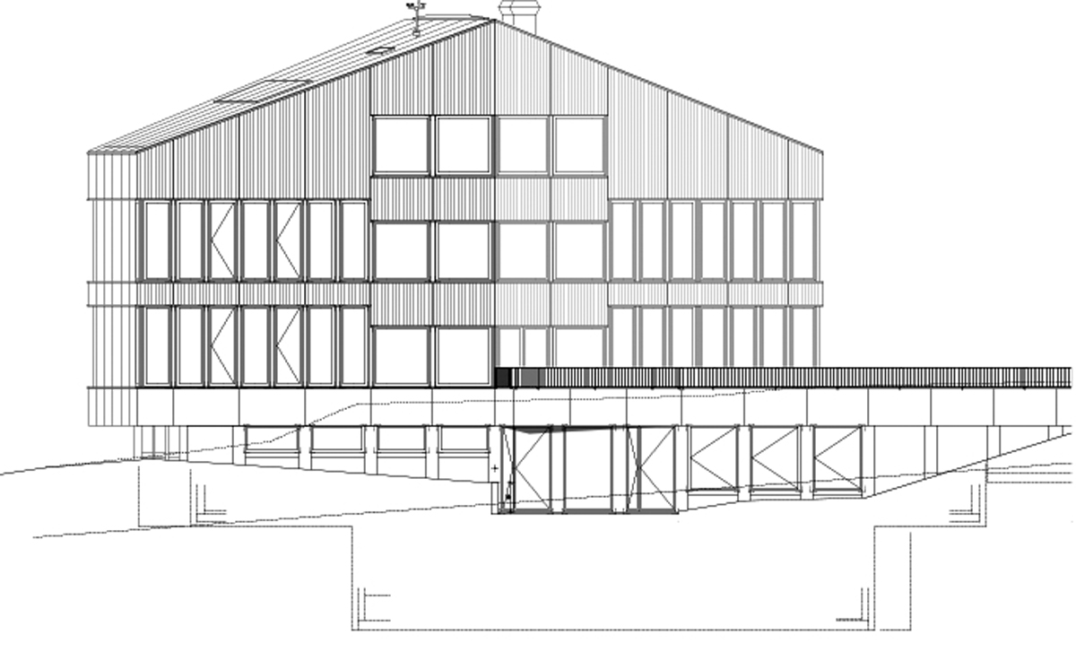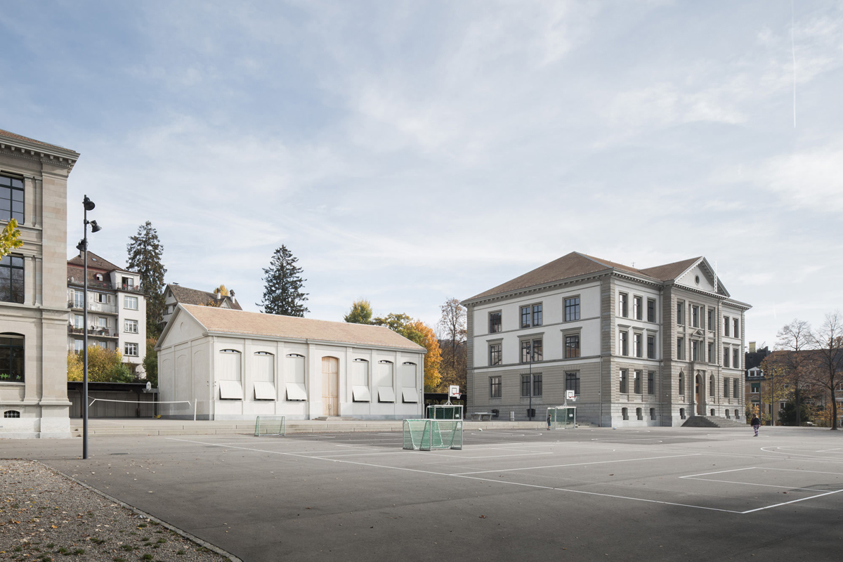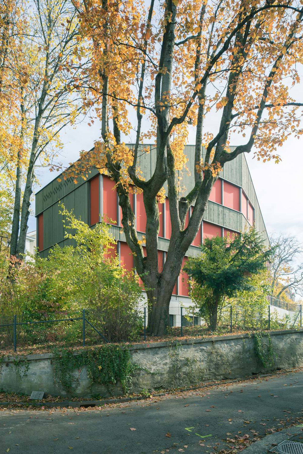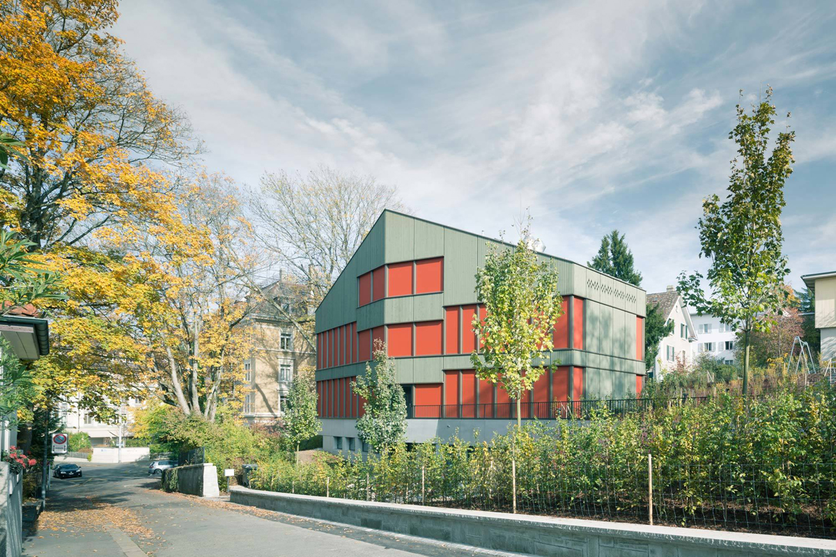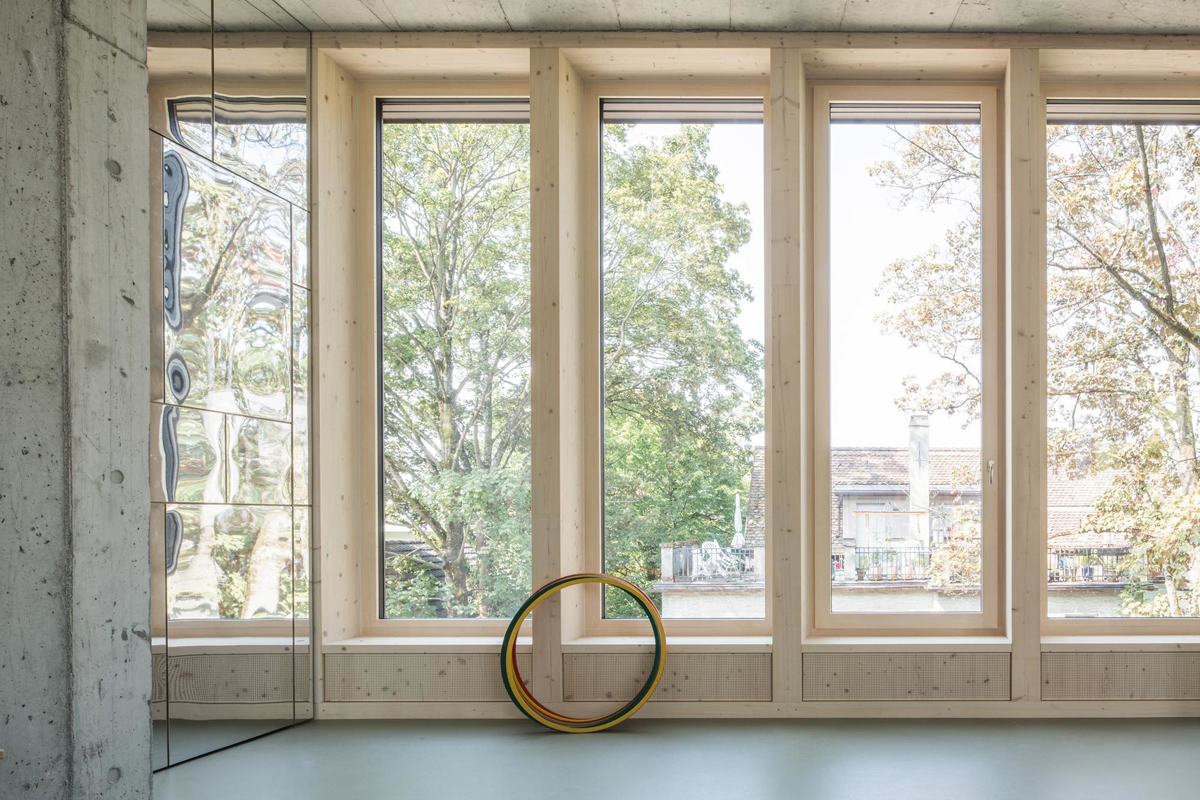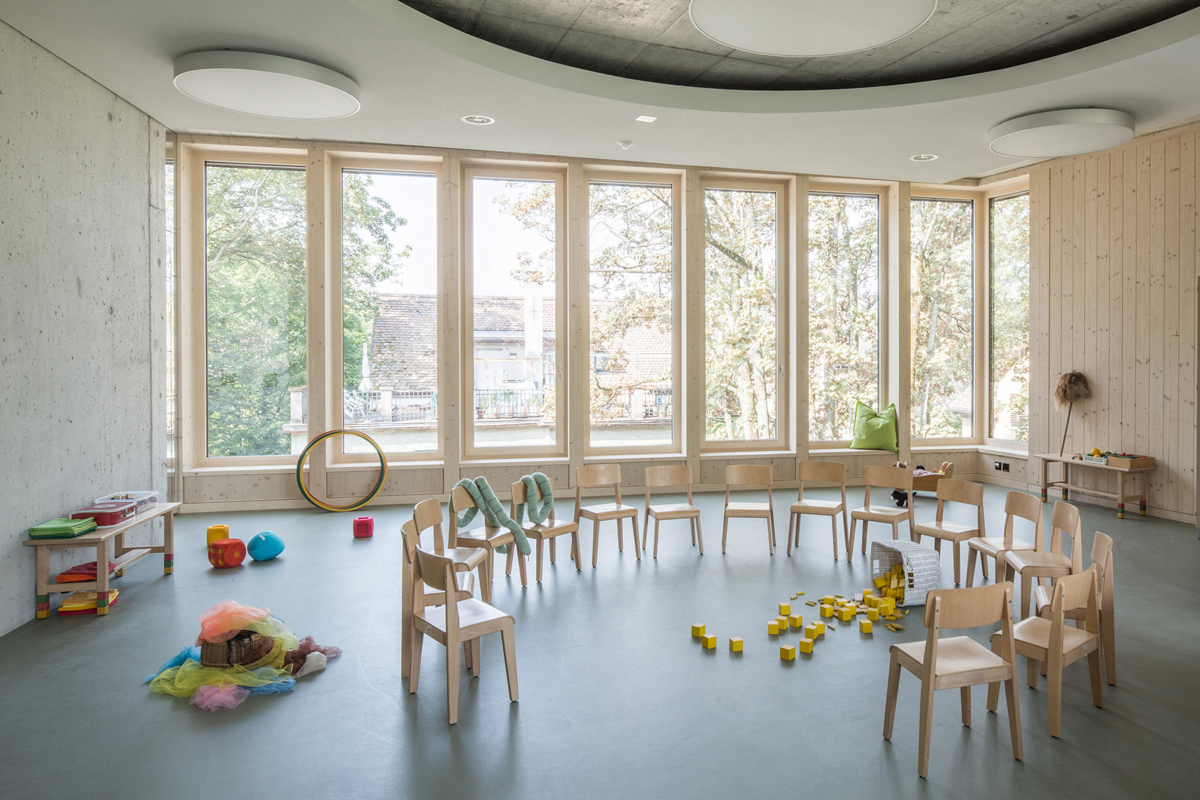 On two sides of the access core, in projectiles above the massive reinforced concrete pedestal, there is a stringent wooden branch, in which the group rooms are embedded. The pavilion-type timber construction looks for its references in the light attachments and structures in the environment, e.g. in the existing Giacometti kindergarten. The hybrid construction method is to produce the optimum from the respective material processing: Fire and sound insulation are solved in concrete construction, the timber construction allows a high insulation value and prefabricated rapid assembly of the facade.