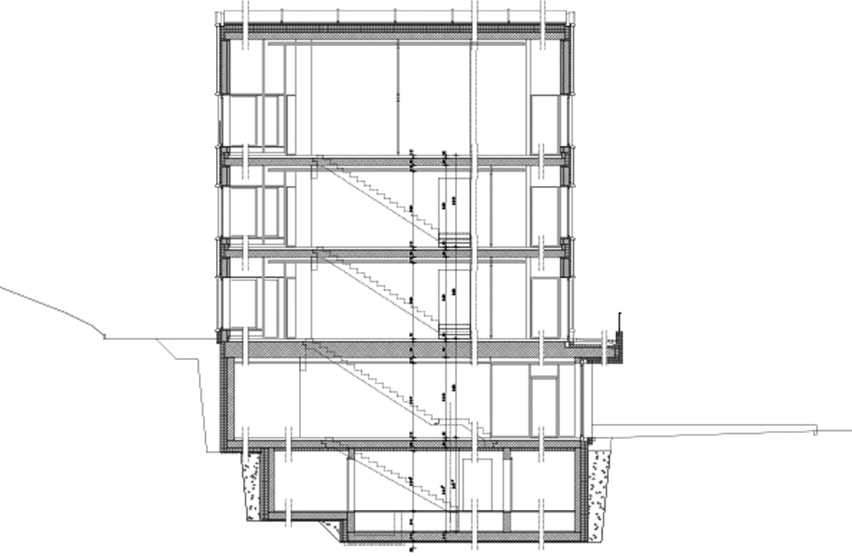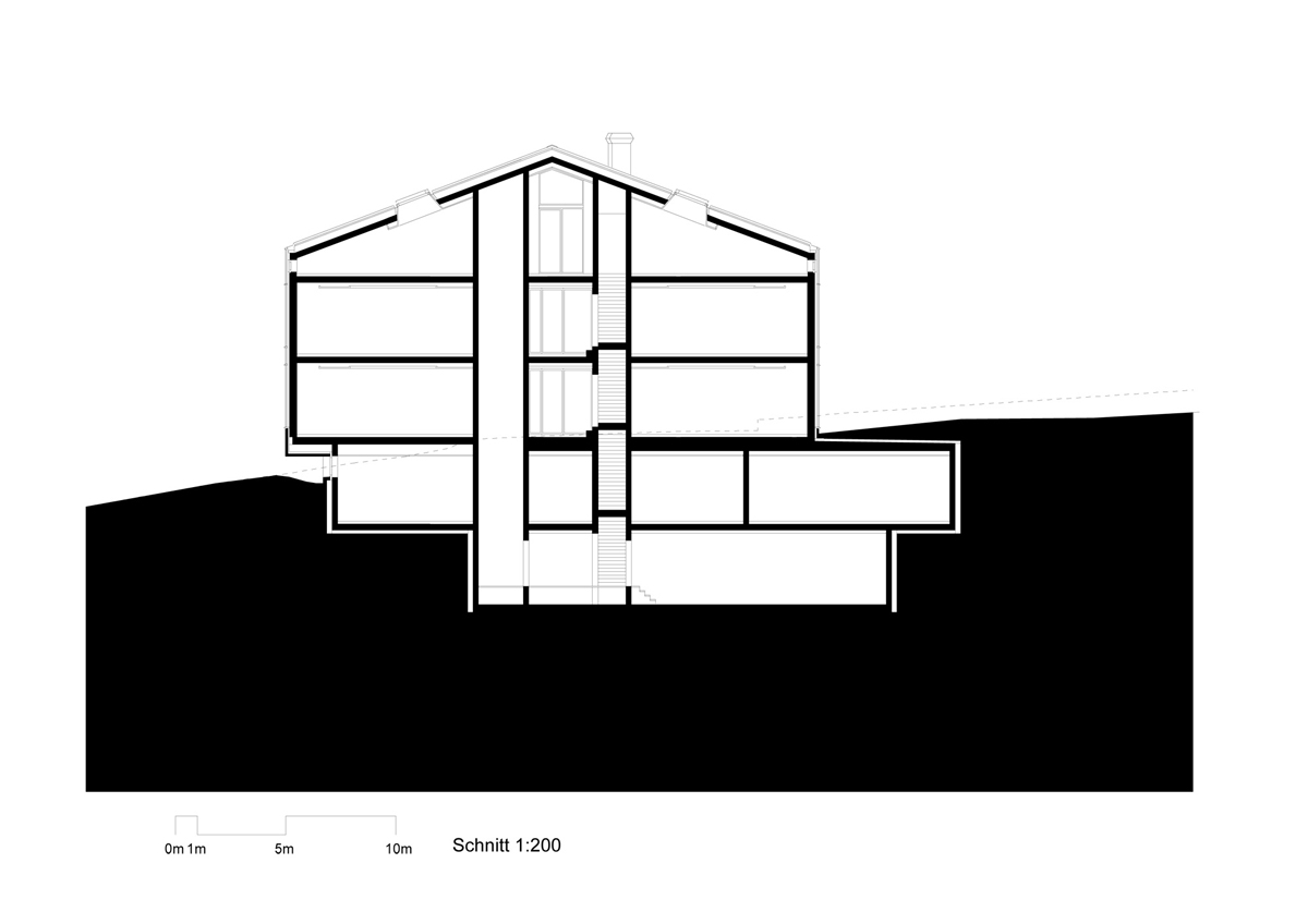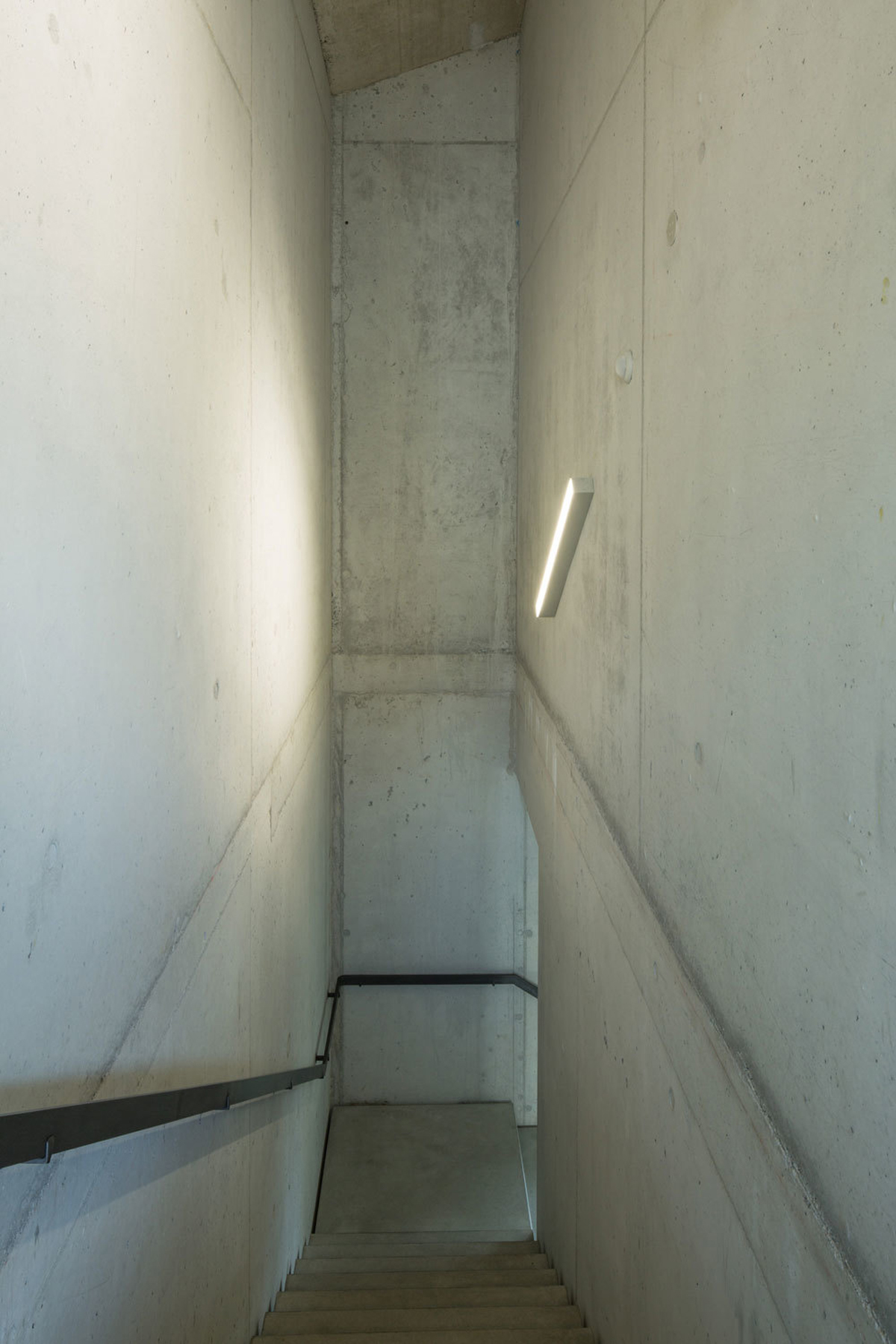 The building can be understood as part of the garden. A pedestal – common theme in the district – catches the slope. Its entrance is about one meter above the beginning of Fehrenstrasse. A concrete core drills into the terrain and creates a two-sided open access hall on each floor. These halls become the most important meeting places of the building, they serve as a reference point for all movements.