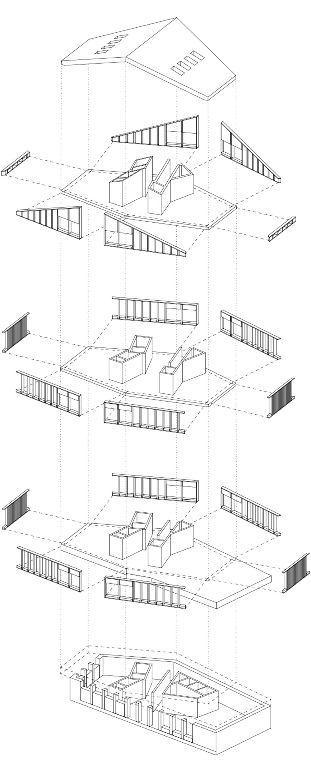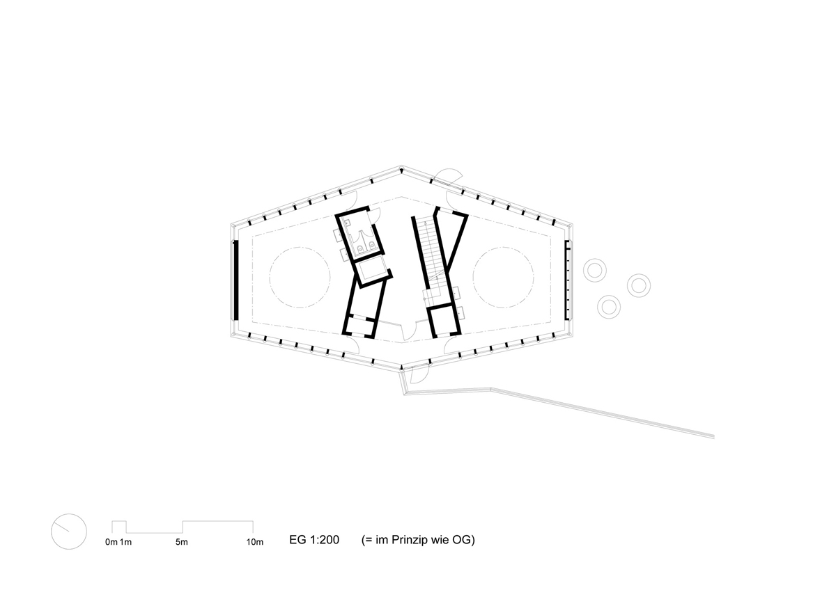 The hexagonal construction volume and its sloping roof shape follow the construction-law rules of height and distance distances. Due to the extraordinary ground plan shape, a maximum possible interior space is created with the smallest possible external appearance.