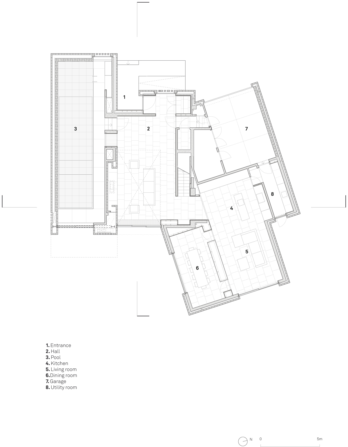 The large central hall becomes the determining element in the formal and spatial composition. It defines the centrepiece of a radical composition of brick masses relating in scale and grain to the neighbouring houses and urban condition. The hall also simultaneously reinforces a hierarchy of rooms within the house according to patterns of living: open-plan, fluid space on the ground floor and more conventional cellular rooms on the upper levels.