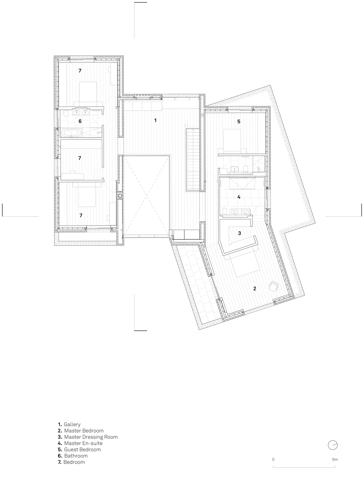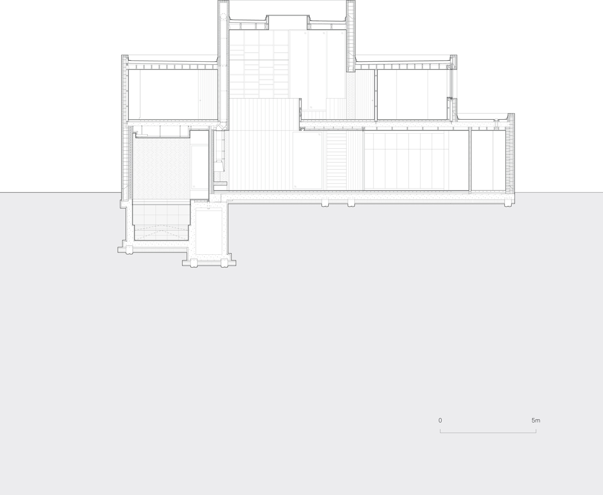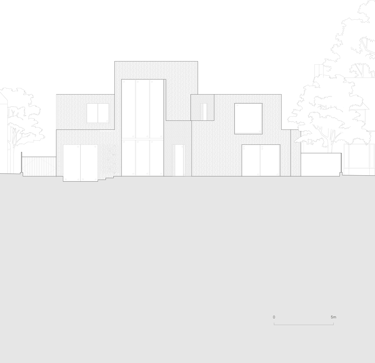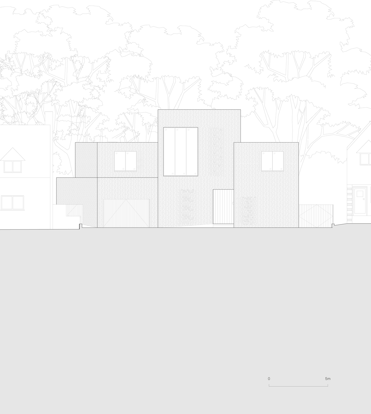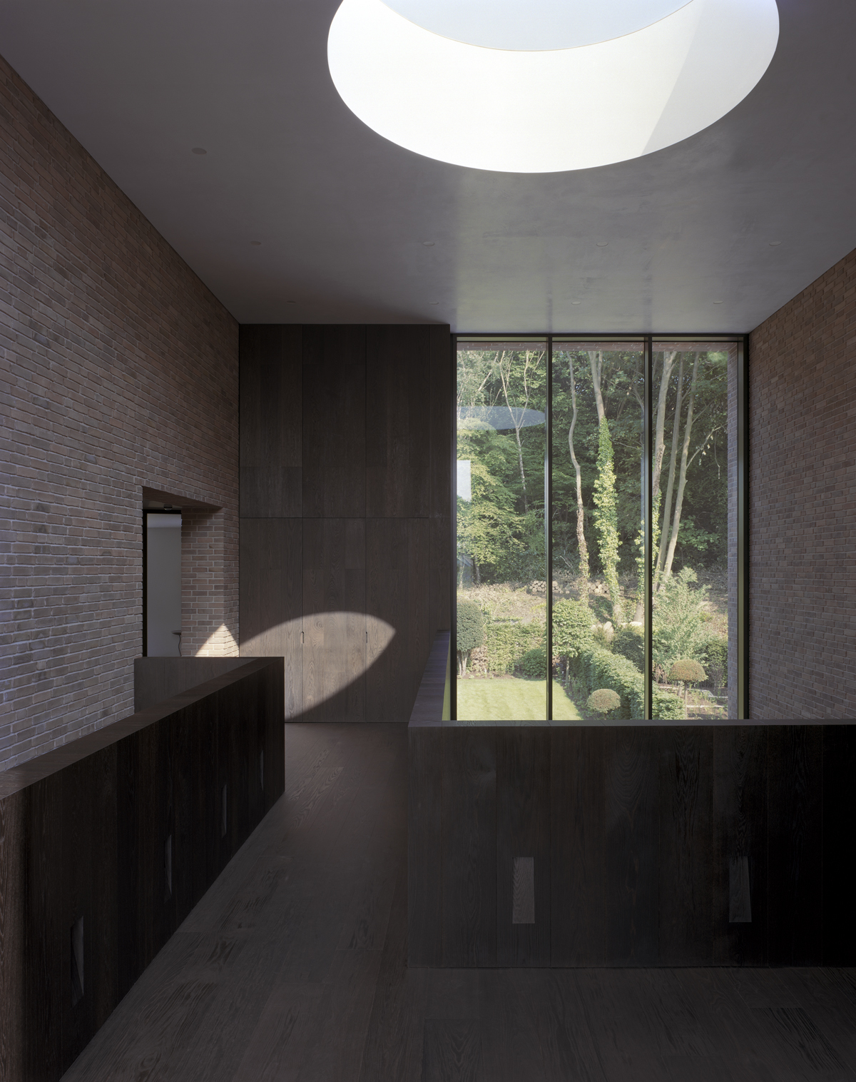 A clear language of public and private realms is defined in the elevations of the house. The treatment of thresholds between interior and exterior space varies greatly in scale and proportion according to each room’s physical and visual connection to the street, garden and Highgate Wood beyond.