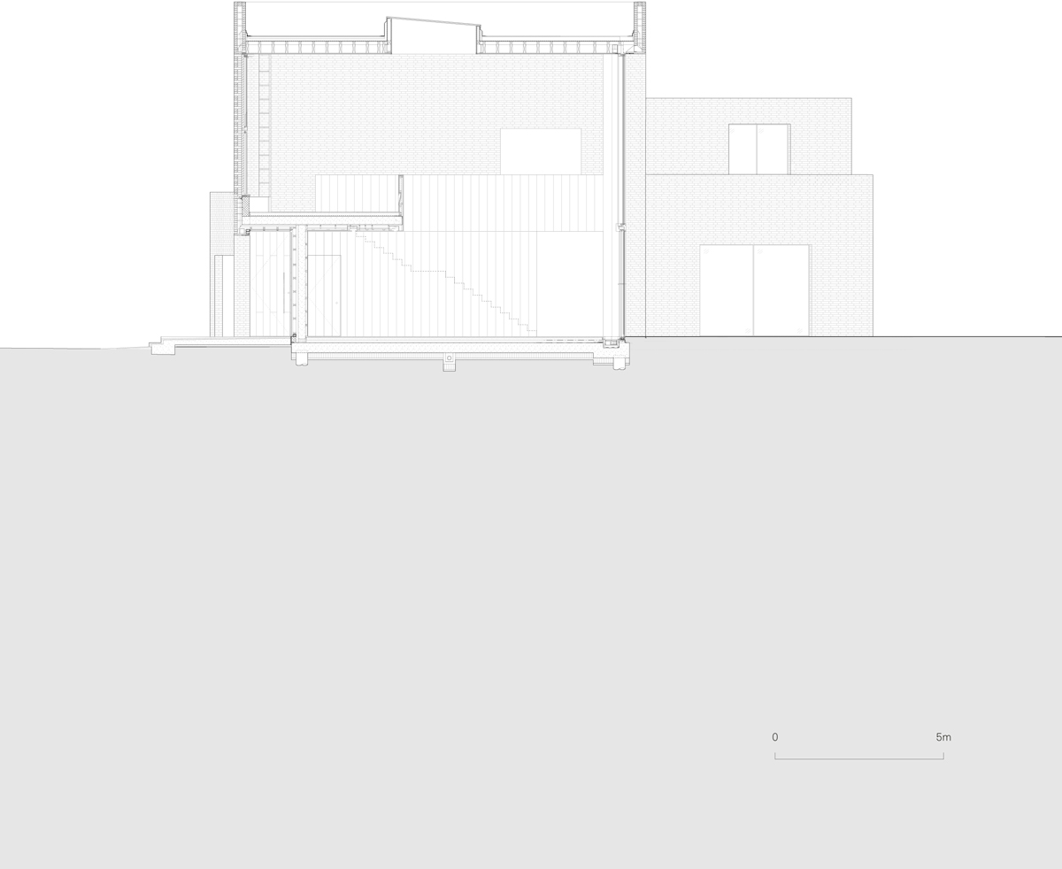 Brick provides contextual coherence with the surrounding detached houses of the North London suburb. Whilst the treatment of the house is manifestly abstract, covering all surfaces inside and out, it retains associations of traditional crafting embedded in the eclectic domestic architecture of the neighbourhood.