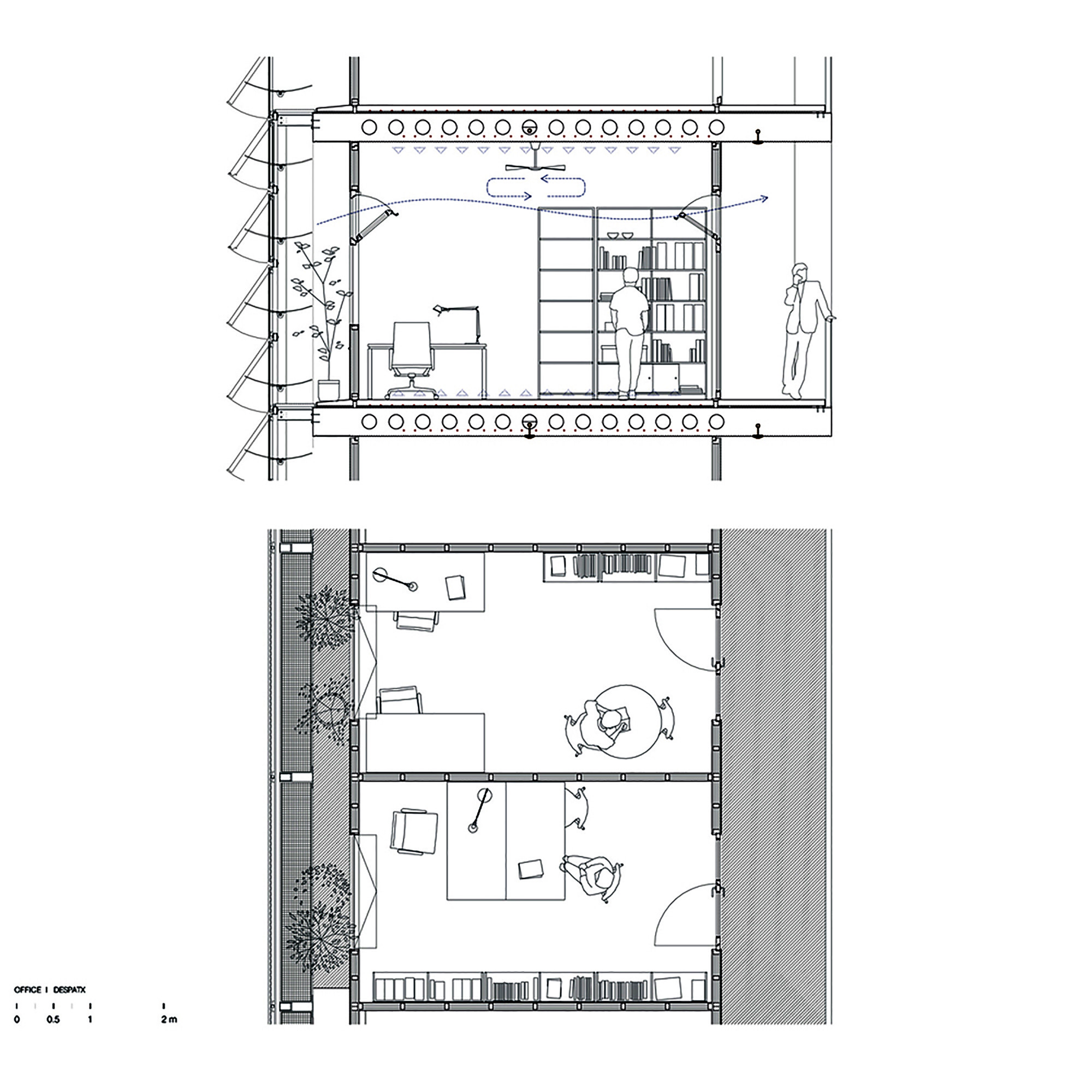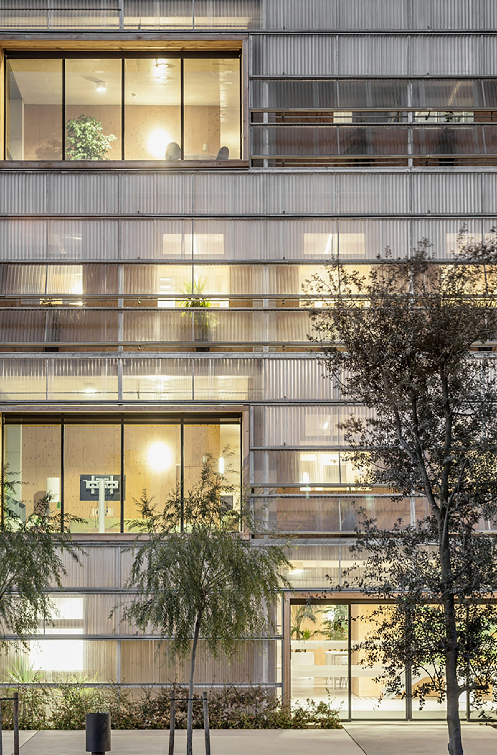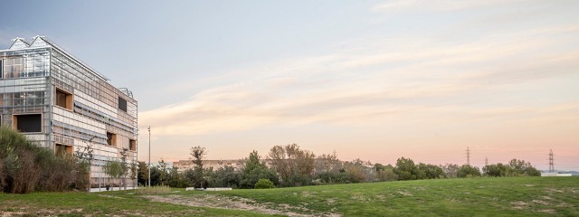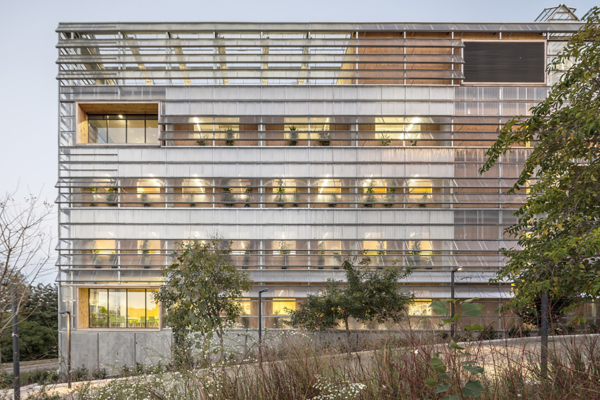 La estructura de hormigón está envuelta y protegida por una piel exterior bioclimática de bajo coste construida a partir de sistemas industrializados de invernadero agrícola que, abriéndose y cerrándose automáticamente, regulan la captación solar y la ventilación, consiguiendo mejorar la temperatura interior de manera totalmente natural y garantizando un confort base en los espacios intermedios y de circulación.