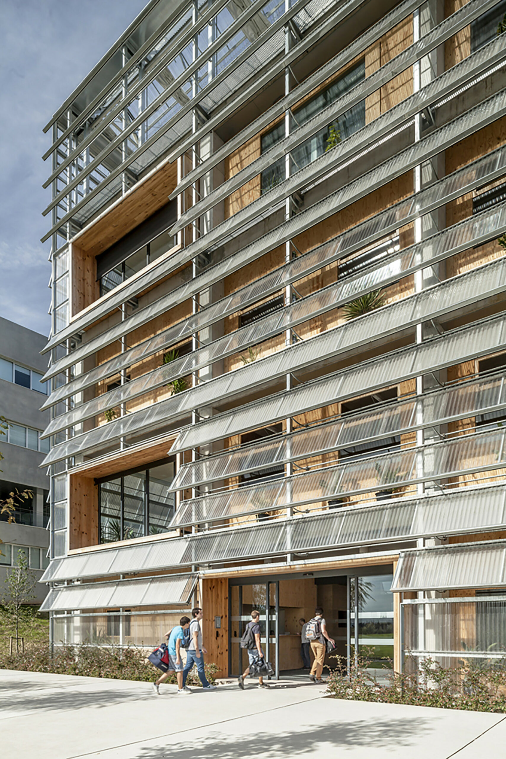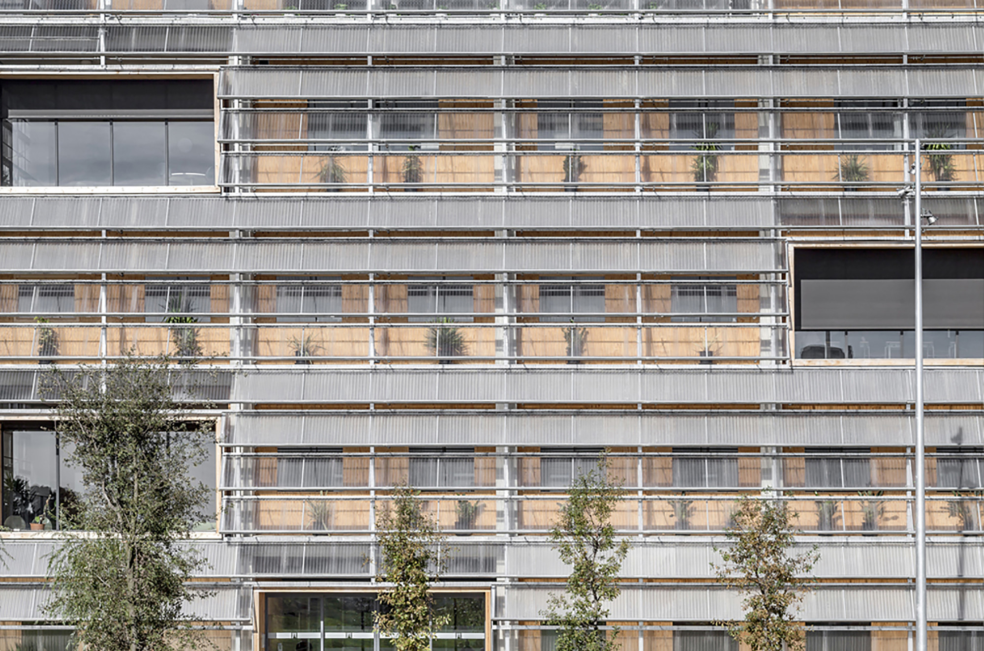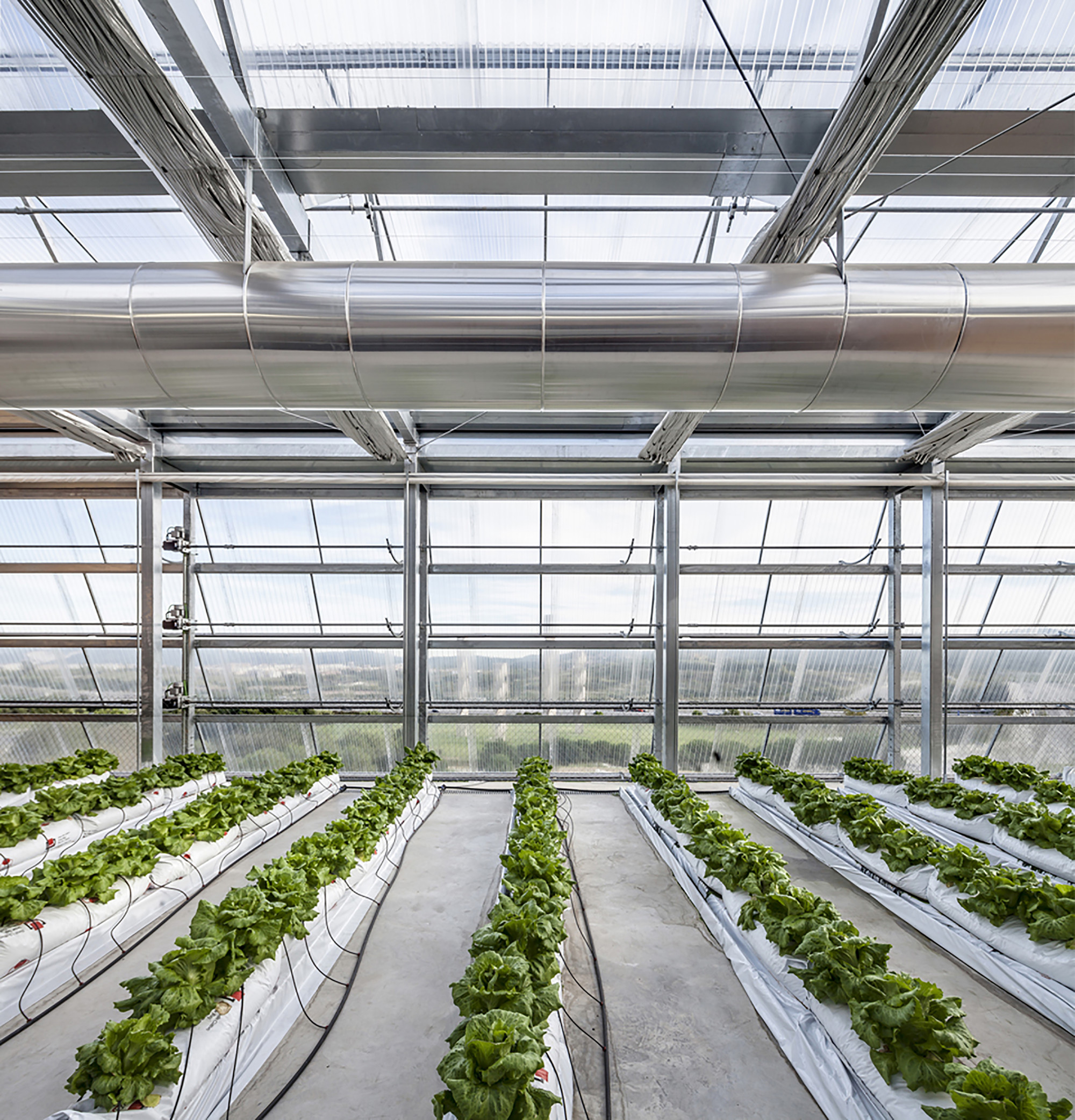 La estructura de hormigón está envuelta y protegida por una piel exterior bioclimática de bajo coste construida a partir de sistemas industrializados de invernadero agrícola que, abriéndose y cerrándose automáticamente, regulan la captación solar y la ventilación, consiguiendo mejorar la temperatura interior de manera totalmente natural y garantizando un confort base en los espacios intermedios y de circulación.